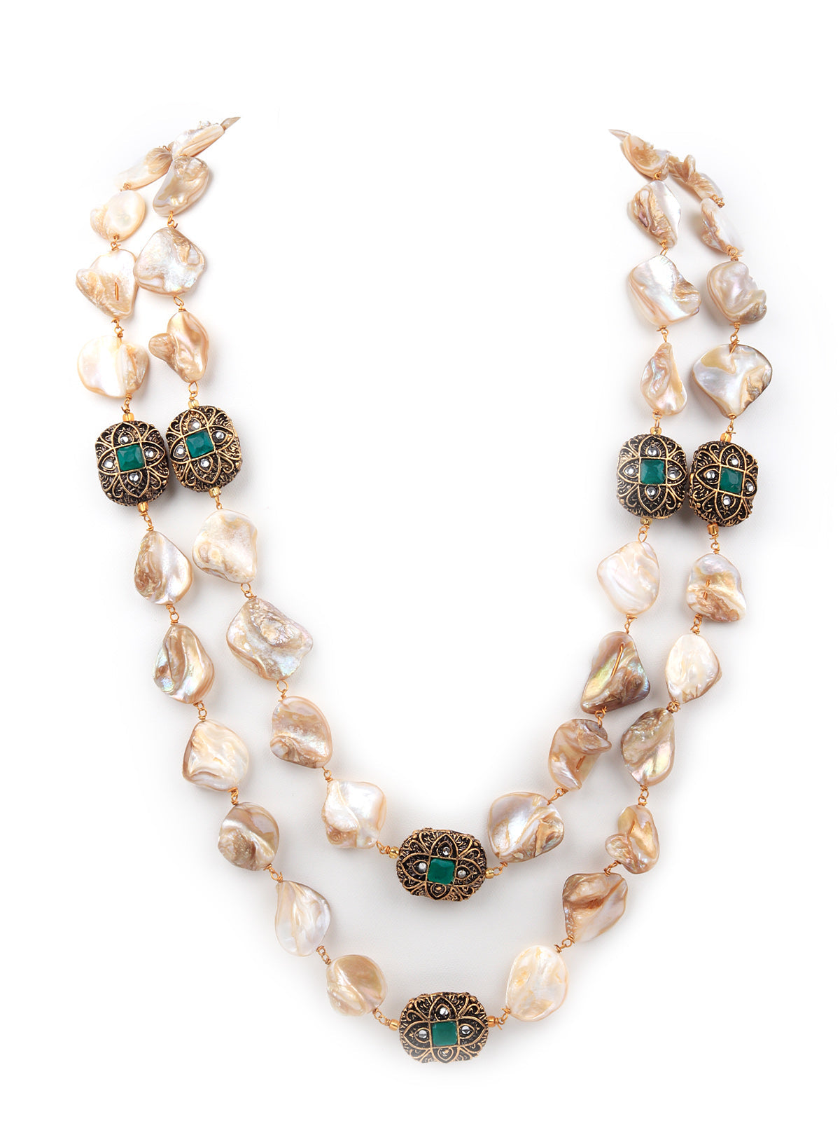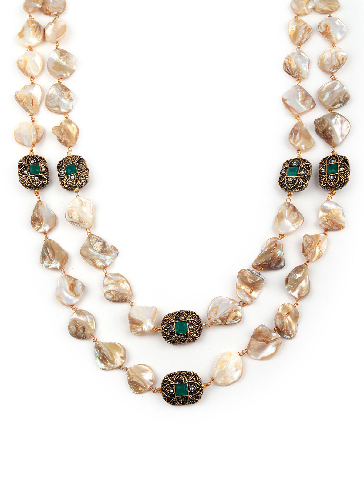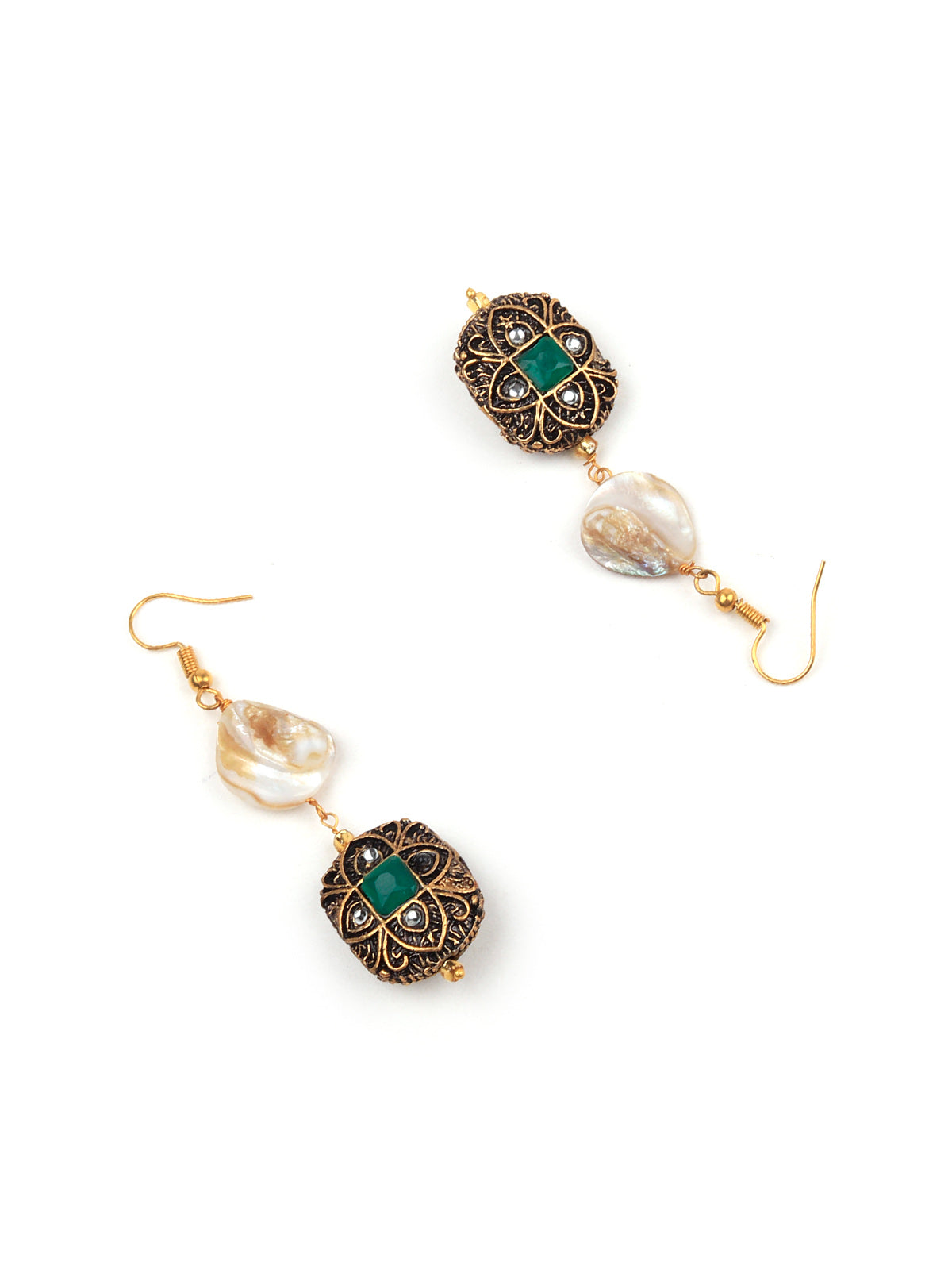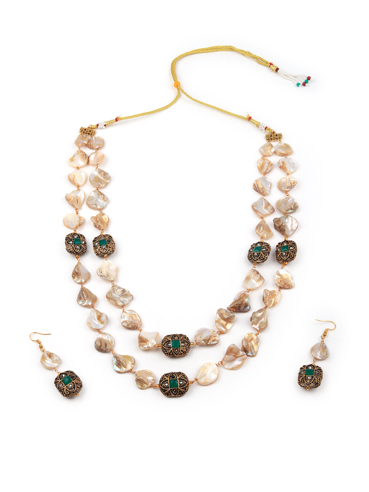 This gorgeous set of neck piece with dangling earrings is a great accompaniment to your wedding or party outfit. The necklace has Kundan and beads on it. The collection and setting of faux stones lend Victorian grandeur to this piece. This is must have in your collection.