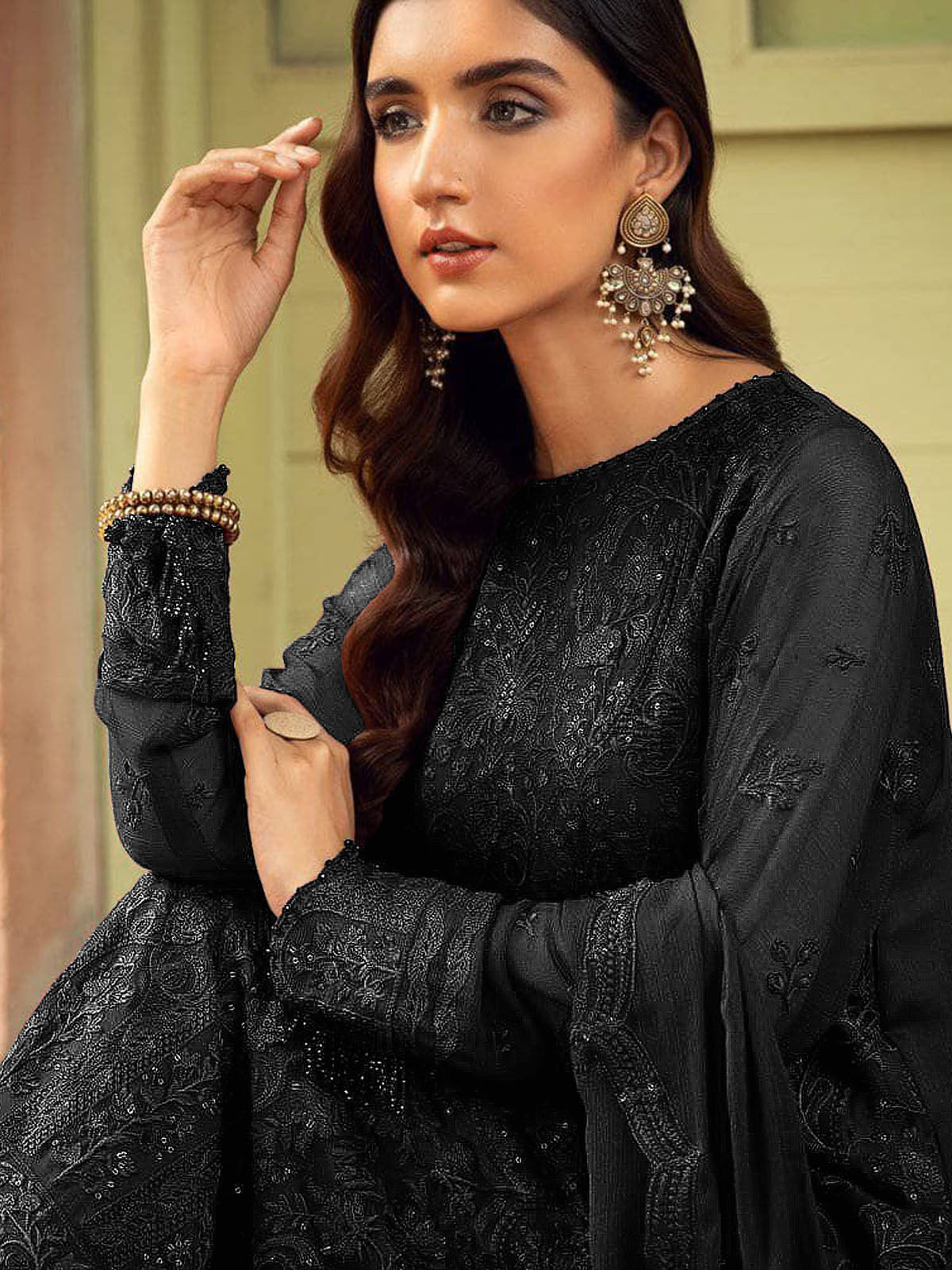 Real magnificence comes out of your dressing design with this Black colored Straight Salwar Suit. this Georgette suit is beautifully adorned with floral embroidery work with multi work personified as shown. this round neck full sleeve Straight Salwar Suit comes along with santoon bottom and inner with embroidered soft net dupatta makes it appear more adorning. women can buy this suit to wear for their upcoming festivals, homely functions, parties, kitties, weekend get together.