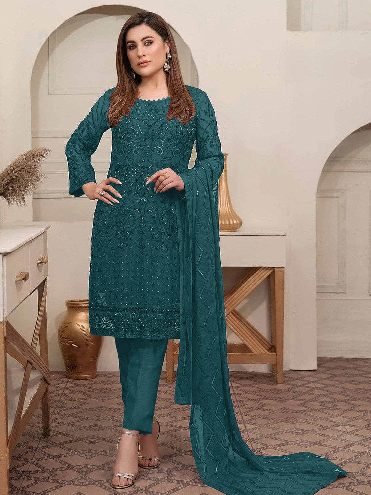 Real magnificence comes out of your dressing design with this Wine colored partywear suit. This georgette Semi-Setitched suit is beautifully adorned with Sequins with designer floral embroidery work as shown which makes it appear graceful. This suit comes along with santoon bottom, santoon lining and chiffon dupatta. Women can buy this ethnic suit to wear for their upcoming parties, functions, receptions and family occasions, sangeet wear where you want to be the limelight.