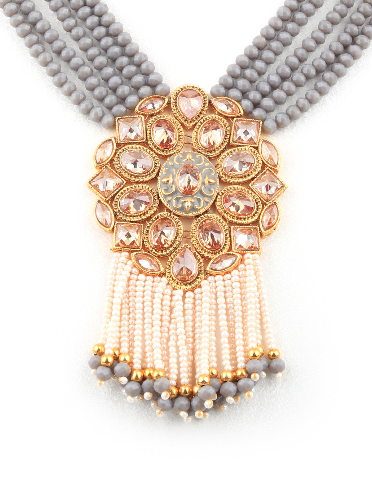 Featuring this stunning grey beaded long haar necklace set with gold-tone Kundan work it also features pearl detailing.