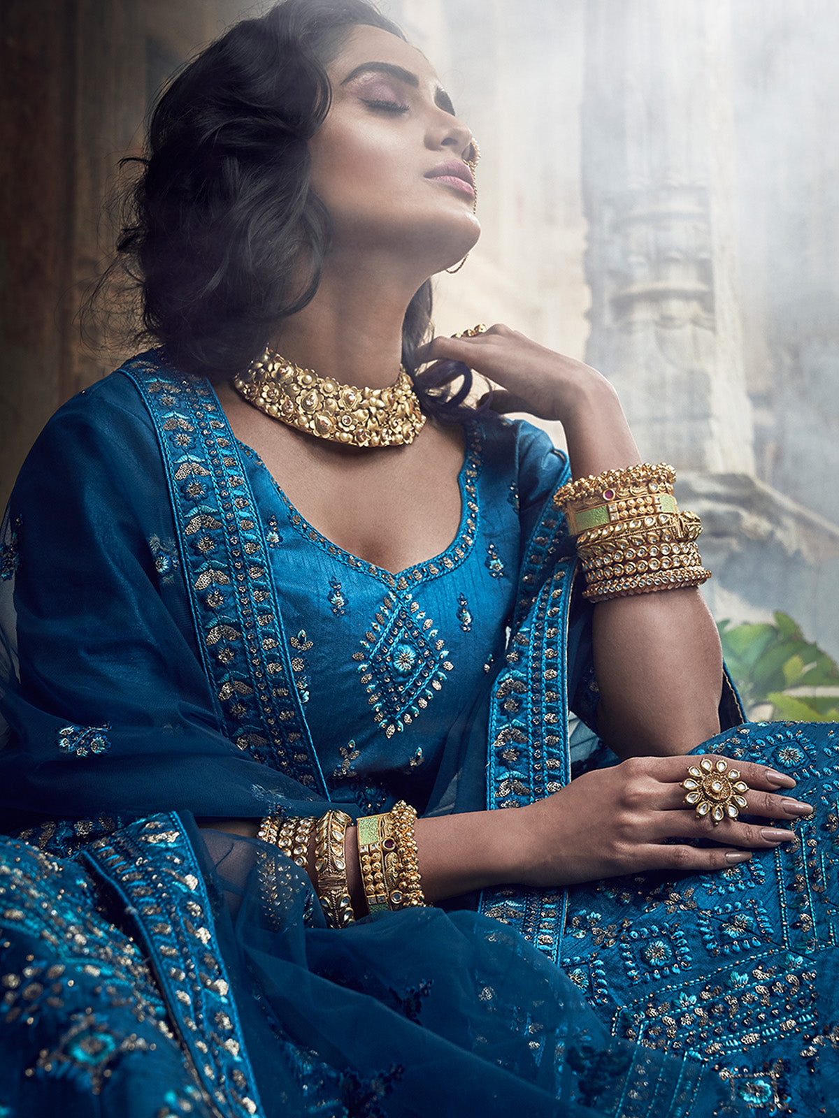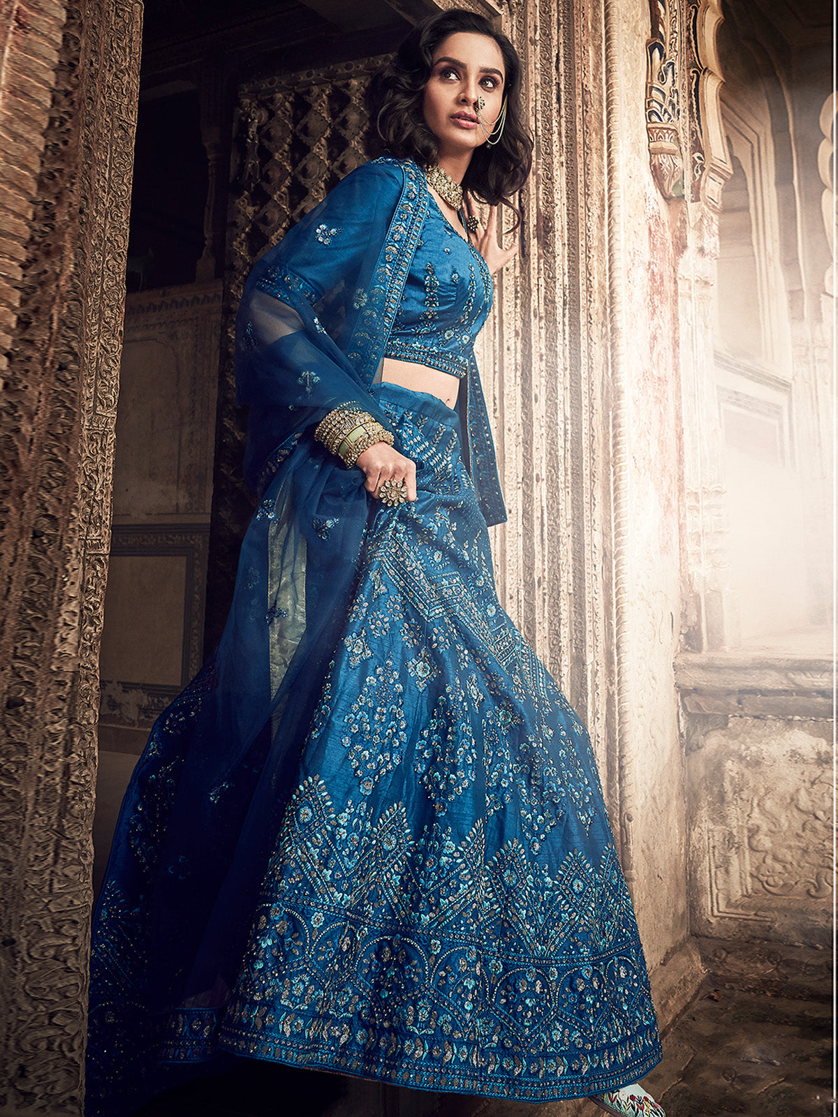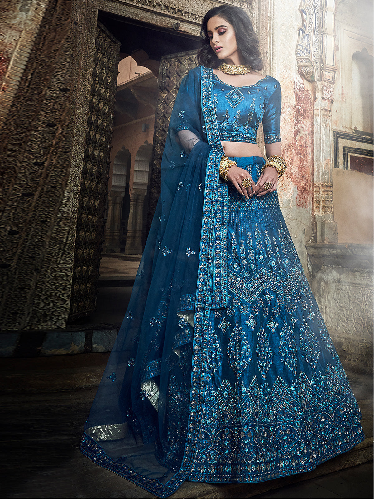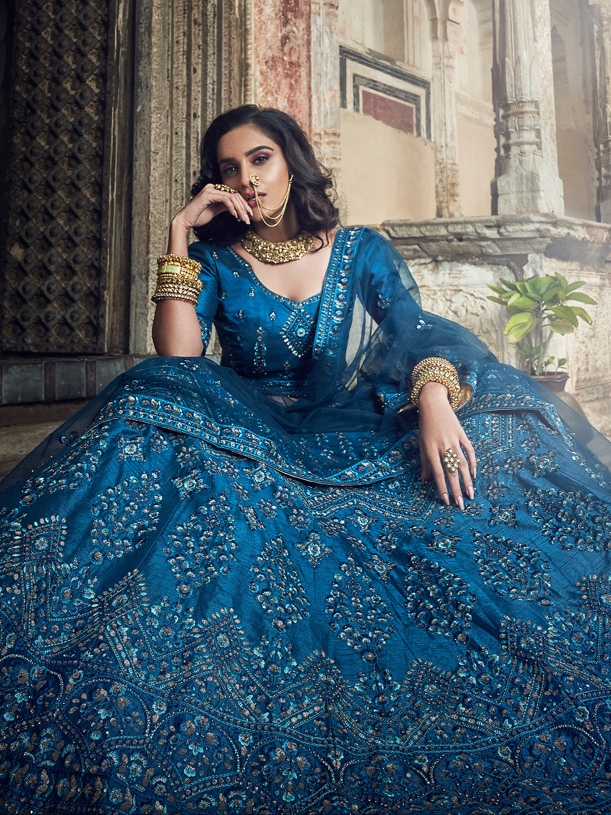 - Lehenga work : Sequins, Thread, Zari, Zarkan