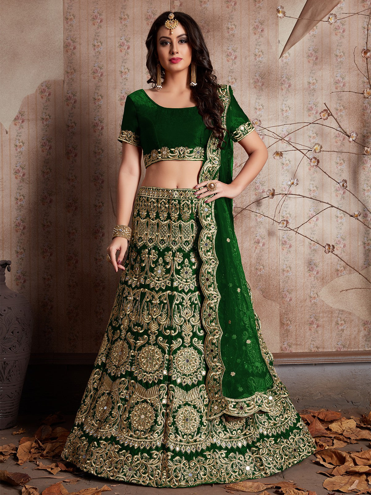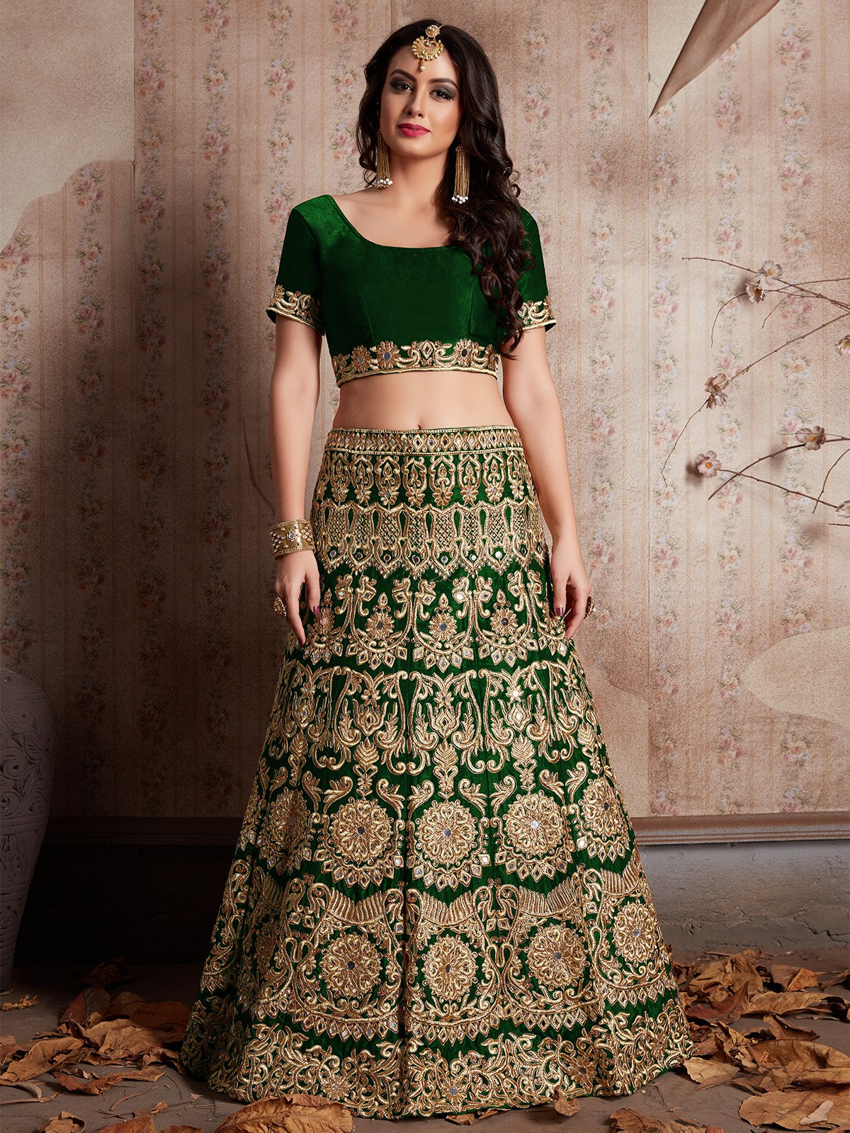Add light to the celebration called life beaming in this lehenga, choli and dupatta set. Crafted on velvet silk, the set is beautified with embroidery work.