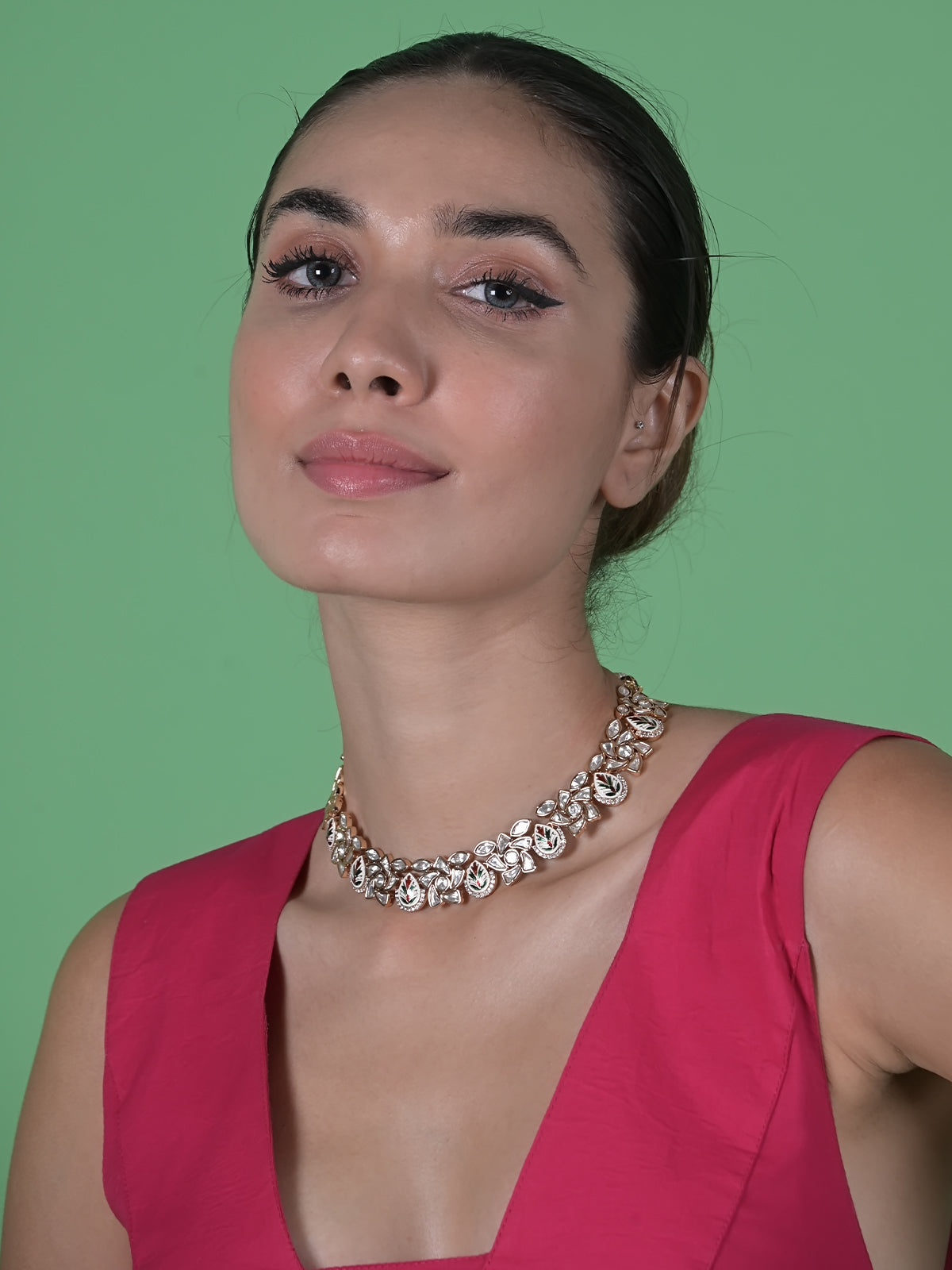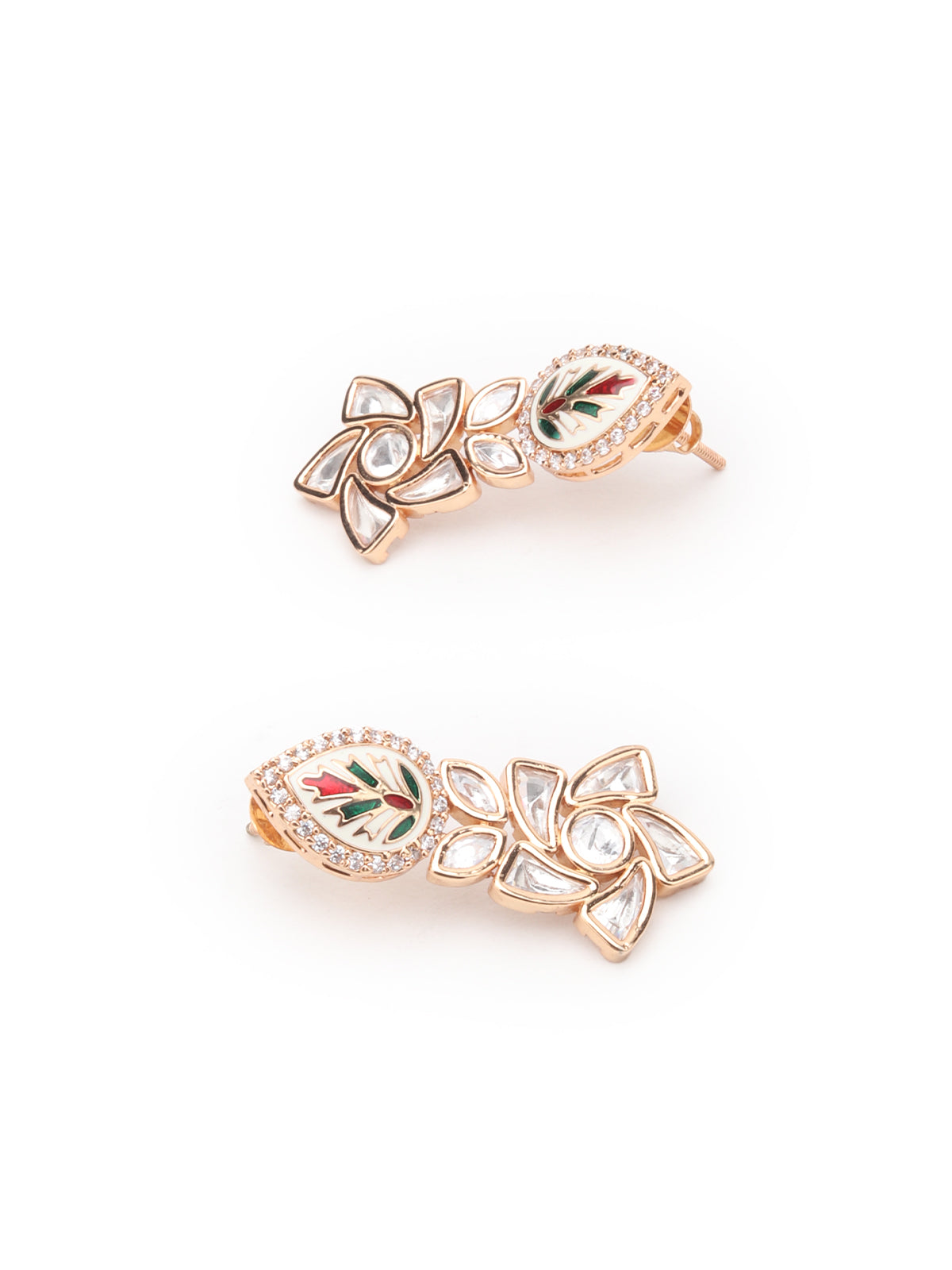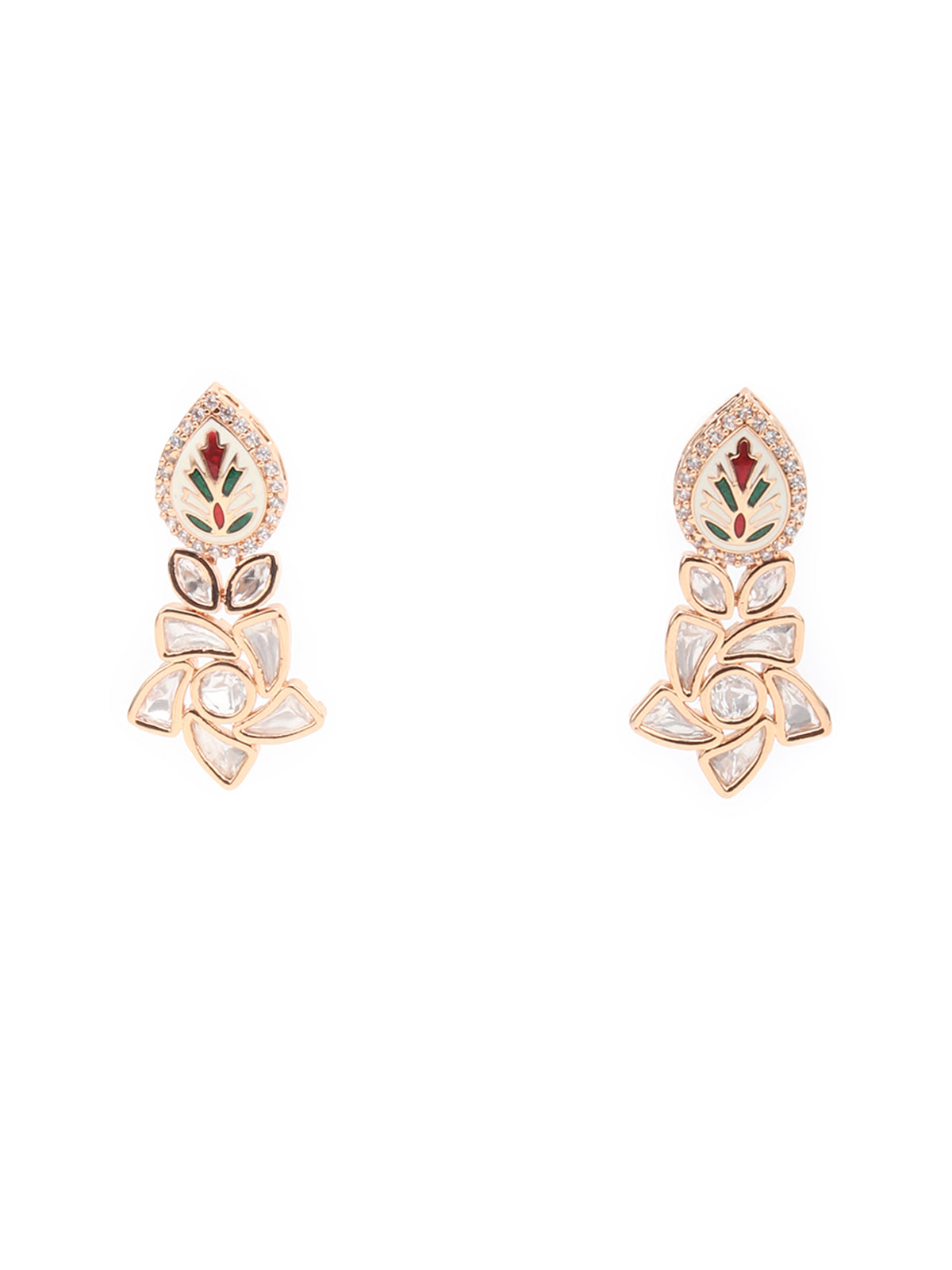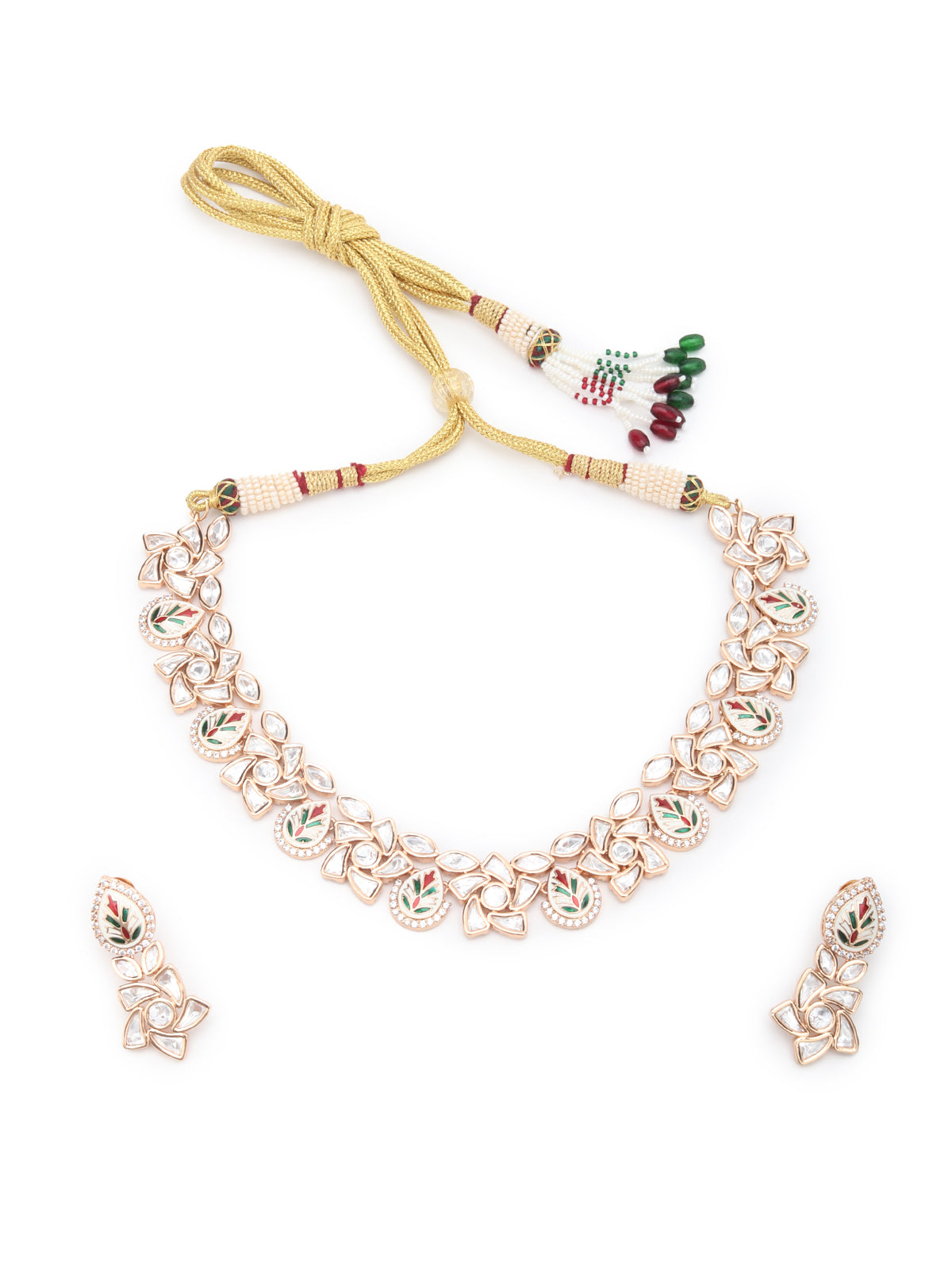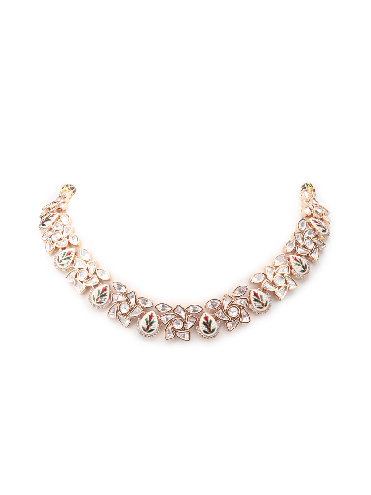 This gorgeous set of neck piece with stud earrings is a great accompaniment to your wedding or party outfit. The necklace has Kundan work on it. The collection and setting of faux stones lends grandeur to this piece. This is must have in your collection.