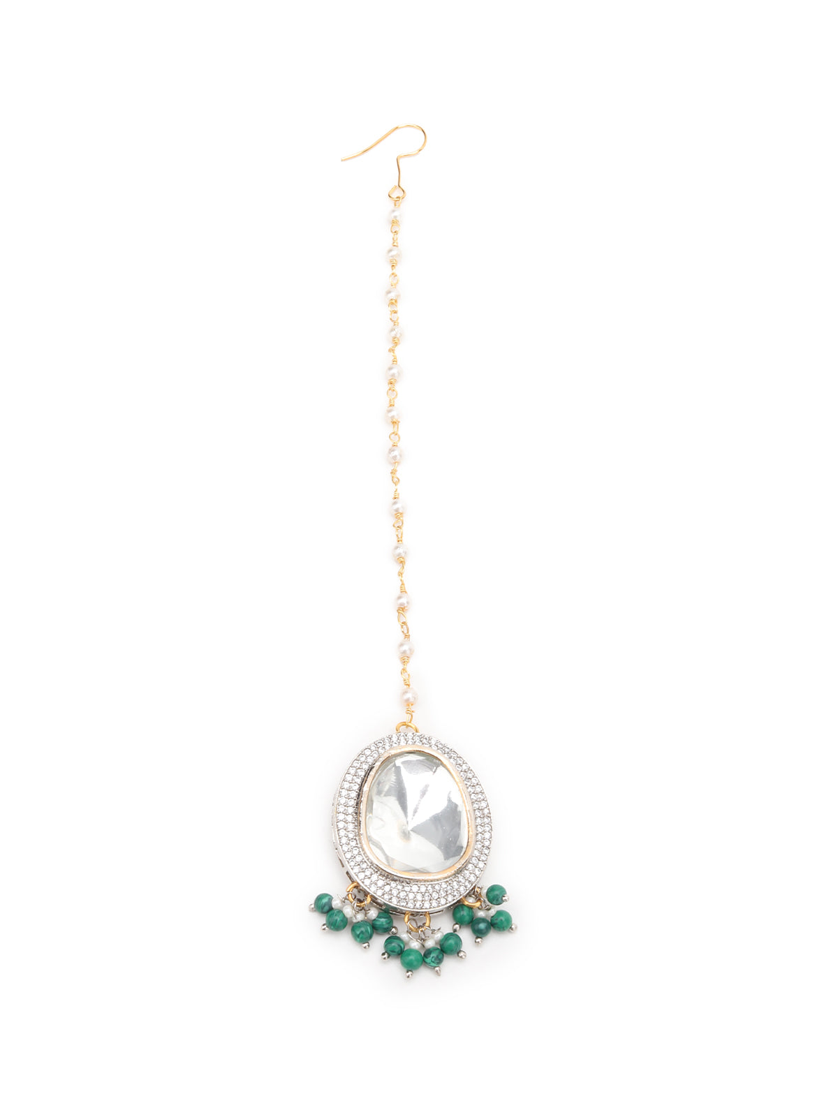 This gorgeous set of neck piece with stud earrings is a great accompaniment to your wedding or party outfit. The necklace has stones work on it. The neckpiece comes with a mangtika and matching earrings. The collection and setting of faux stones lends grandeur to this piece. This is must have in your collection.
