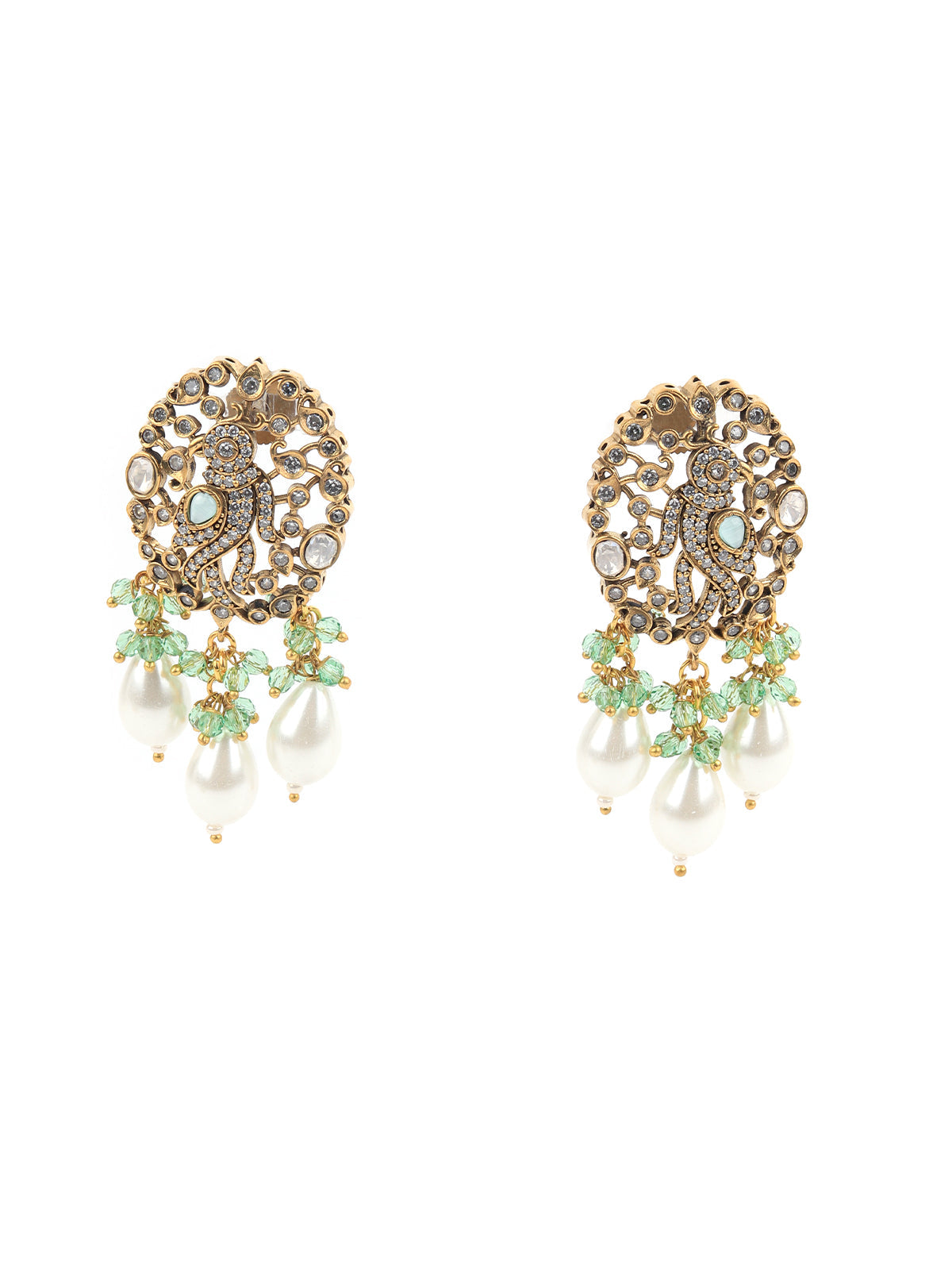 This gorgeous set of neck piece with stud earrings is a great accompaniment to your wedding or party outfit. The necklace has Kundan work on it. The collection and setting of faux stones lends grandeur to this piece. This is must have in your collection.