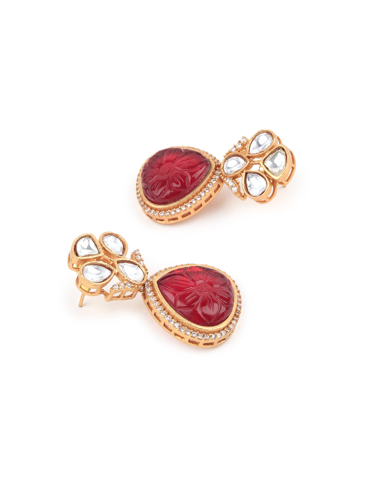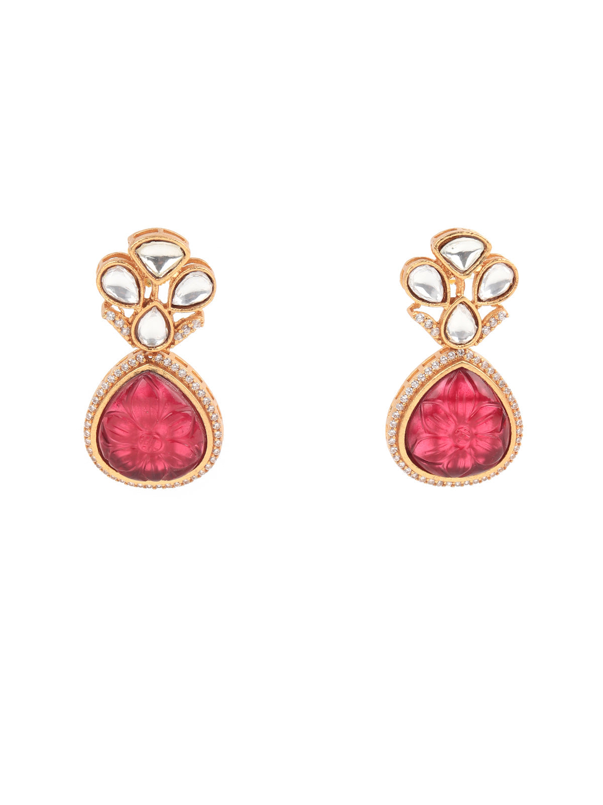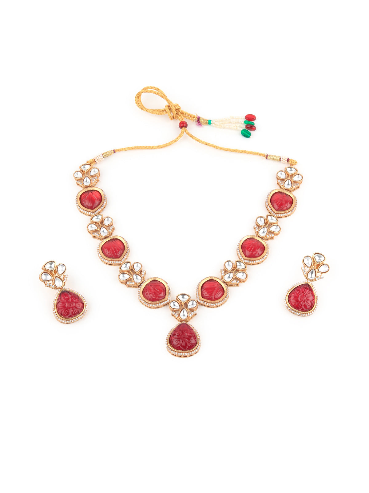 This gorgeous set of neck piece with stud earrings is a great accompaniment to your wedding or party outfit. The necklace has stones work on it. The neckpiece is flanked with matching earrings. The collection and setting of faux stones lends grandeur to this piece. This is must have in your collection.