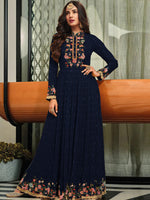 Be the most lovable person in this blue georgette anarkali suit. The ethnic embroidered work in the front neck and tikki work over the dress adds a sign of elegance look. This suit comes with matching shantoon narrow straight pant bottom Material. The matching plain dupatta is chiffon with lace in the border.