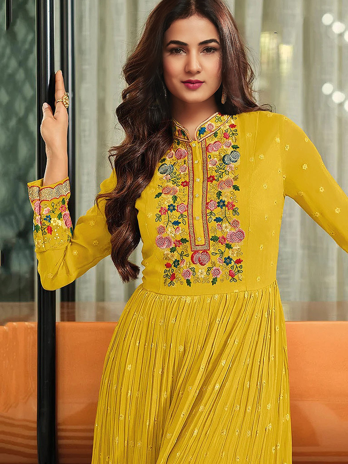Be the most lovable person in this Yellow georgette anarkali suit. The ethnic embroidered work in the front neck and tikki work over the dress adds a sign of elegance look. This suit comes with matching shantoon narrow straight pant bottom Material. The matching plain dupatta is chiffon with lace in the border.