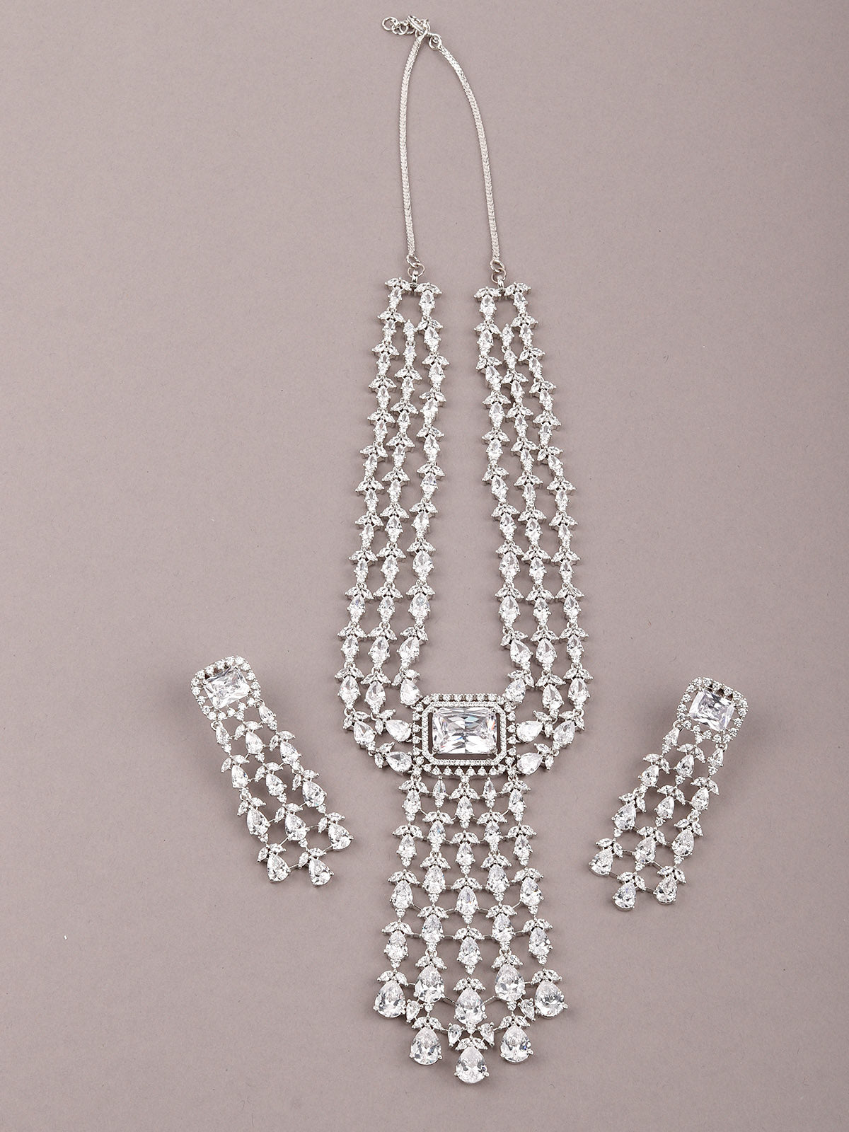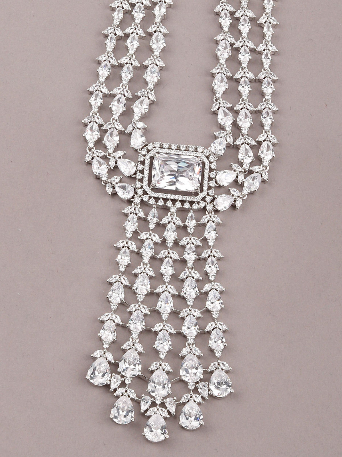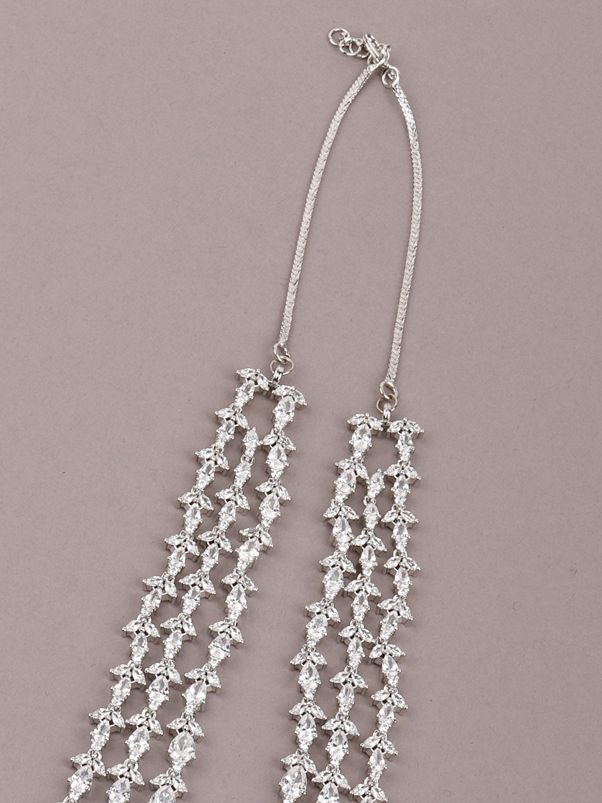 Spruce up your look with this lovely necklace, that comes with matching earrings. The intricately designed neckpiece is decorated with white faux stones and is flanked by statement earrings. The set is beautified with faux stones, and intricate work. 1. Intricate design 2. Studded with white faux stones 3. Compliments Western look 3. Choker Necklace Pattern 4. With Matching Earrings