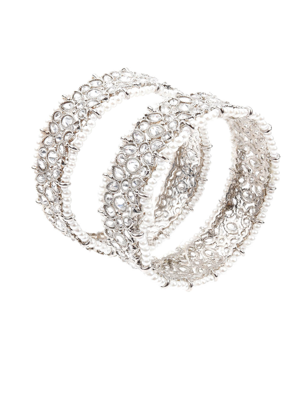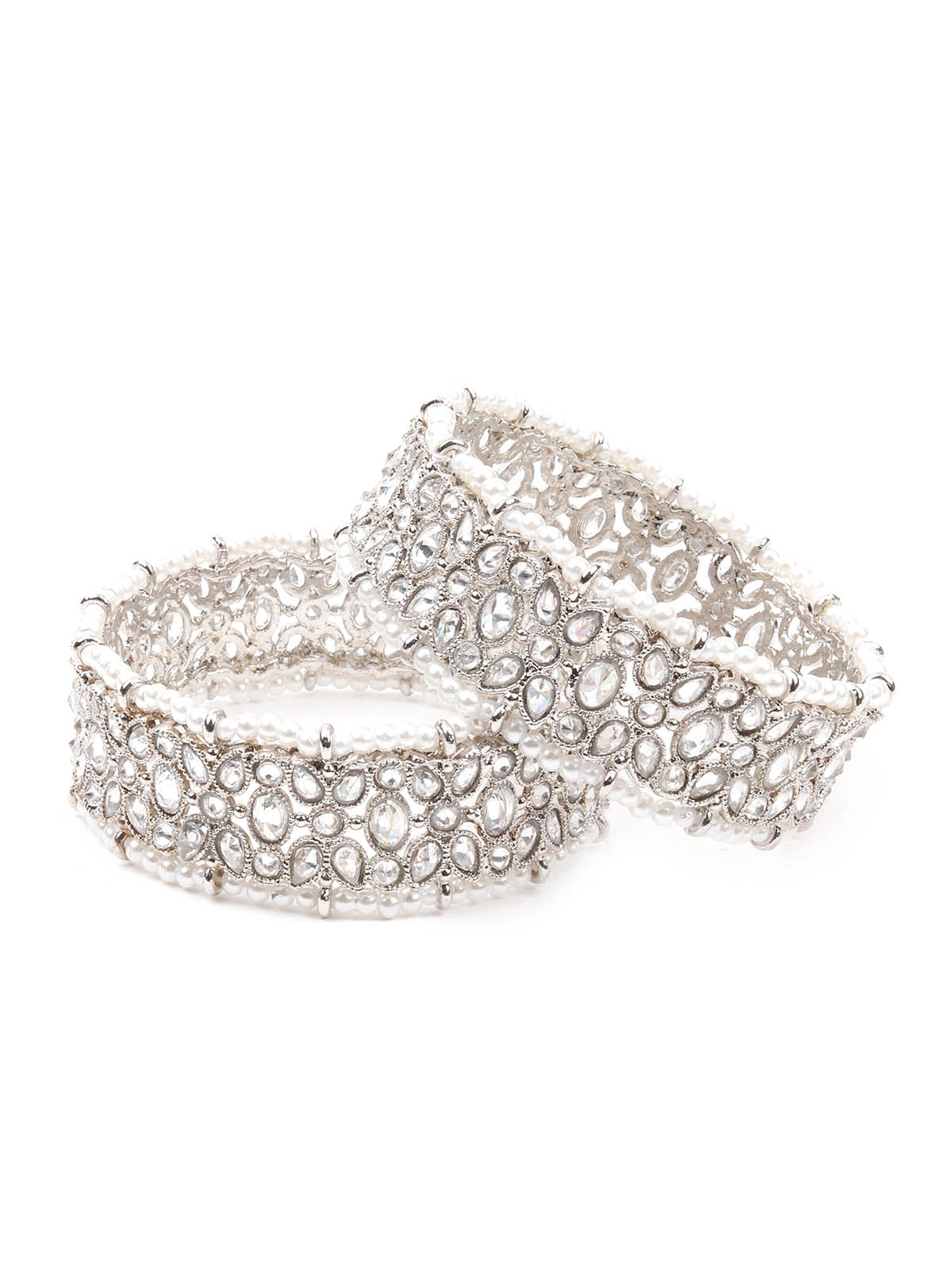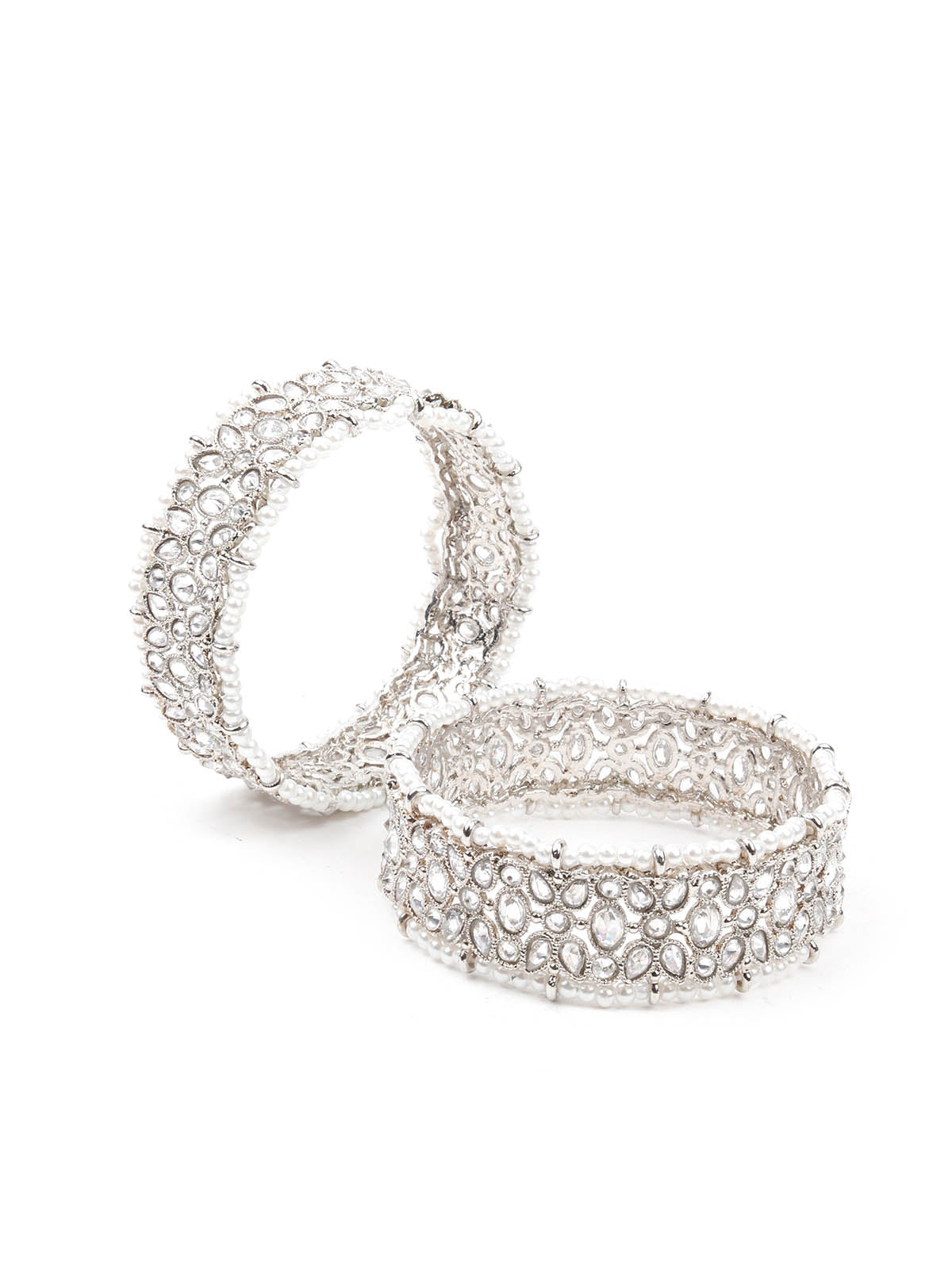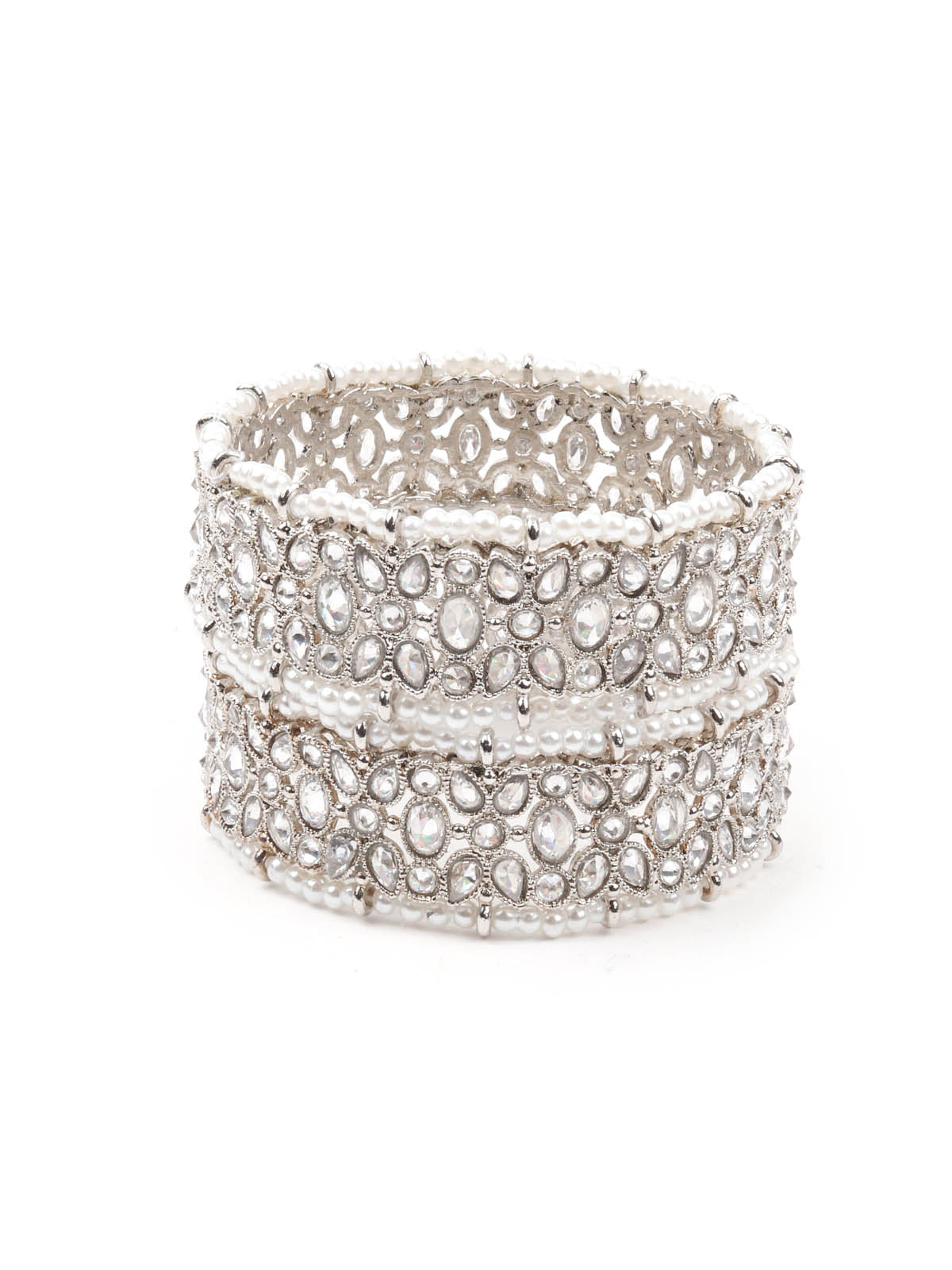 The German Rhodium plated bracelet is studded with white faux pearls embellishment over it. This is a standalone piece crafted to gain compliments.