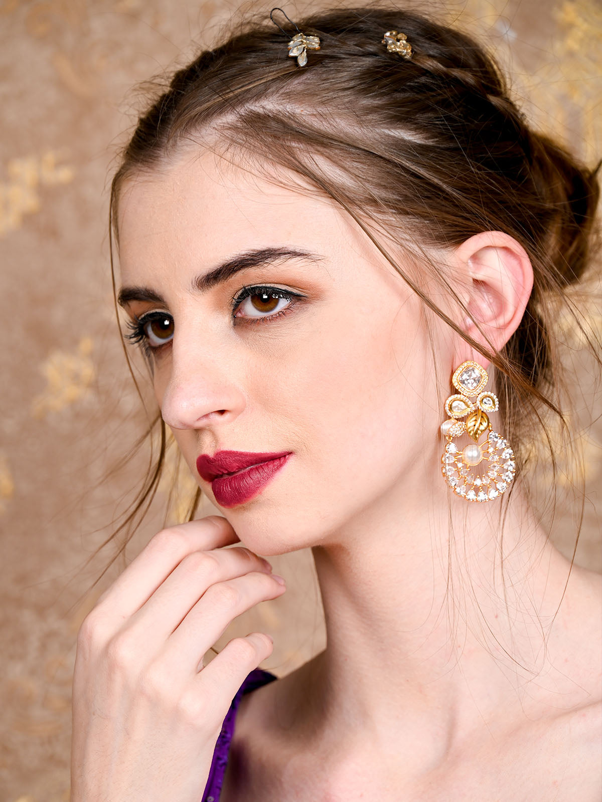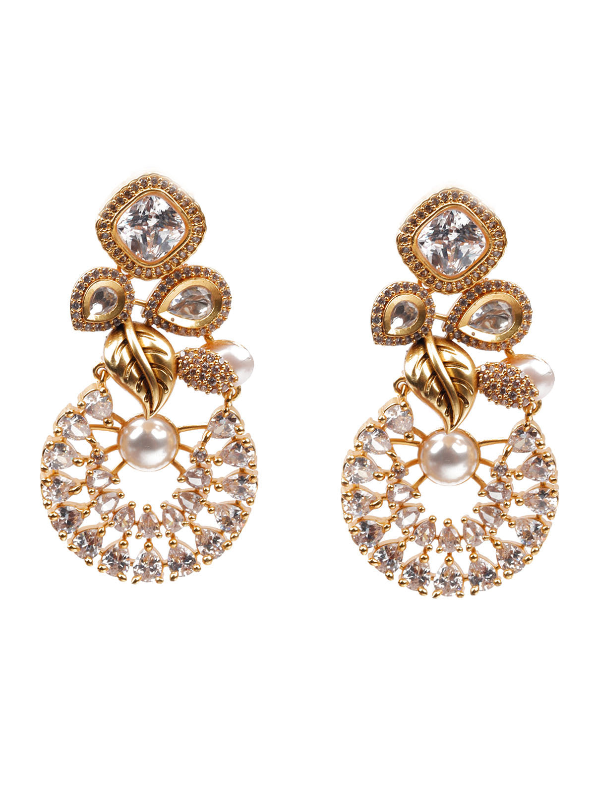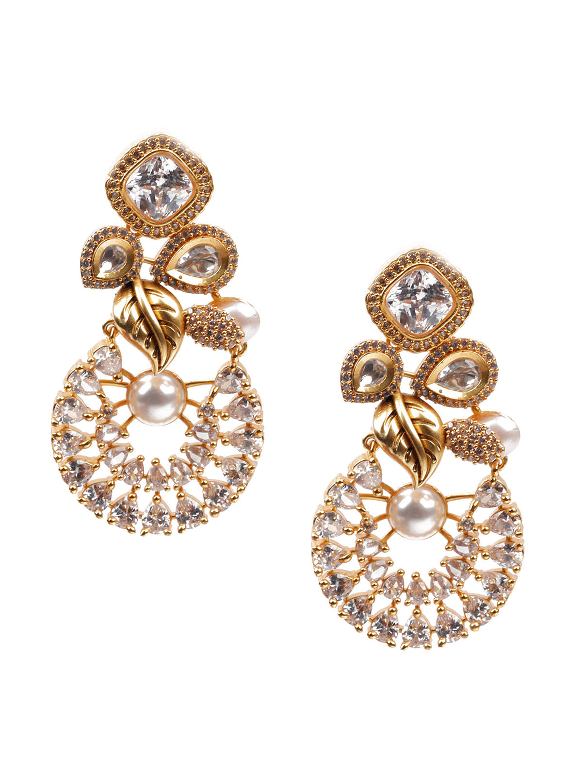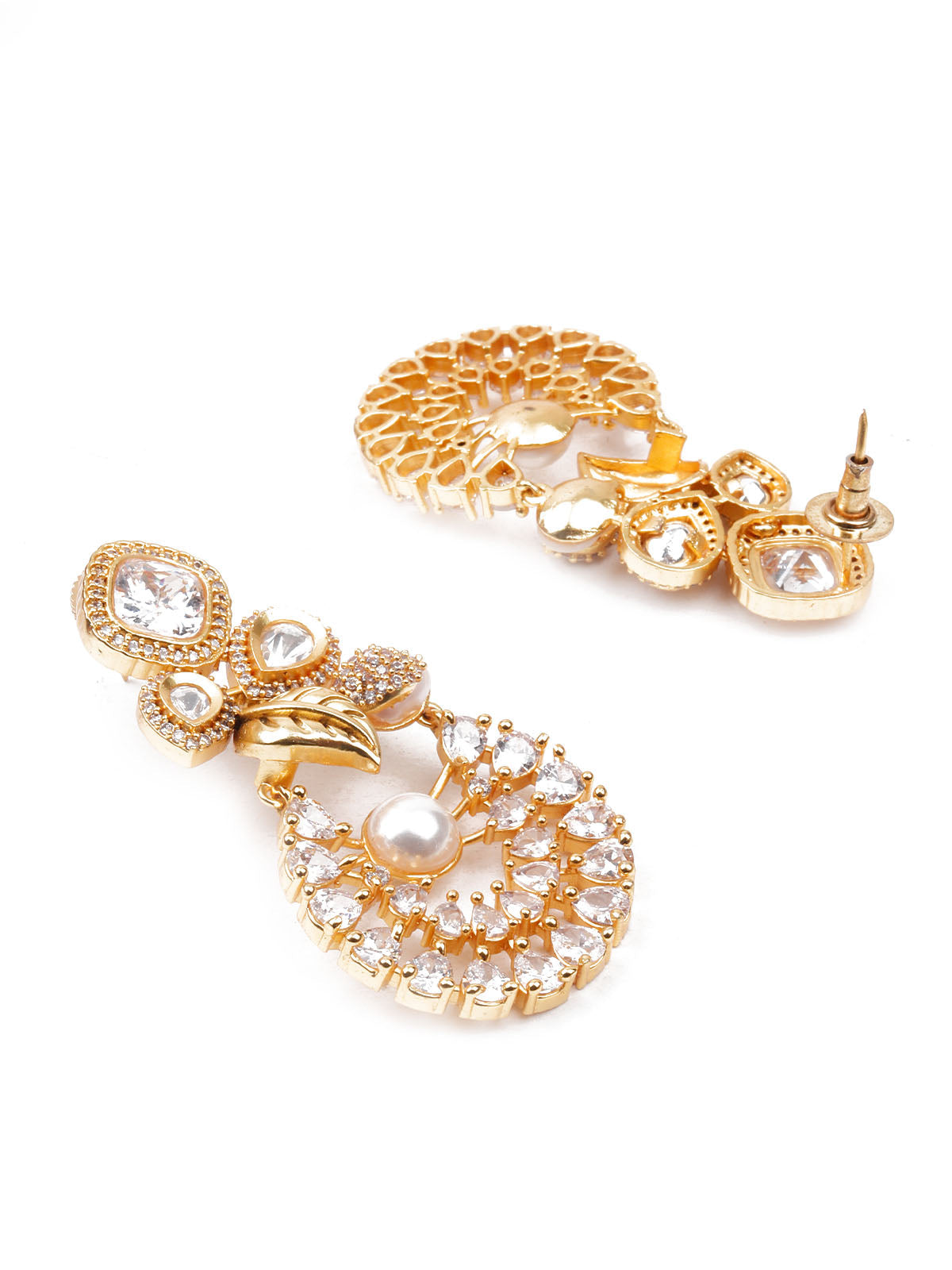 The gold designer embellished drop earrings are a show-stopper. Wear this versatile piece of jewelry with Indian and Indo-Western dresses to add some panache to your dress.