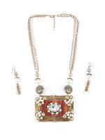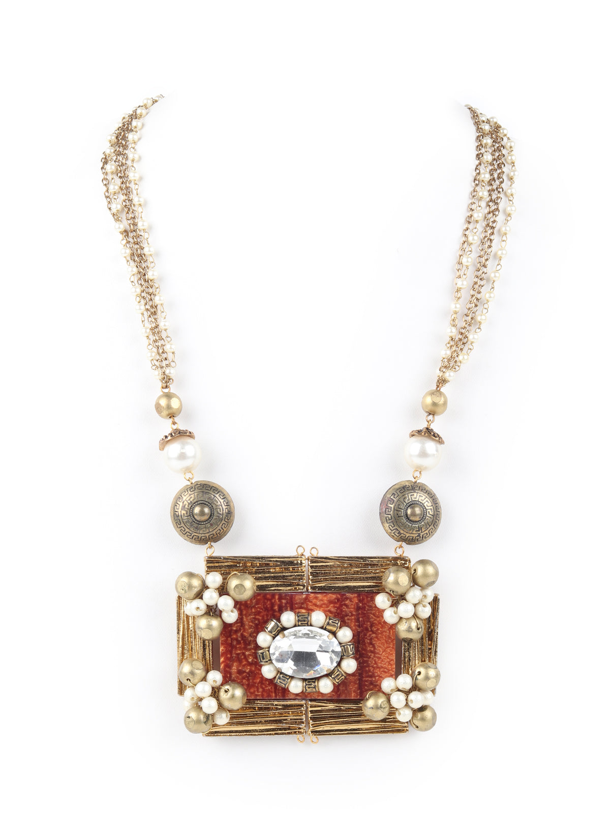 - Pendant has golden firm straps with brown resin in the center garnished with rhine stones, faux white and golden pearls.