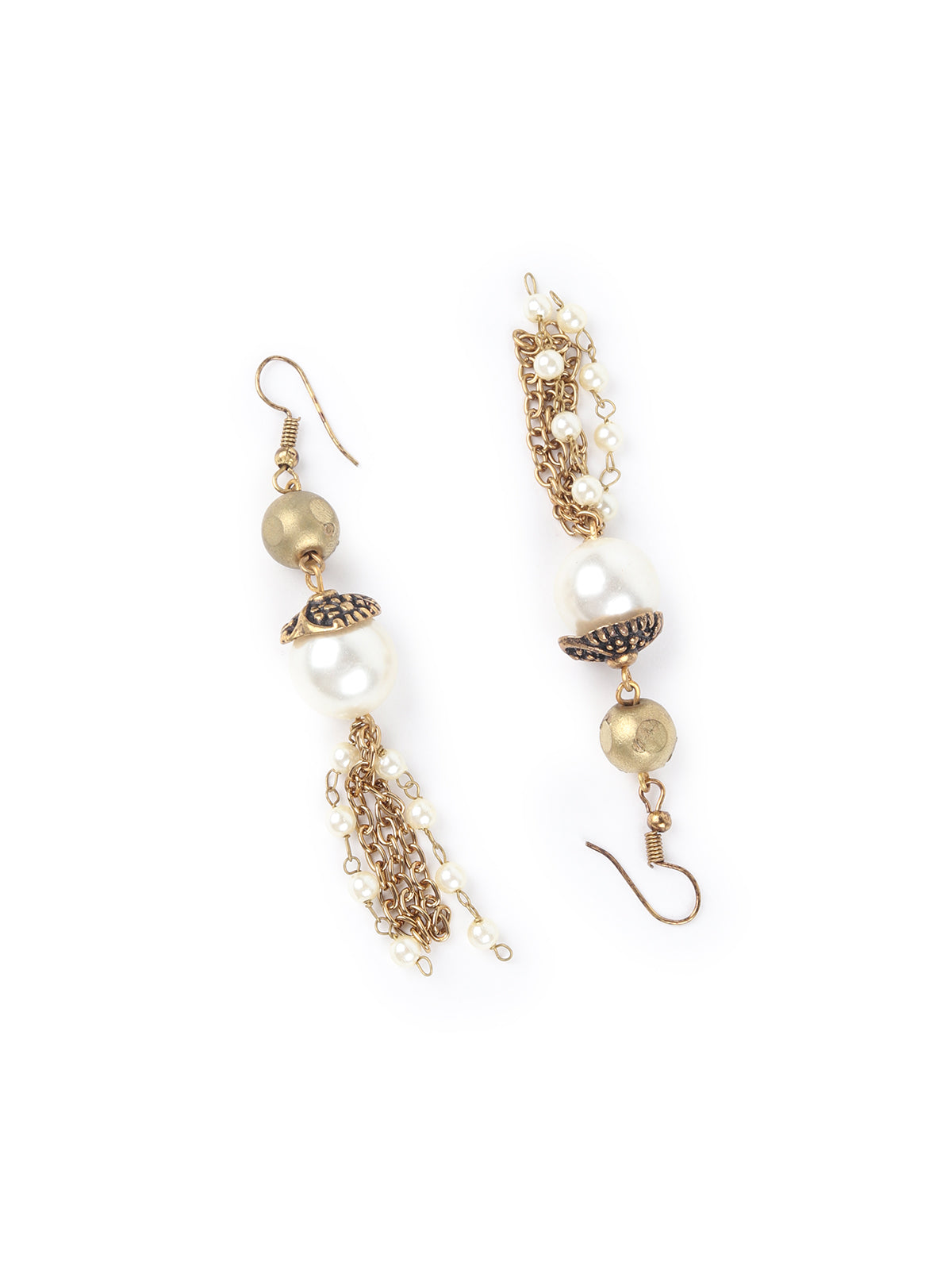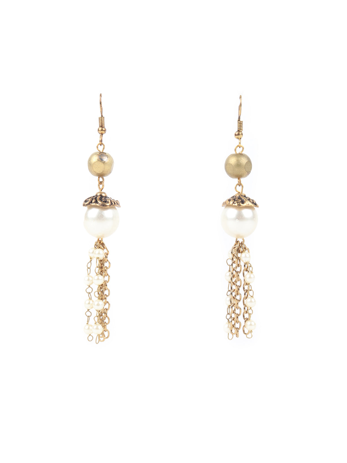 - Light dangling earrings include faux pearls and engraved metal piece.