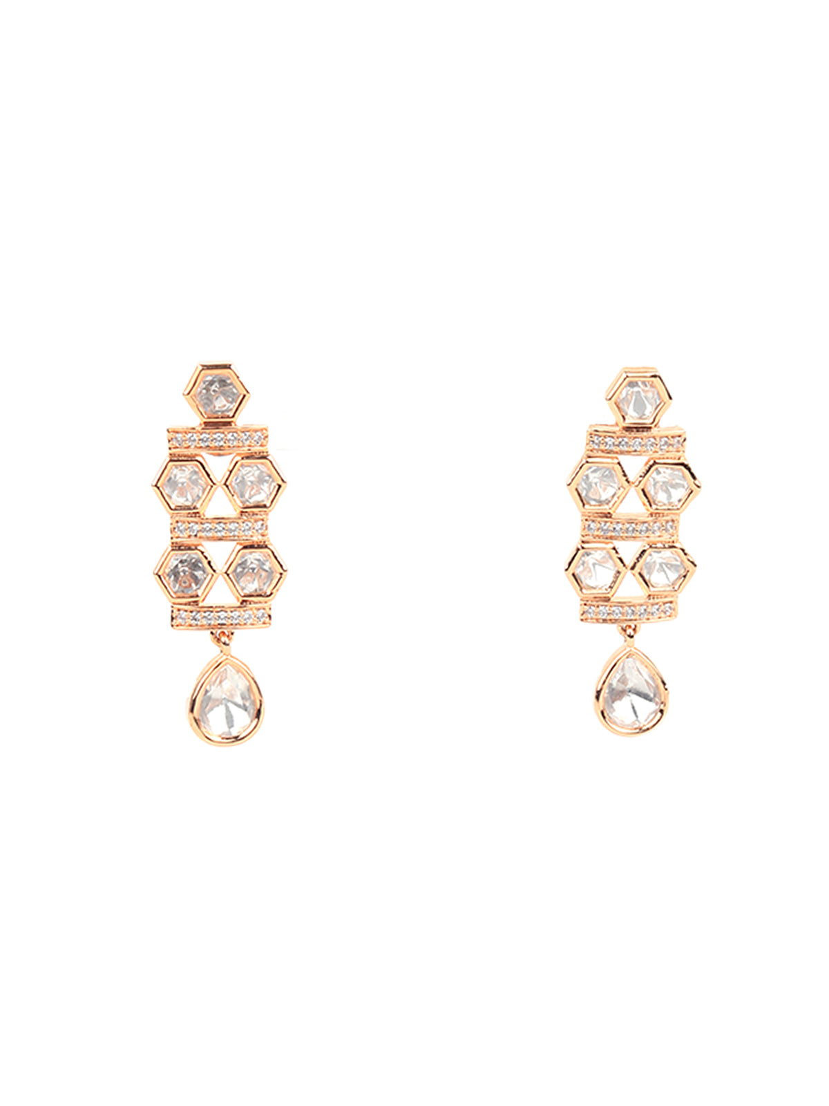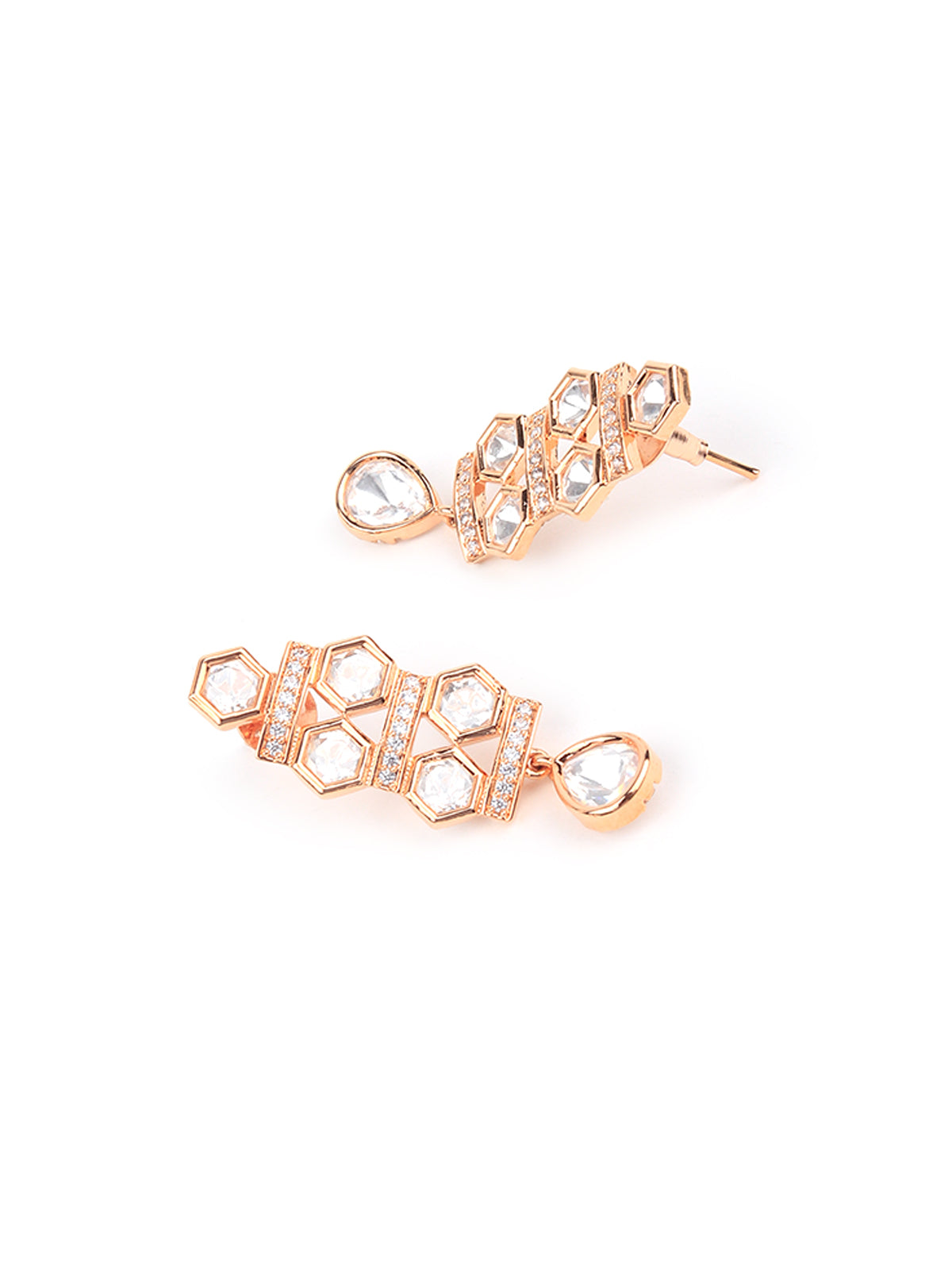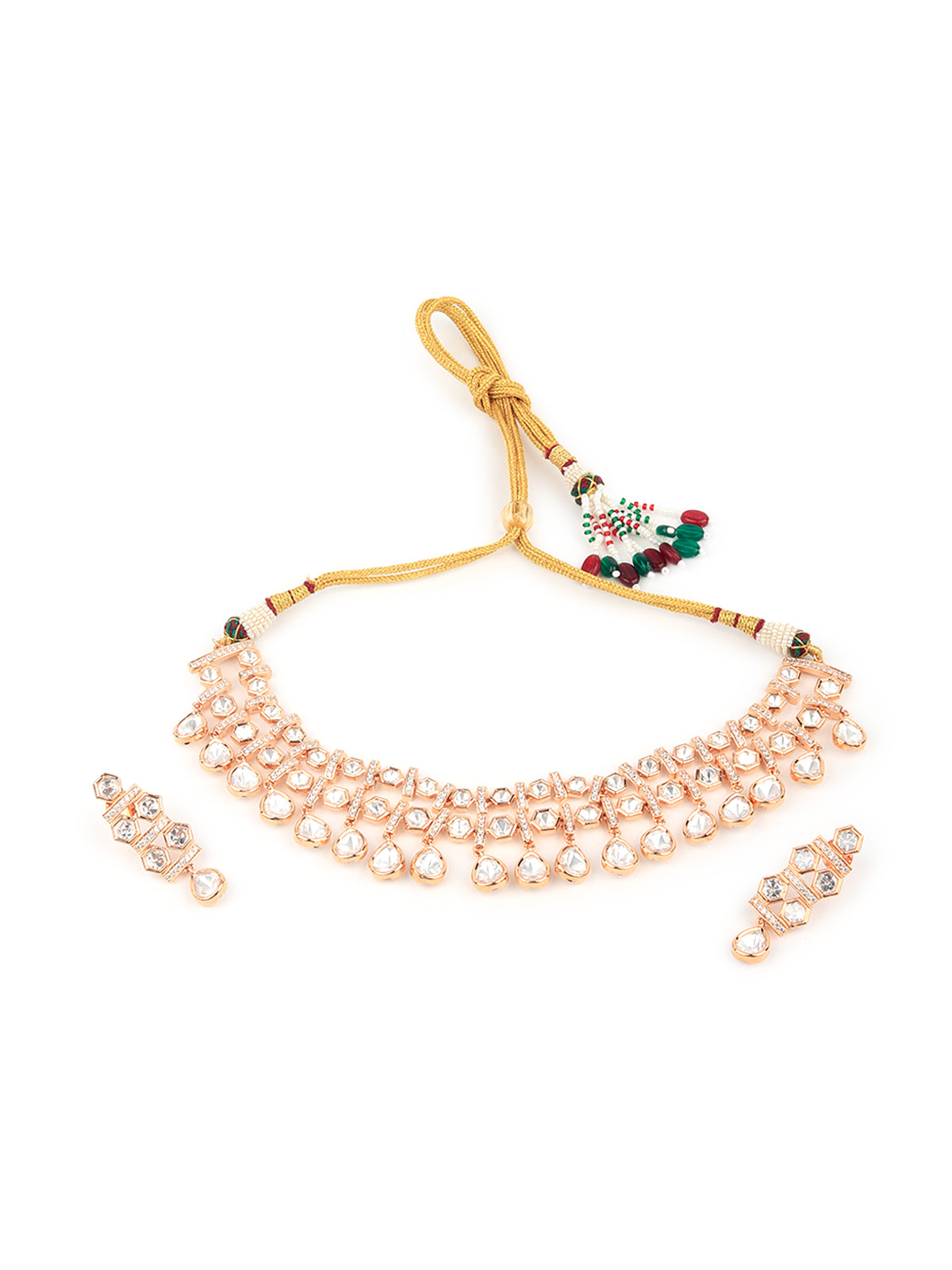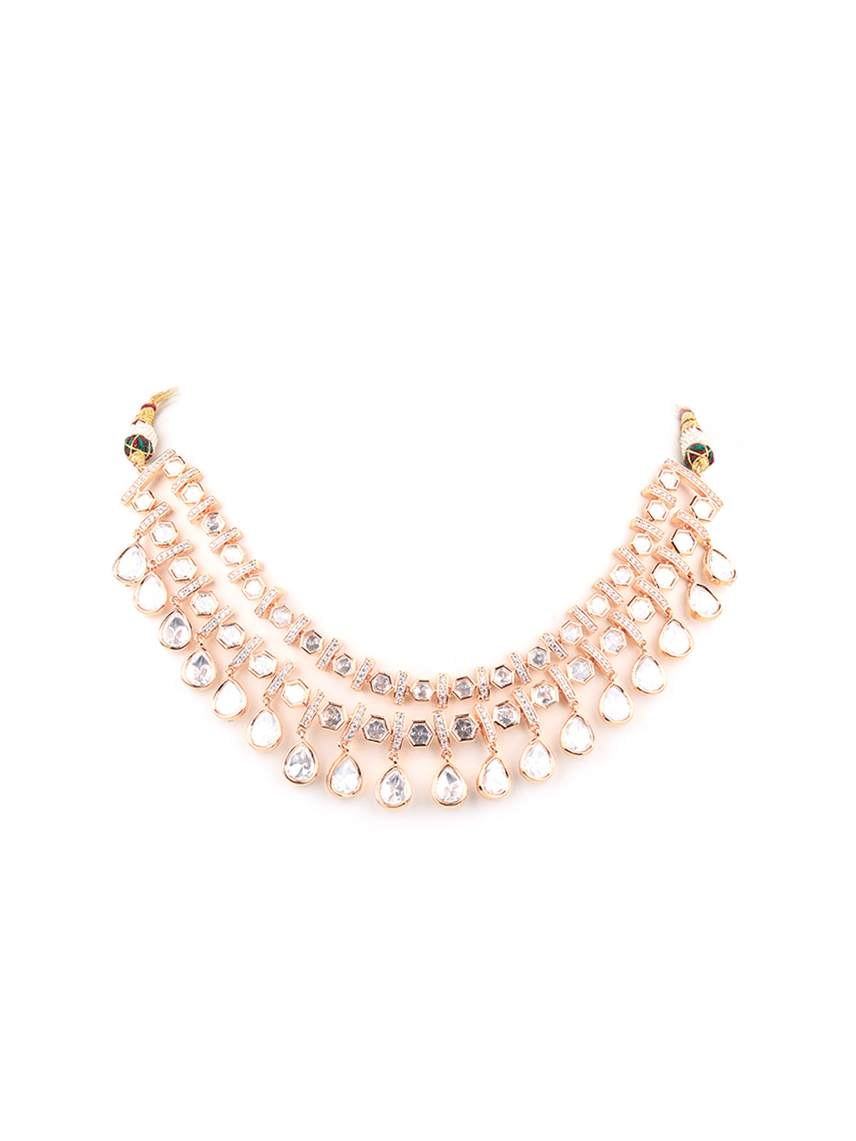 Spruce up your look with this Golden plated neckpiece set, containing royal looking necklace and matching earrings set. The neckpiece is decorated with white faux stones and kundan that is flanked by statement earrings.