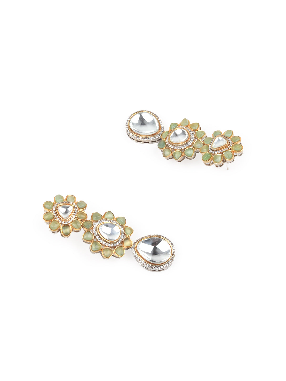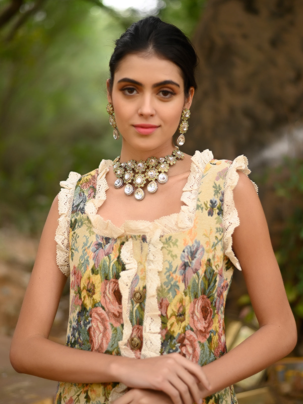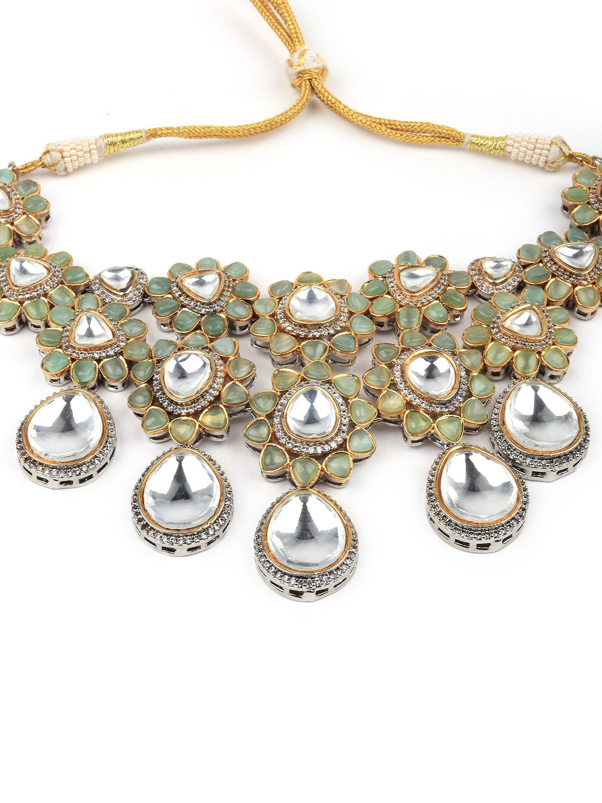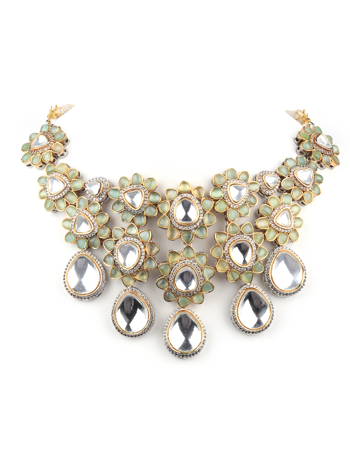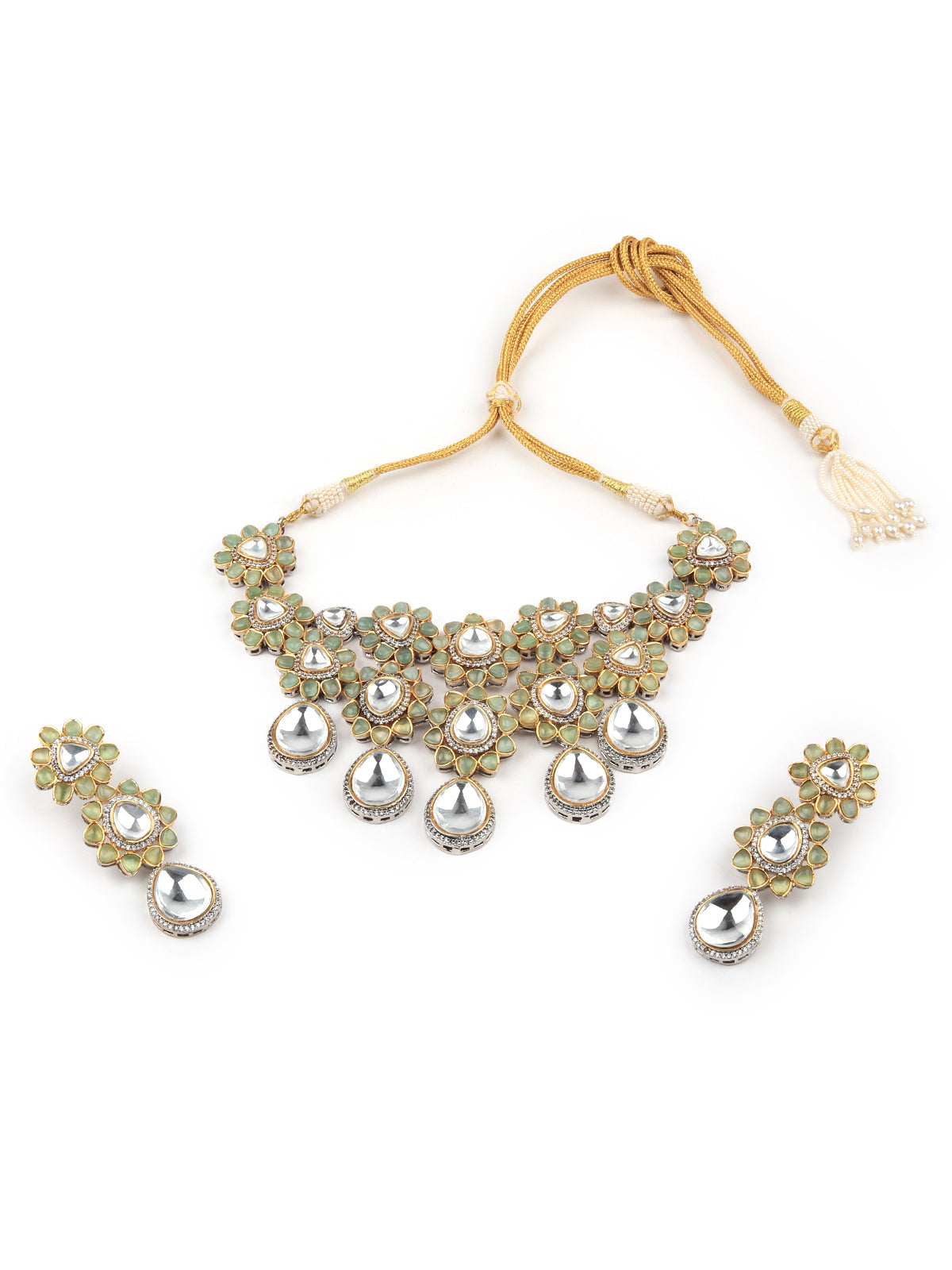 This gorgeous set of neck piece with dangling earrings is a great accompaniment to your wedding or party outfit. The necklace has Kundan and beads on it. The collection and setting of faux stones lend Victorian grandeur to this piece. This is must have in your collection.