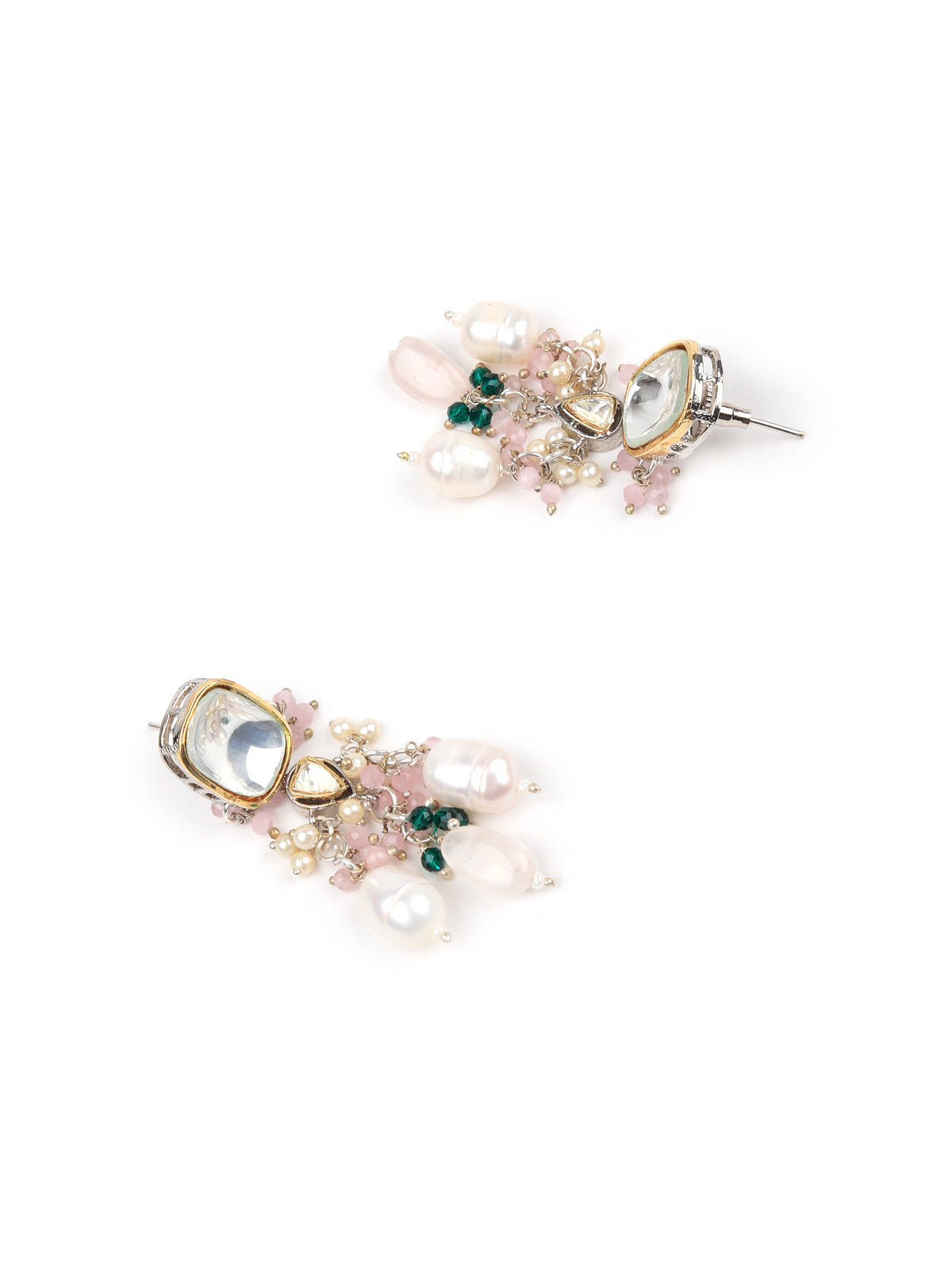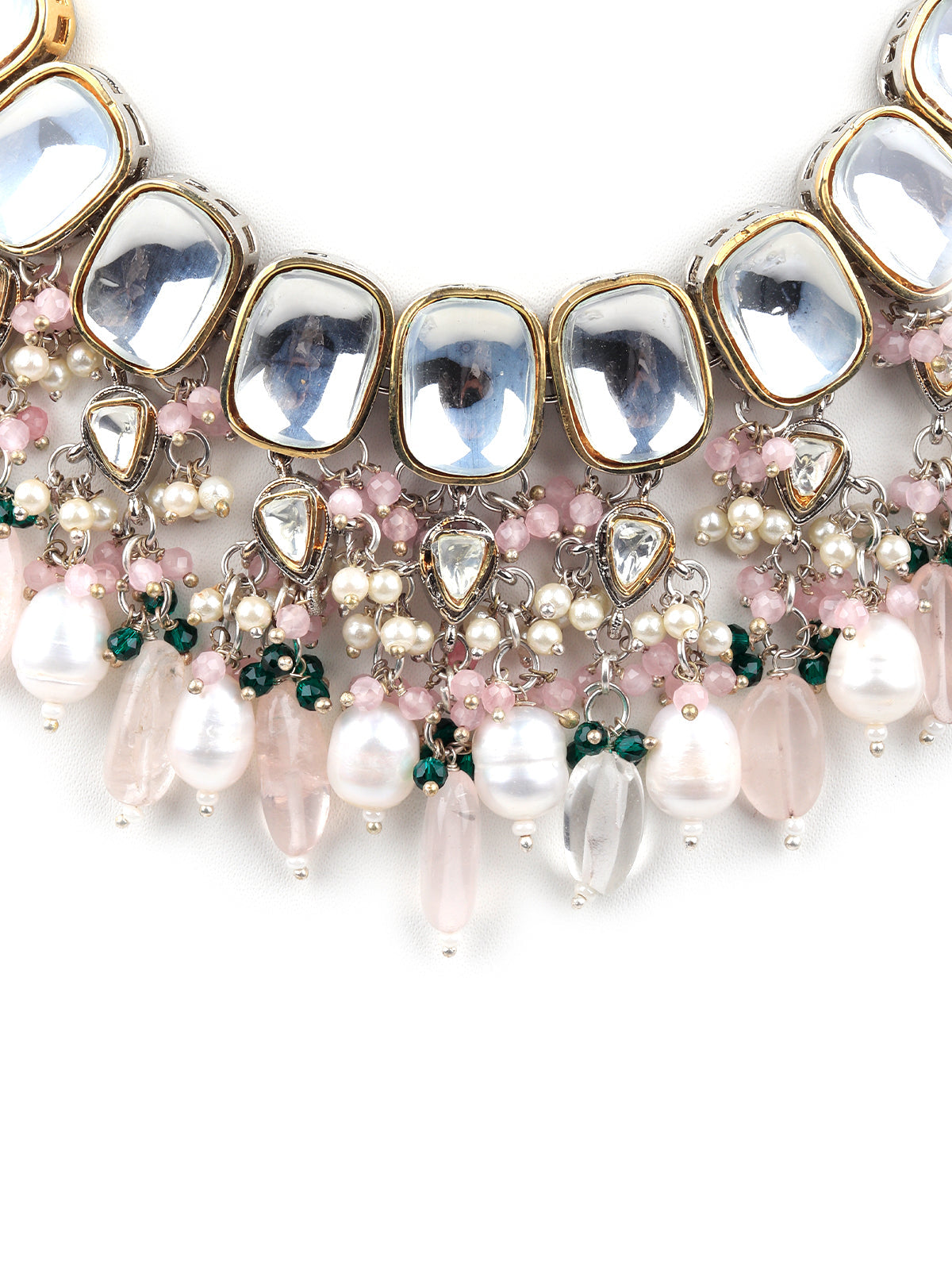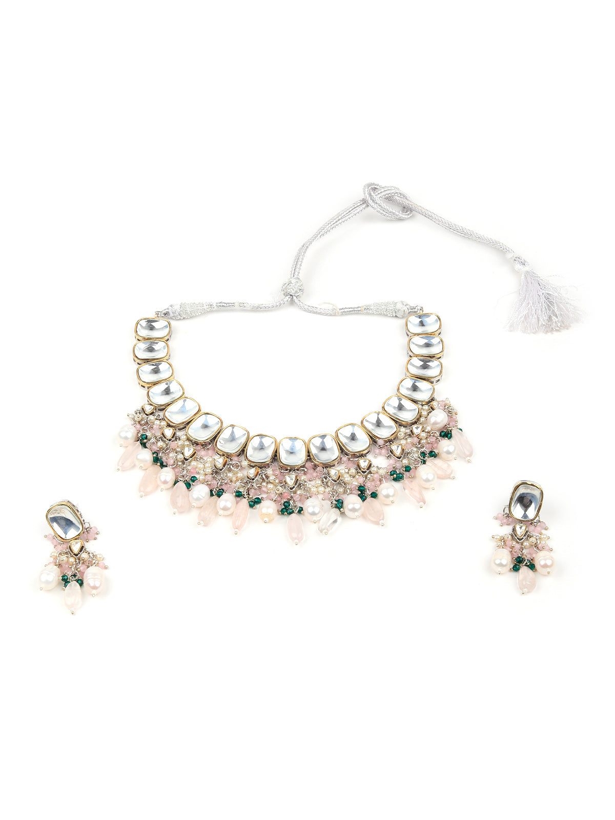 This gorgeous set of neck piece with stud earrings is a great accompaniment to your wedding or party outfit. The necklace has stones work on it. The neckpiece is flanked with matching earrings. The collection and setting of faux stones lends grandeur to this piece. This is must have in your collection.