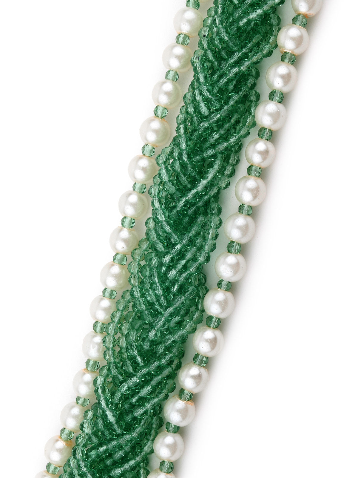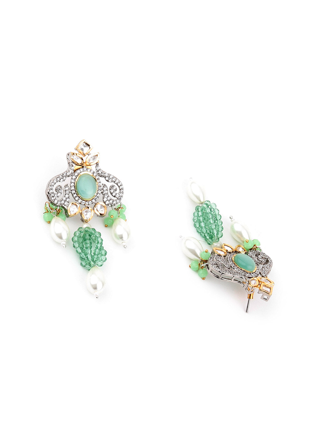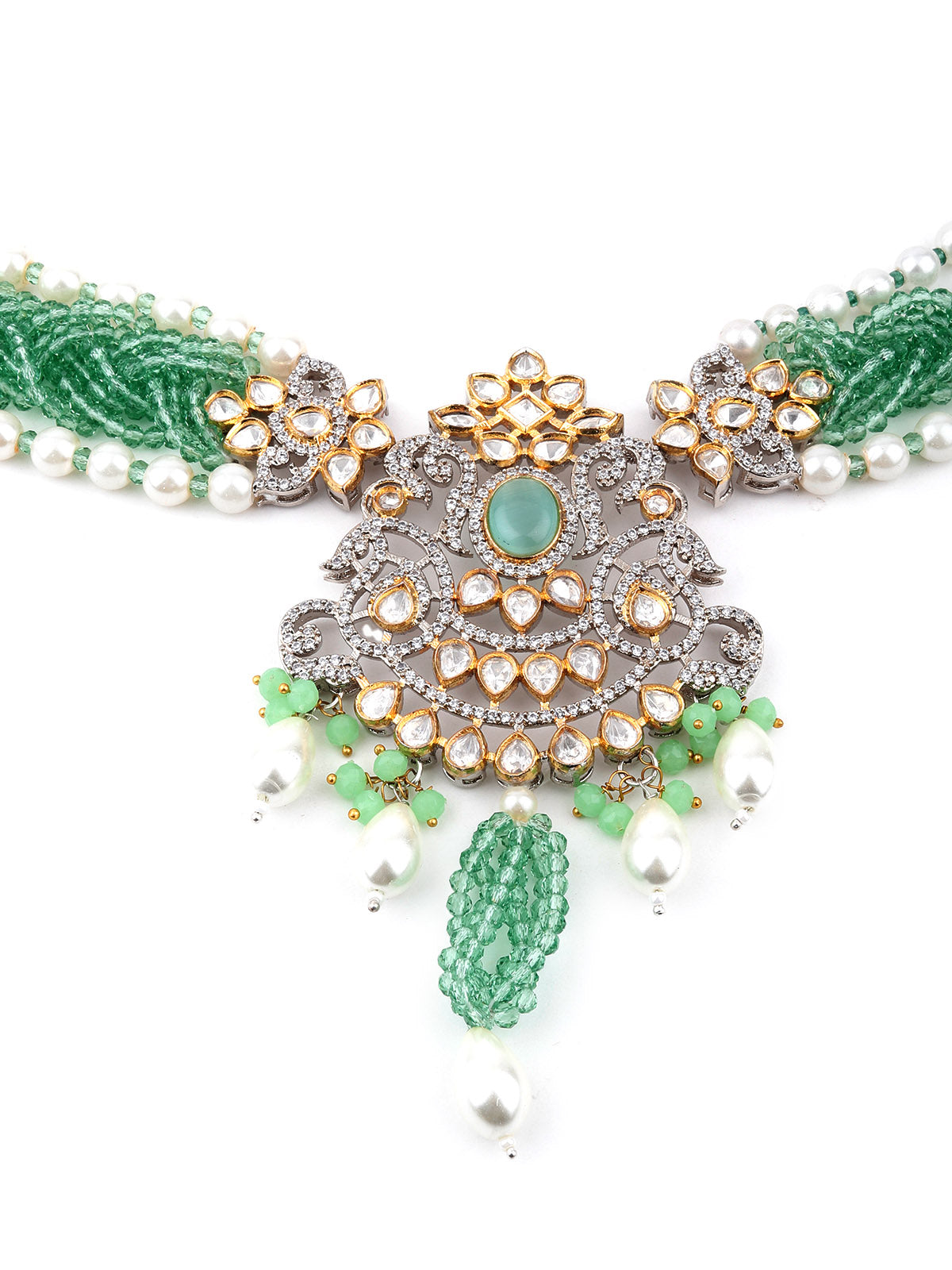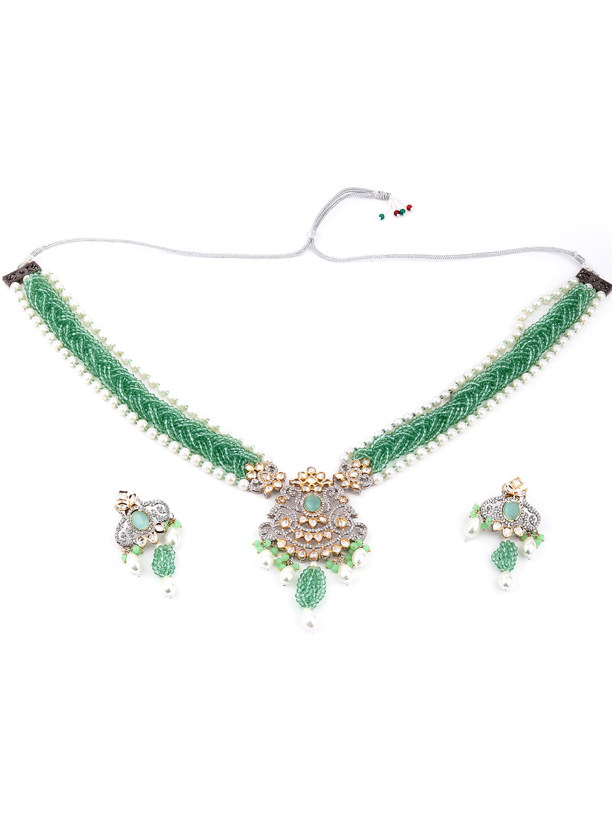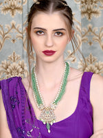 Spruce up your look with this white and green long necklace set that comes with matching earrings and mangteeka. The intricately designed choker neckpiece is decorated with faux stones and beads and is flanked by statement earrings and maangteeka. The set is made beautiful with stone and intricate work. 1. Intricate design 2. Studded with faux material 3. Compliments Indian look 3. Long Necklace Pattern 4. With Matching Earrings and Maangtika