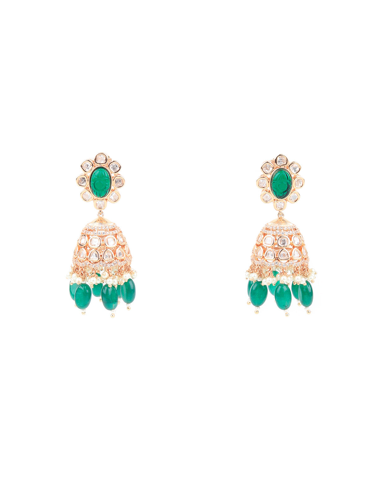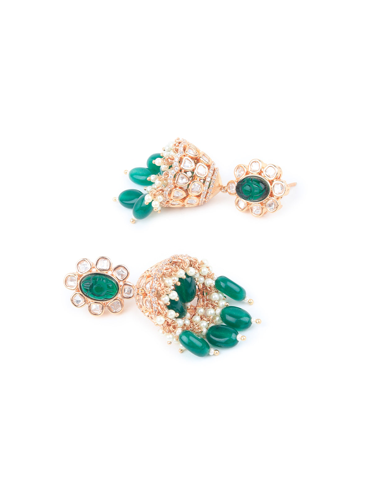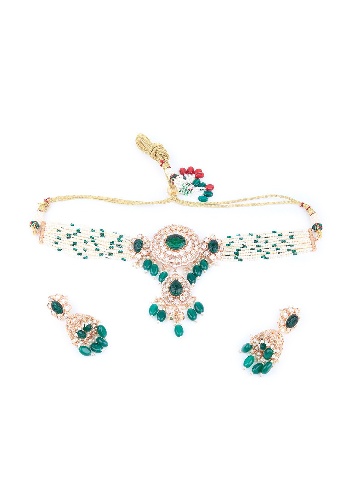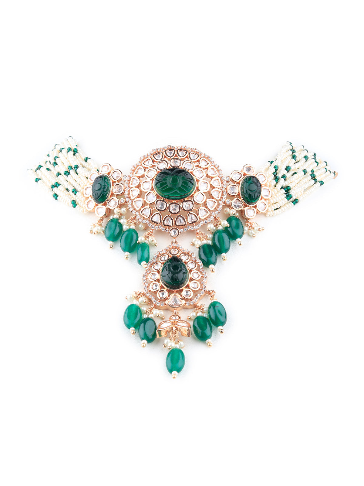 Spruce up your look with this mixed metal neckpiece set, containing royal looking choker necklace and matching earrings set. The neckpiece is decorated with Sea green faux stones that is flanked by equally statement earrings.