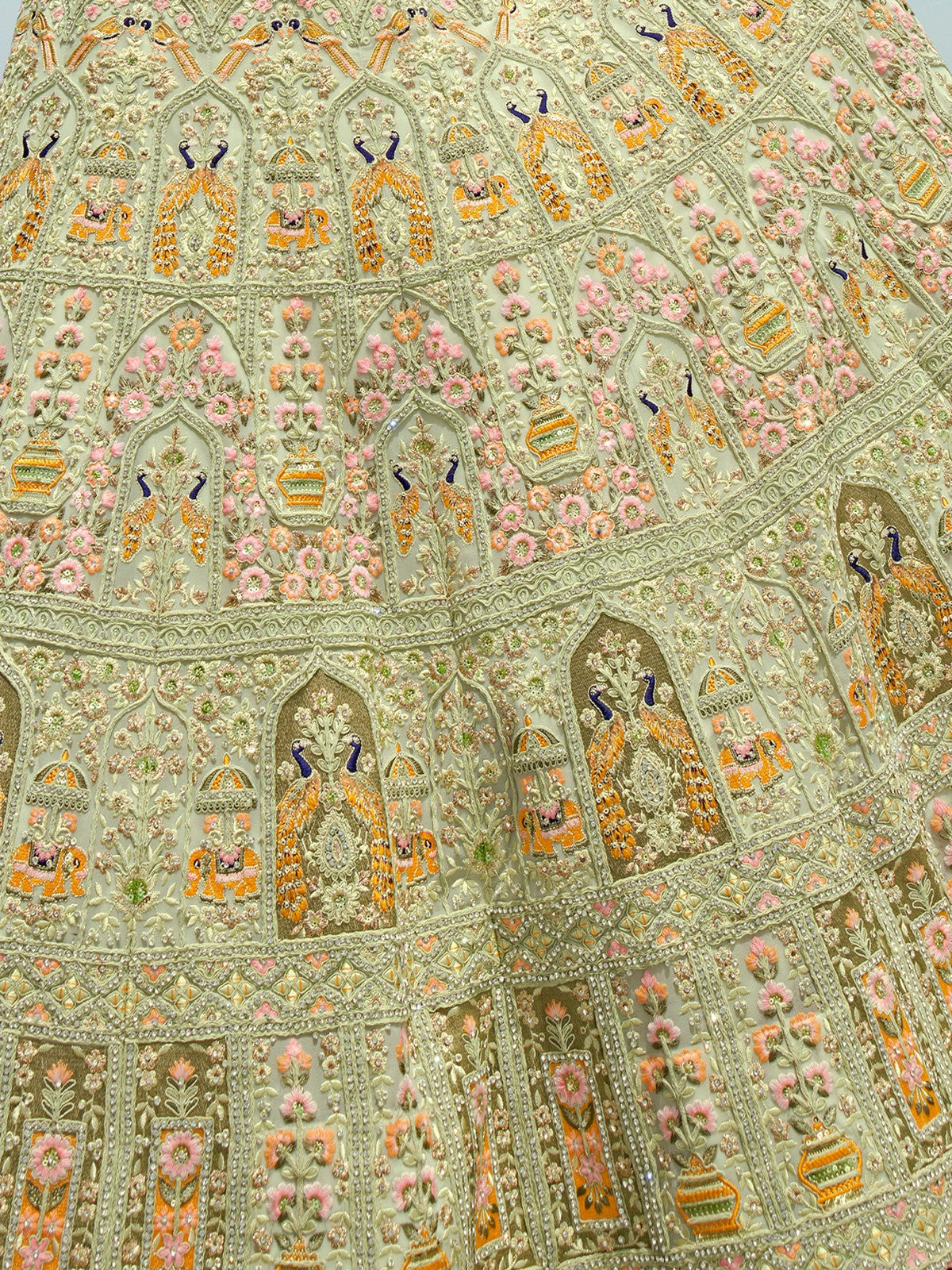 Add light to the celebration called life beaming in this lehenga, choli and dupatta set. Crafted on Georgette, the set is beautified with Dori, Thread,Zarkan work.