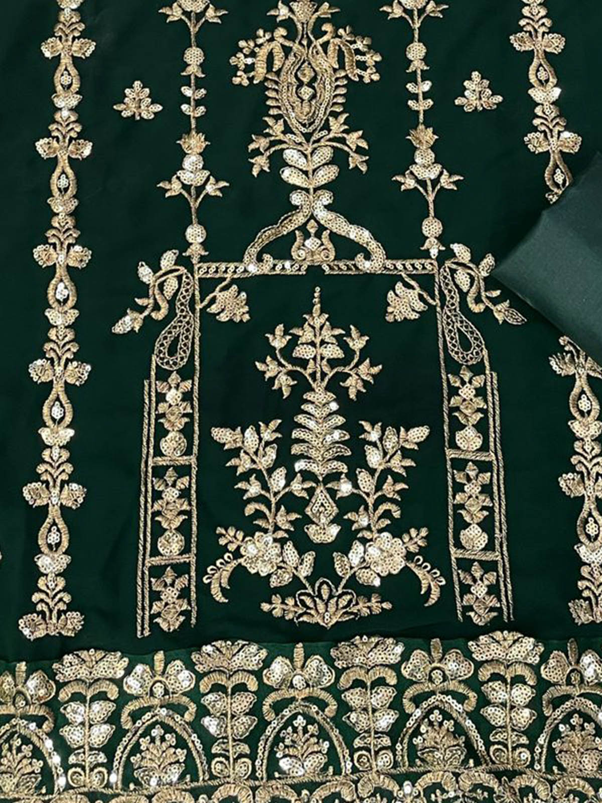 Green colored suit is prettified with heavy floral Sequins embroidered work as shown which makes it appear classy. This top is made of georgette fabric which is accompanied with santoon bottom, inner and embroidered net dupatta. Women can buy this suit to wear for their parties, sangeet. Festive and functions.
