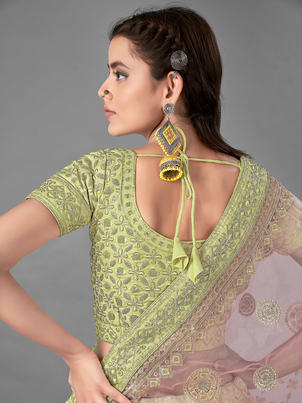 Add light to the celebration called life beaming in this lehenga, choli and dupatta set. Crafted on satin, the set is beautified with Dori, Zarkan, Thread work.