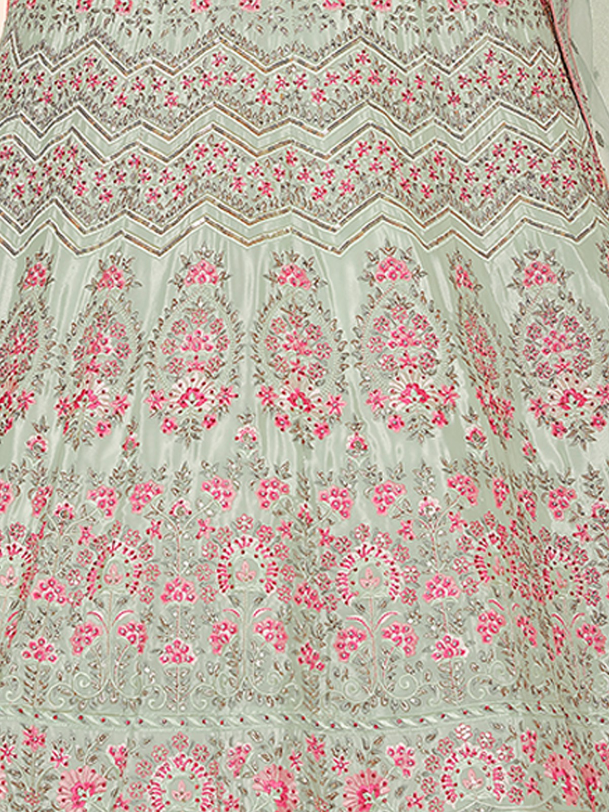Add light to the celebration called life beaming in this lehenga, choli and dupatta set. Crafted on crepe, the set is beautified with Thread, Sequins, Zarkan work.