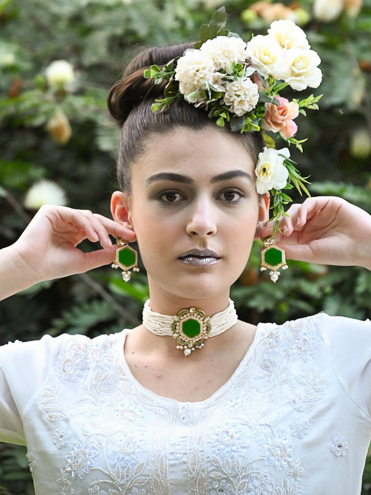 Rajwada Women Green-White Pearl-Kundan Traditional Necklace