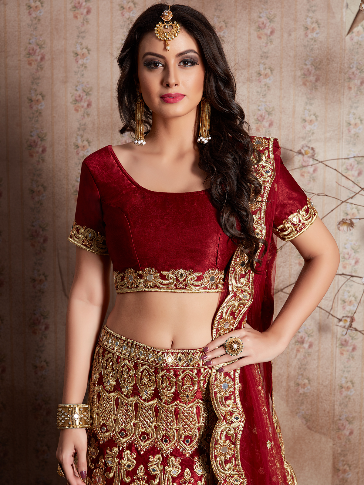 Add light to the celebration called life beaming in this lehenga, choli and dupatta set. Crafted on velvet silk, the set is beautified with Zari, Mirror, Dori work.