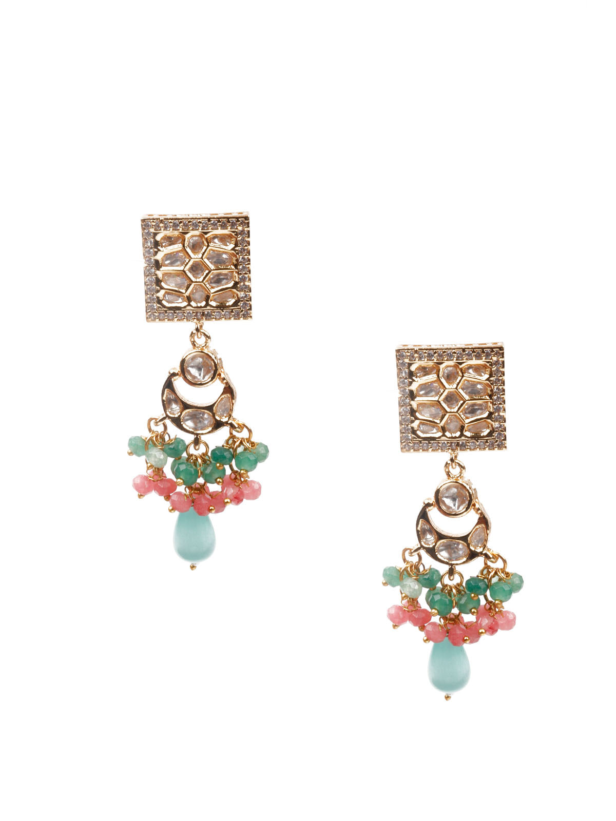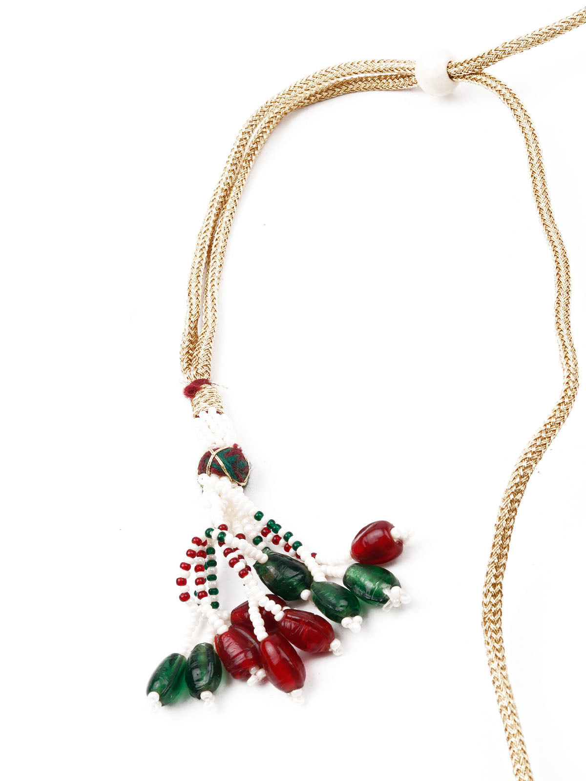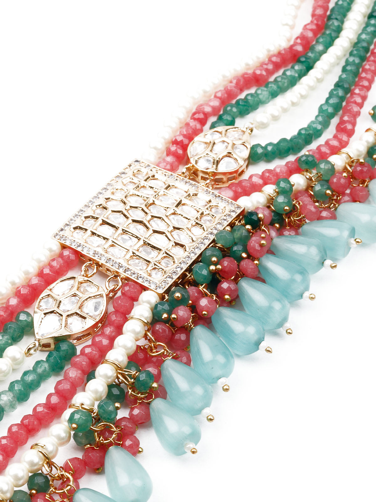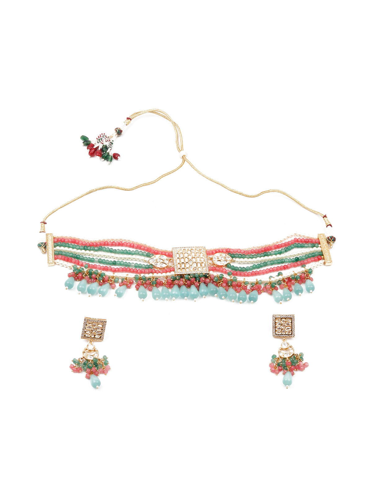 Spruce up your look with this imitation gold plated, studded with pearls and stones, choker necklace with matching earrings set. The interestingly designed choker neckpiece is decorated with white, pink, and green beads and white stones and is flanked by equally statement earrings. The set is made beautiful with stones, pearl accents and intricate work. 1. Intricate design 2. Studded with white, pink and green beads and white stones 3. Compliments Indian look 3. Choker Necklace Pattern 4. With Matching Earrings