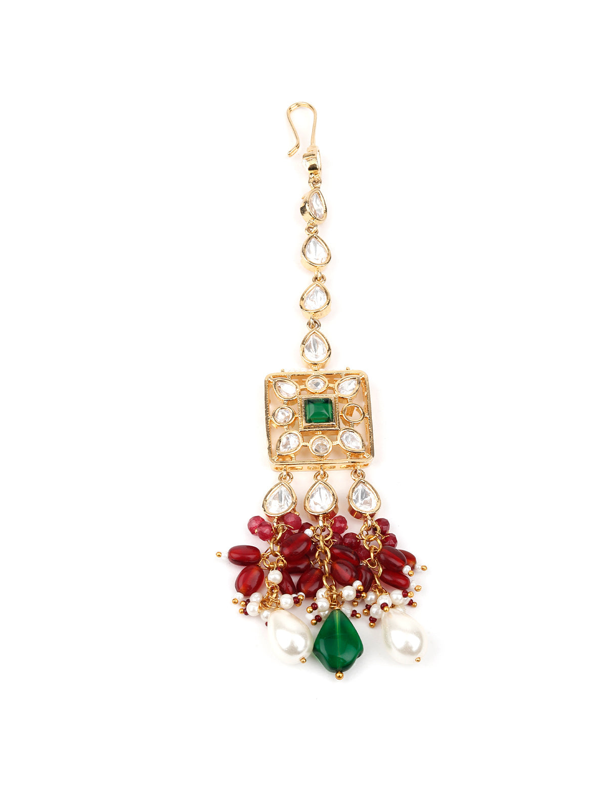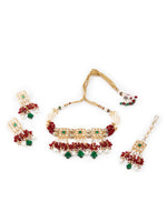 Spruce up your look with this imitation Gold plated, and studded with pearls and stones, choker necklace with matching earrings set. The intricately designed choker neckpiece is crafted in choker style and decorated with red, and green beads and white stones and is flanked by equally statement earrings and maangteeka. The set is made beautiful with stones, pearl accents and intricate work. 1. Intricate design 2. Studded with green and red beads and white stones 3. Compliments Indian look 3. Choker Style Necklace Pattern 4. With Matching Earrings and Maangteeka