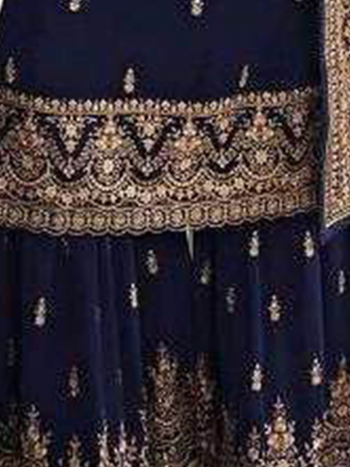 Bring in a wisp of grace and freshness to your dressing style with this aqua blue colored sharara suit. This georgette top comes along with Georgette bottom, santoon inner for top and bottom, and embroidered georgette dupatta. The beautiful suit uniquely crafted with elegant sequence embroidery work which makes this suit perfect for a woman. Women can buy this suit to wear for their parties, festive, functions, kitties, weekend get together.