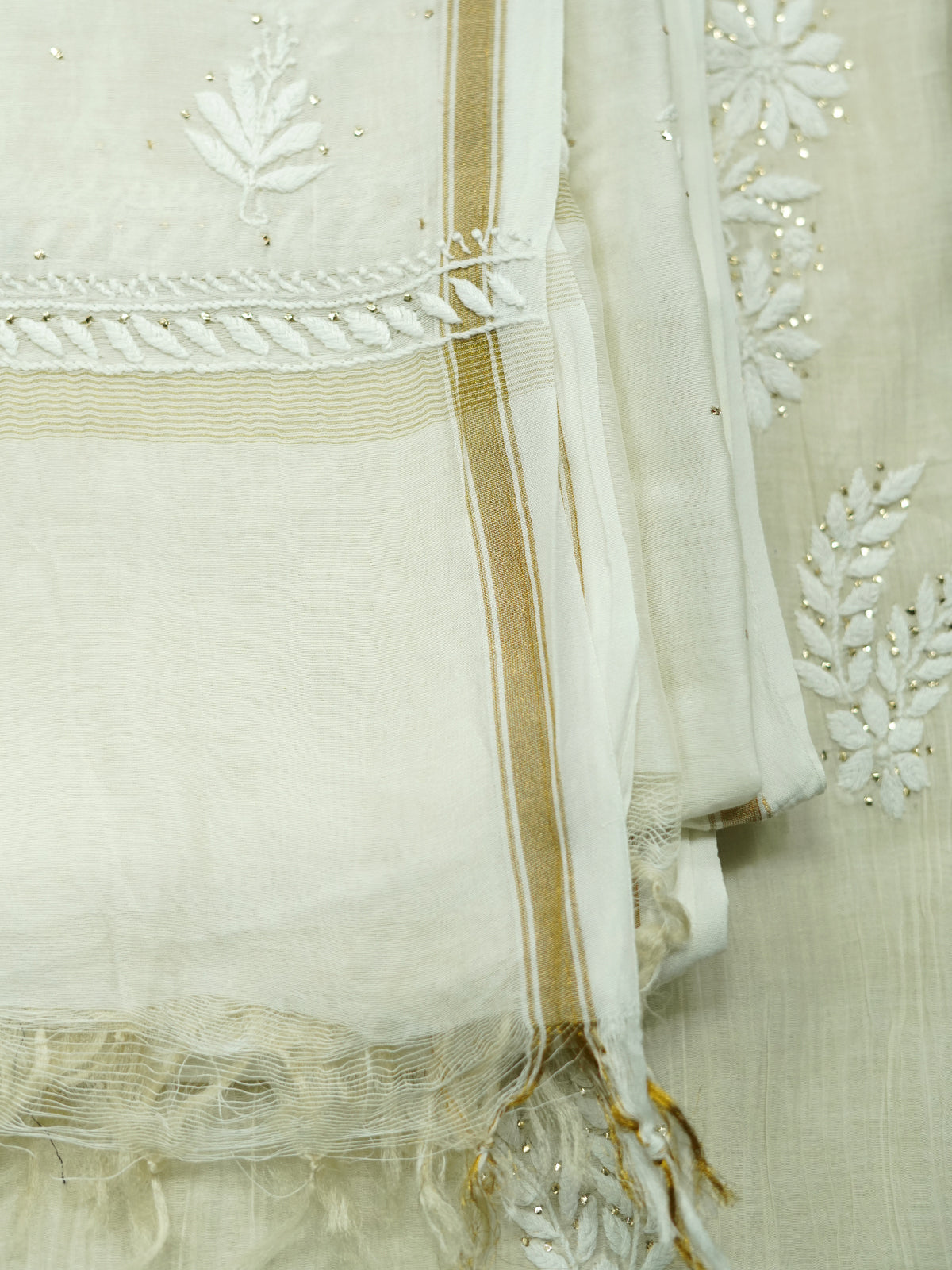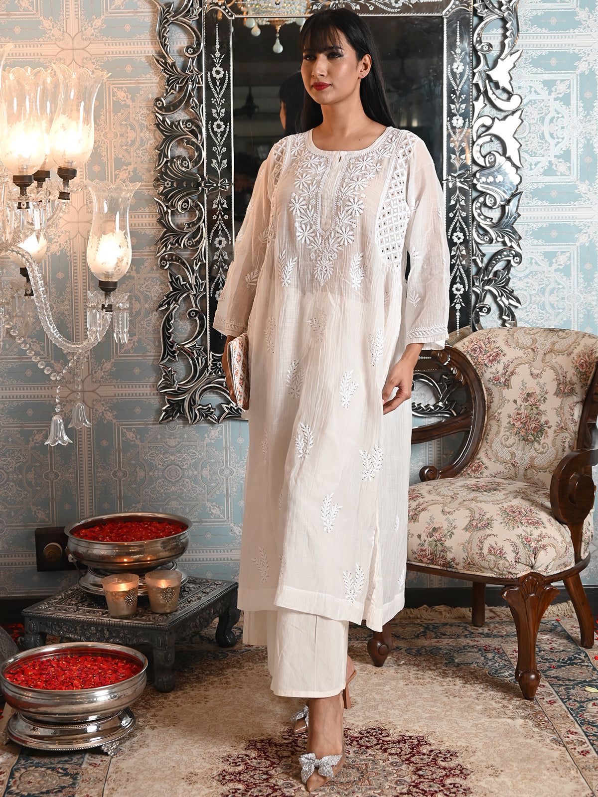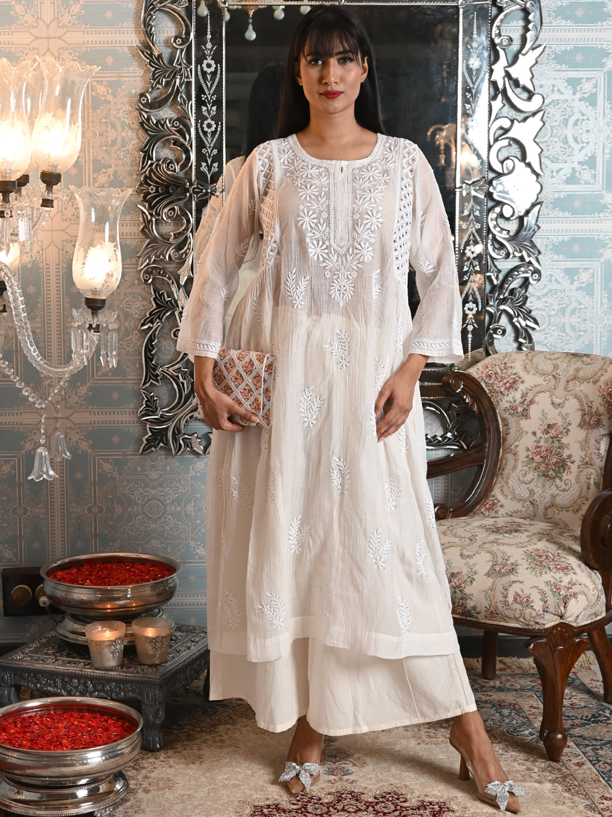 An off-white cotton voile kurta set featuring intricate Chikankari and Mukaish work embroidery, offering a timeless blend of grace and craftsmanship.