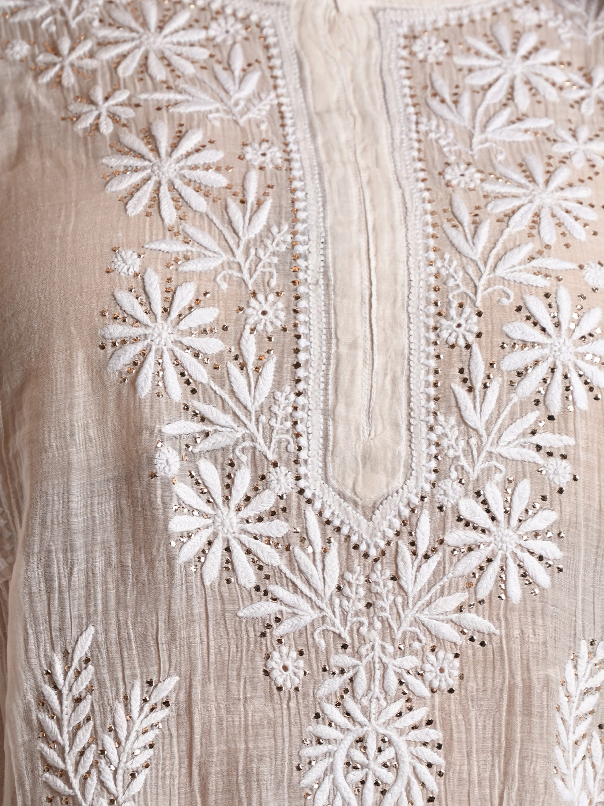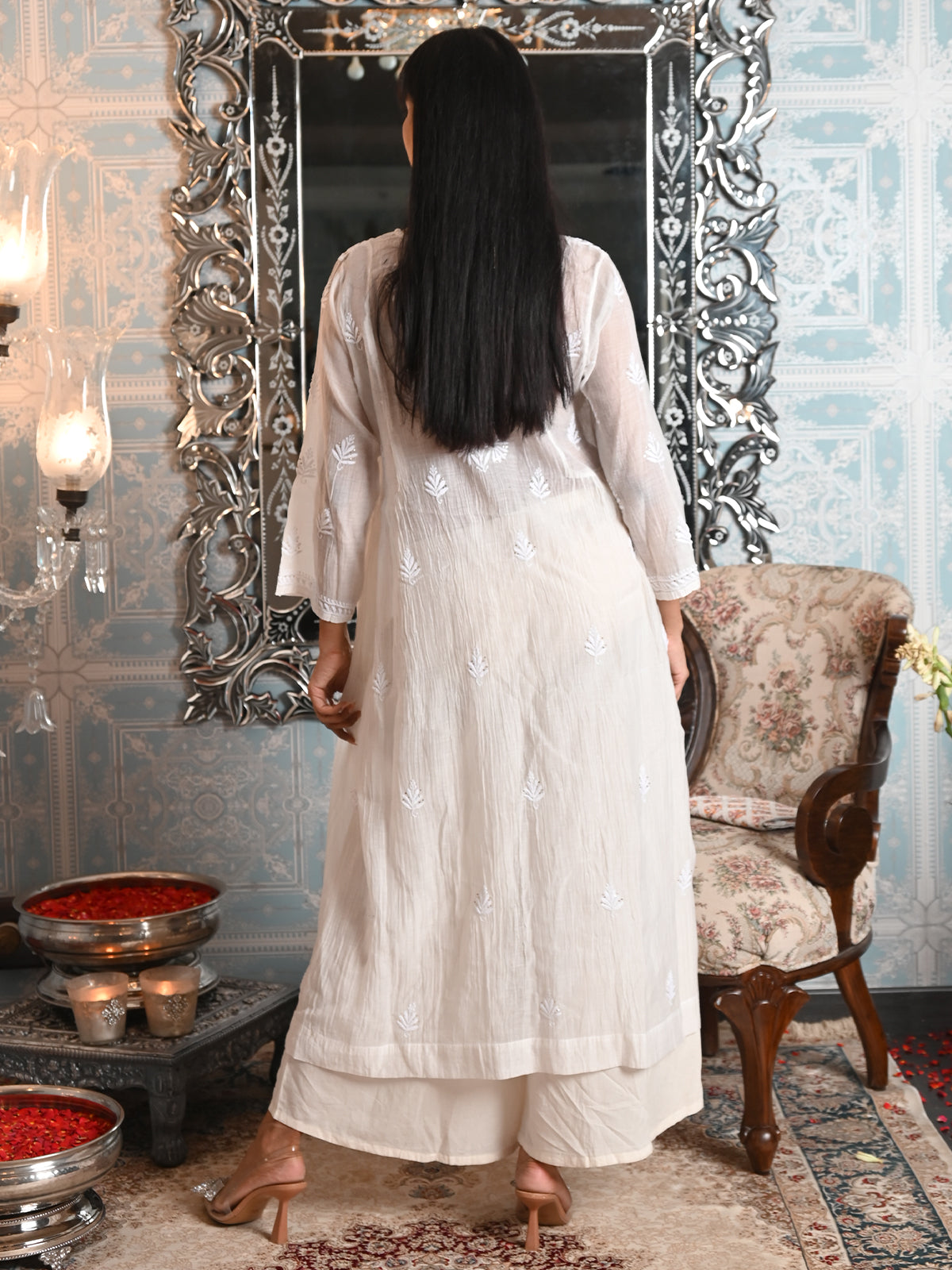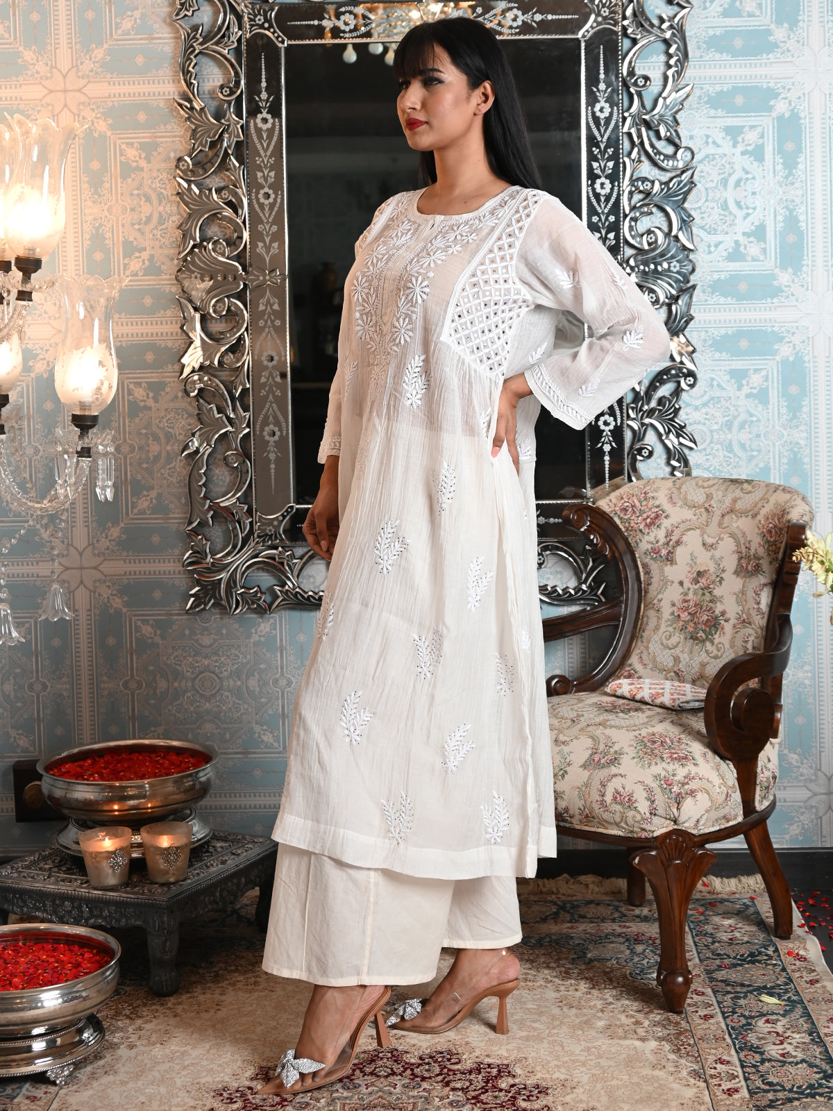 An off-white cotton voile kurta set featuring intricate Chikankari and Mukaish work embroidery, offering a timeless blend of grace and craftsmanship.