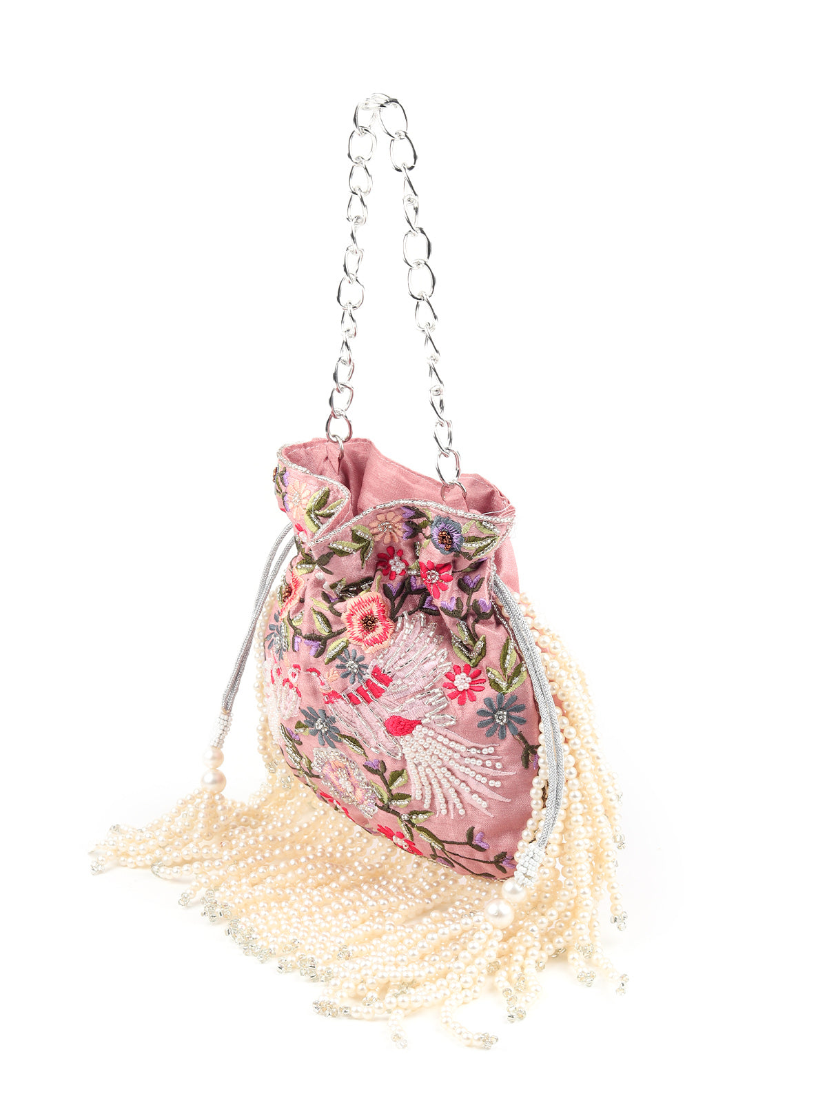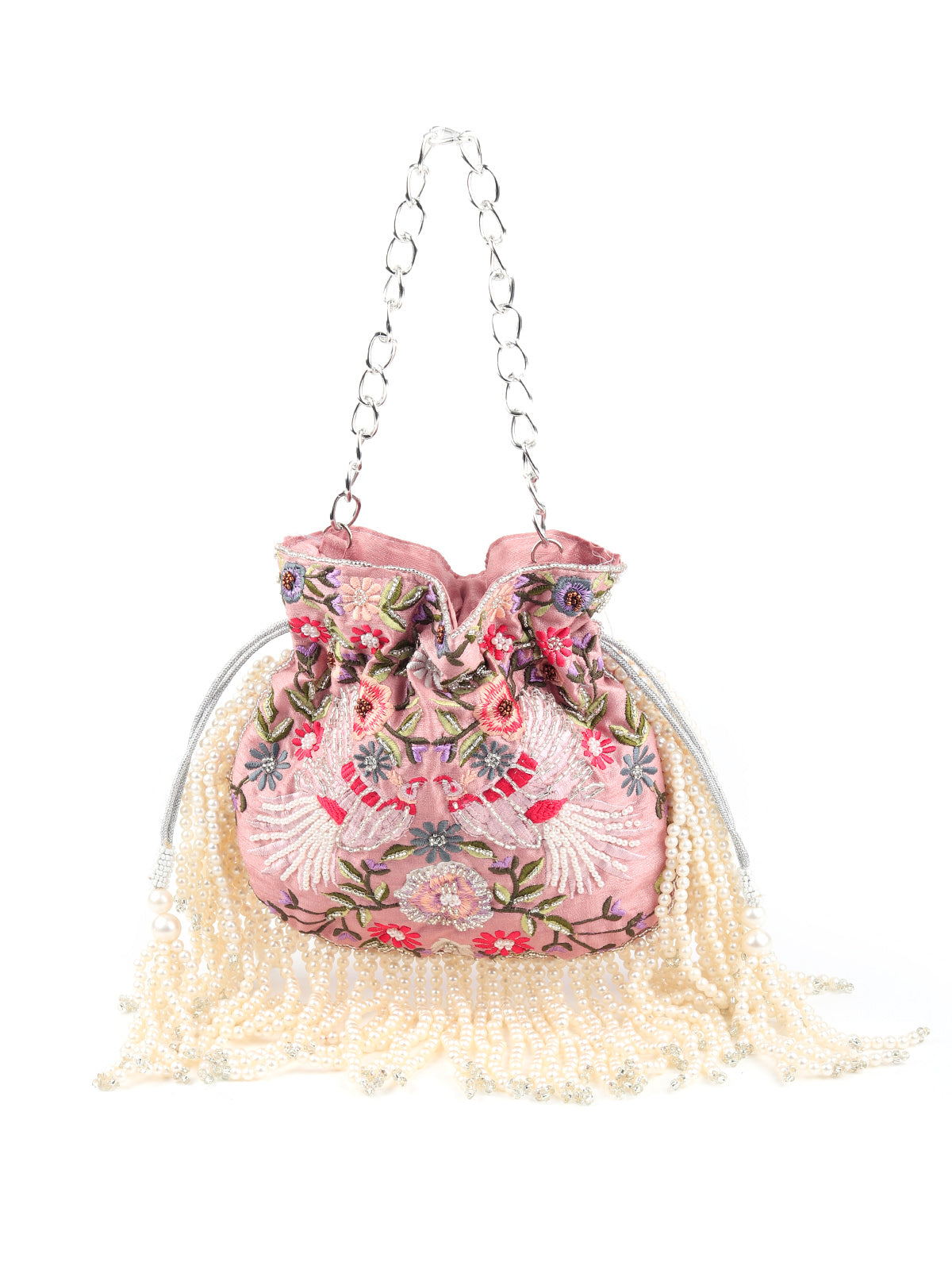 - Potli has its frontal region embroidered and beaded with faux pearls and glass beads.