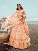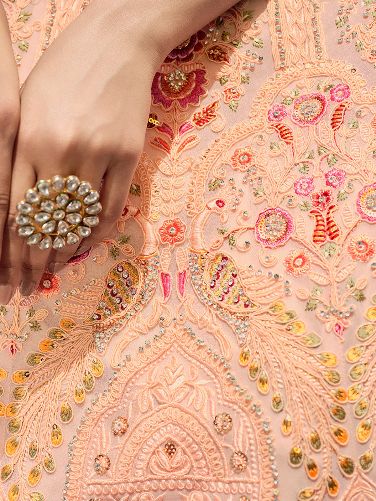 Add light to the celebration called life beaming in this lehenga, choli and dupatta set. Crafted on Georgette, the set is beautified with Dori, Thread,Zarkan work.