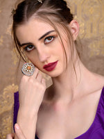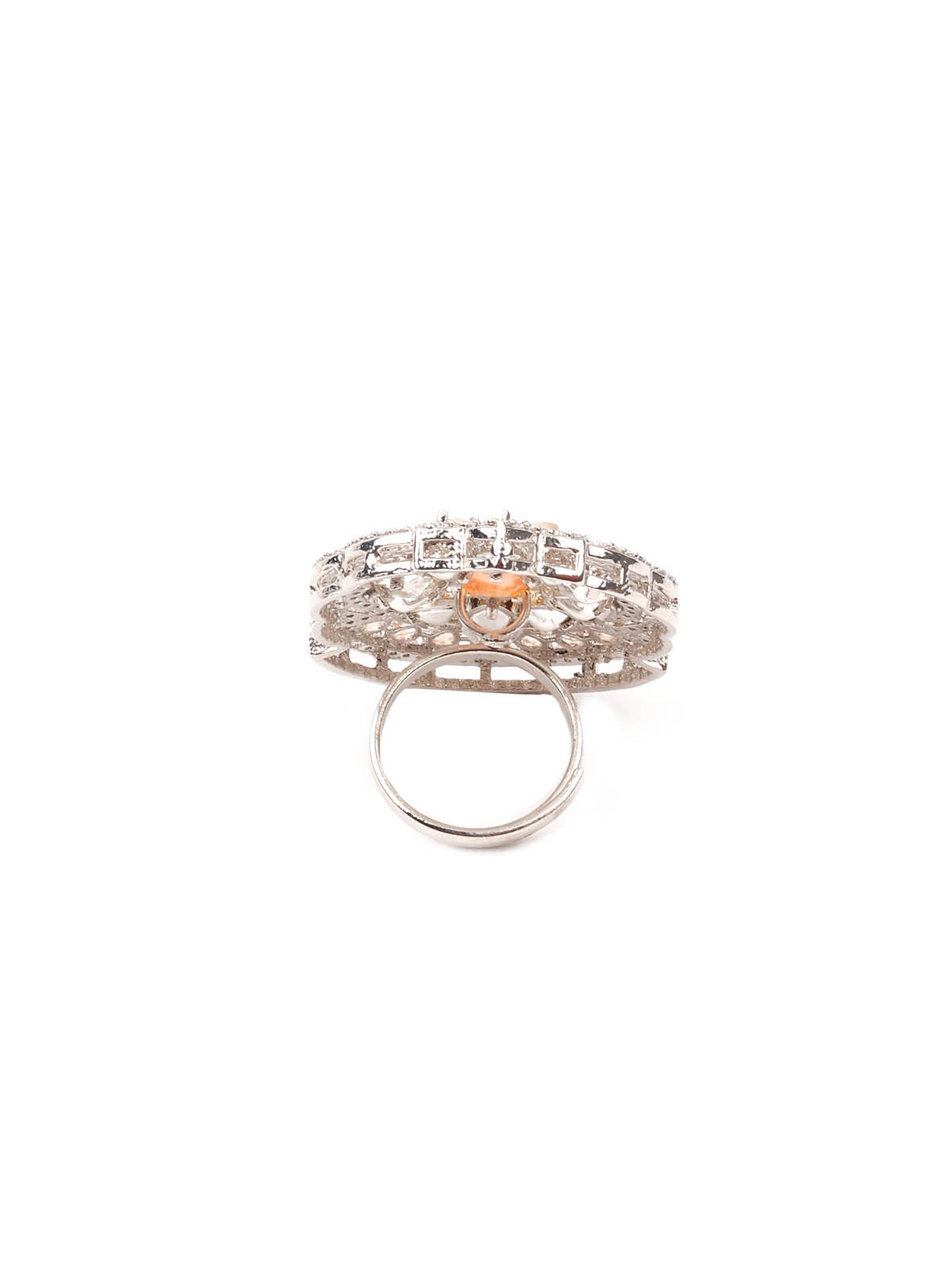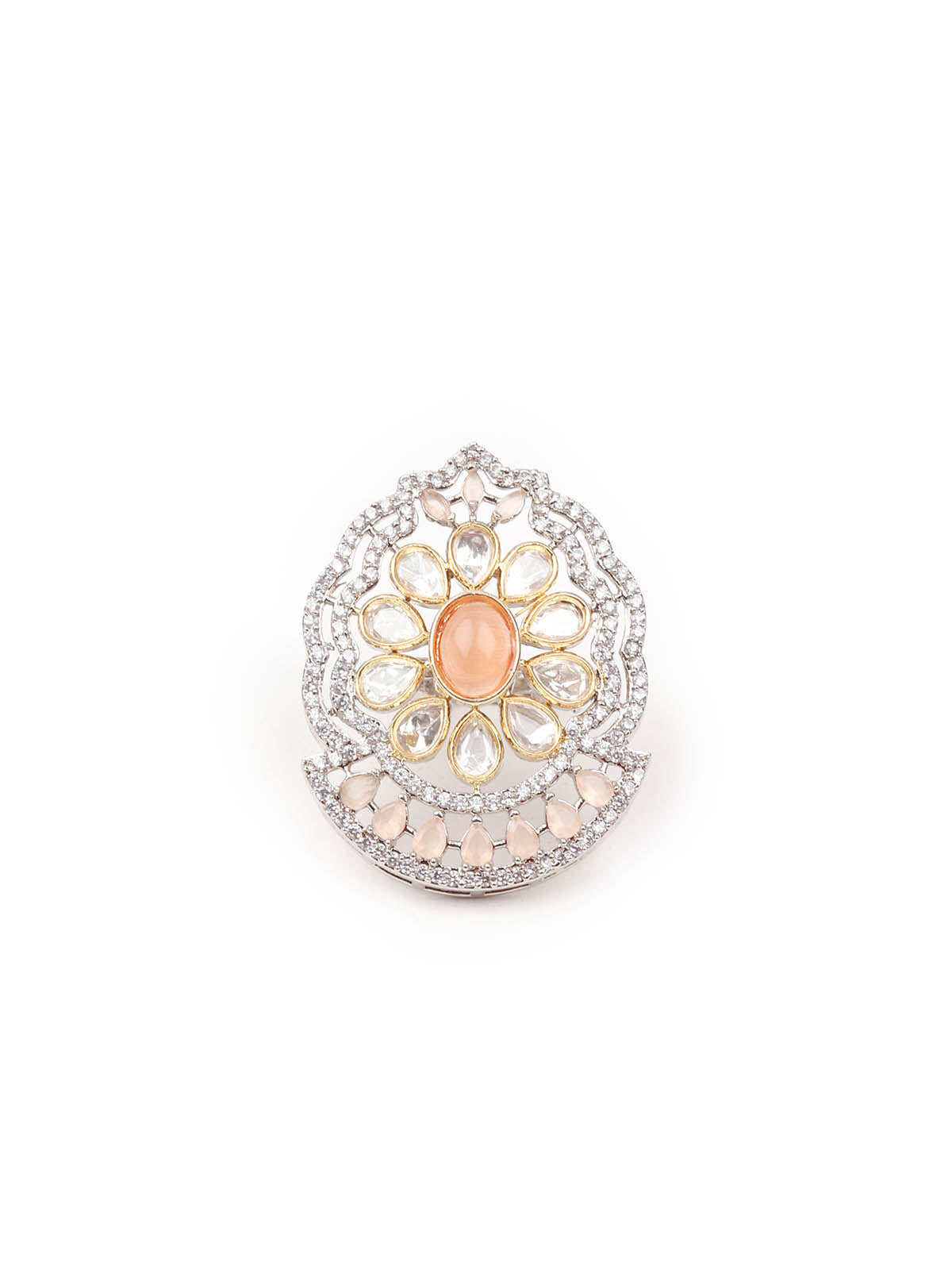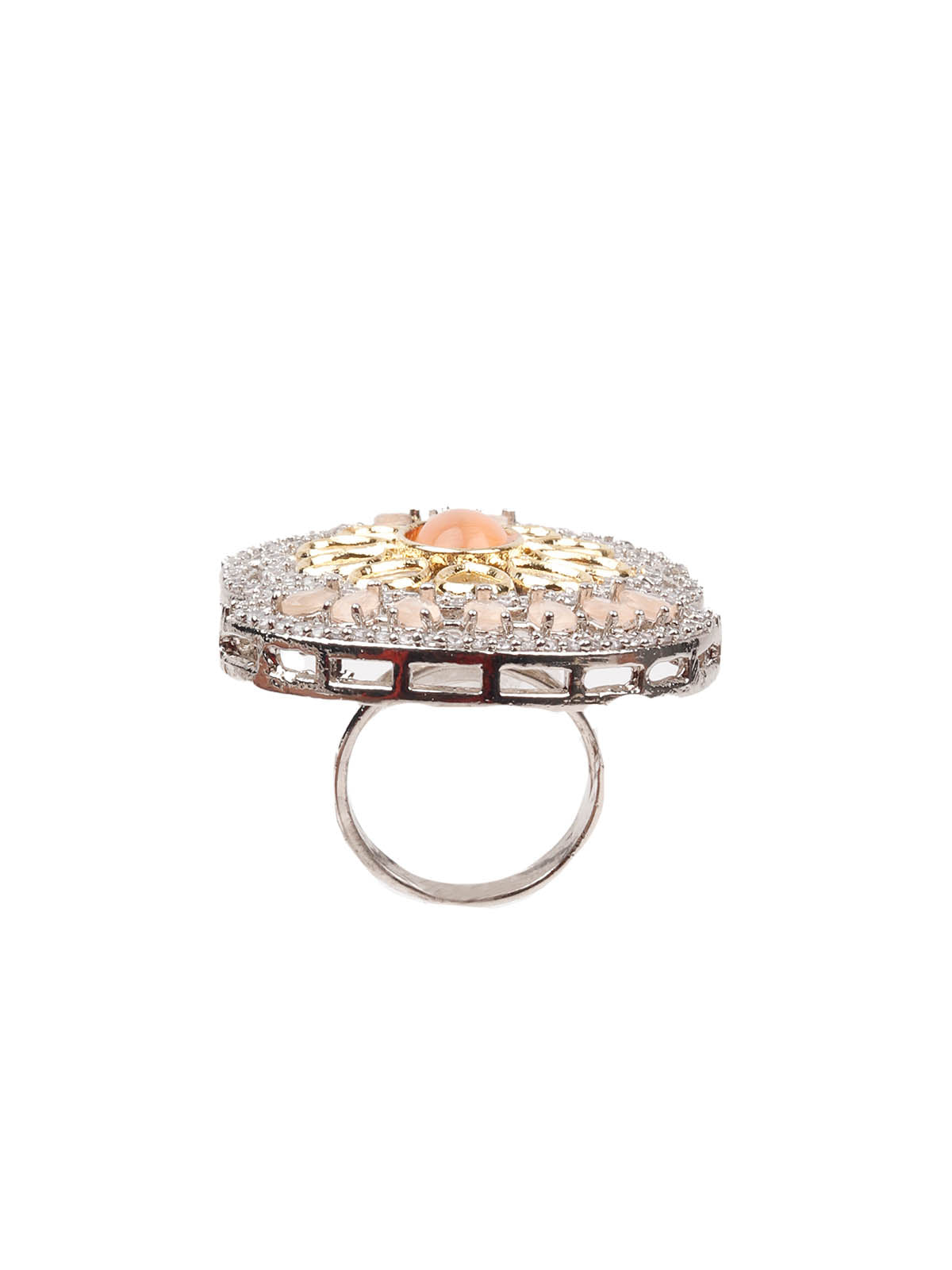 The mixed metal ring is made in gold color and is embellished with peach and white faux stones and is very stylish. It easily blends with Indian or Indo-western dresses. Add to your glam factor with this one. 1. White and Peach Faux Stones 2. Mixed Metal 3. Gold Mixed Metal