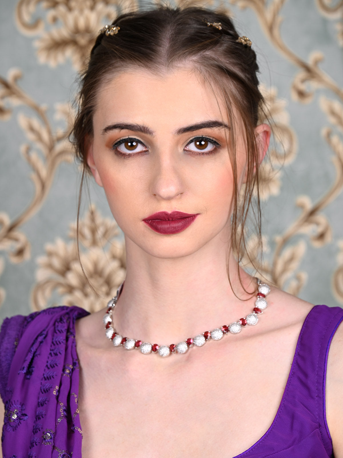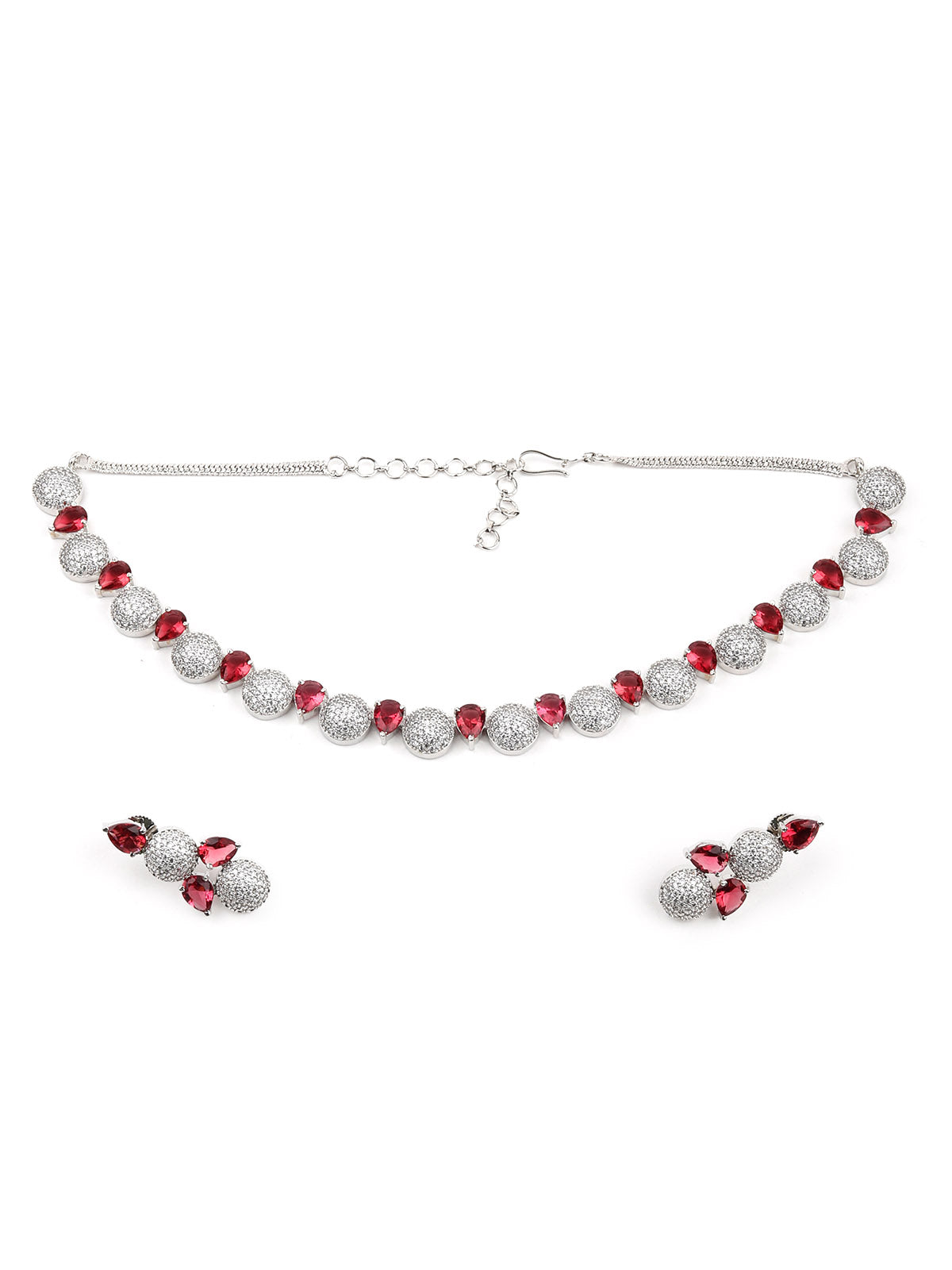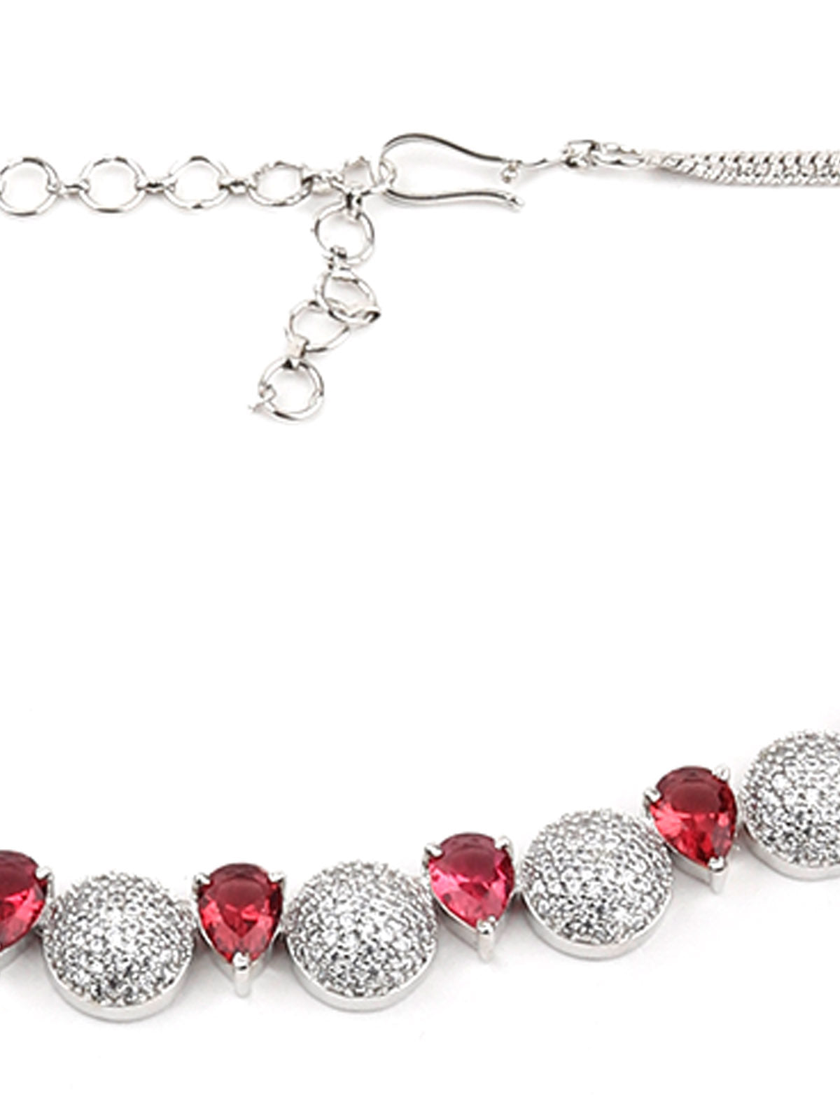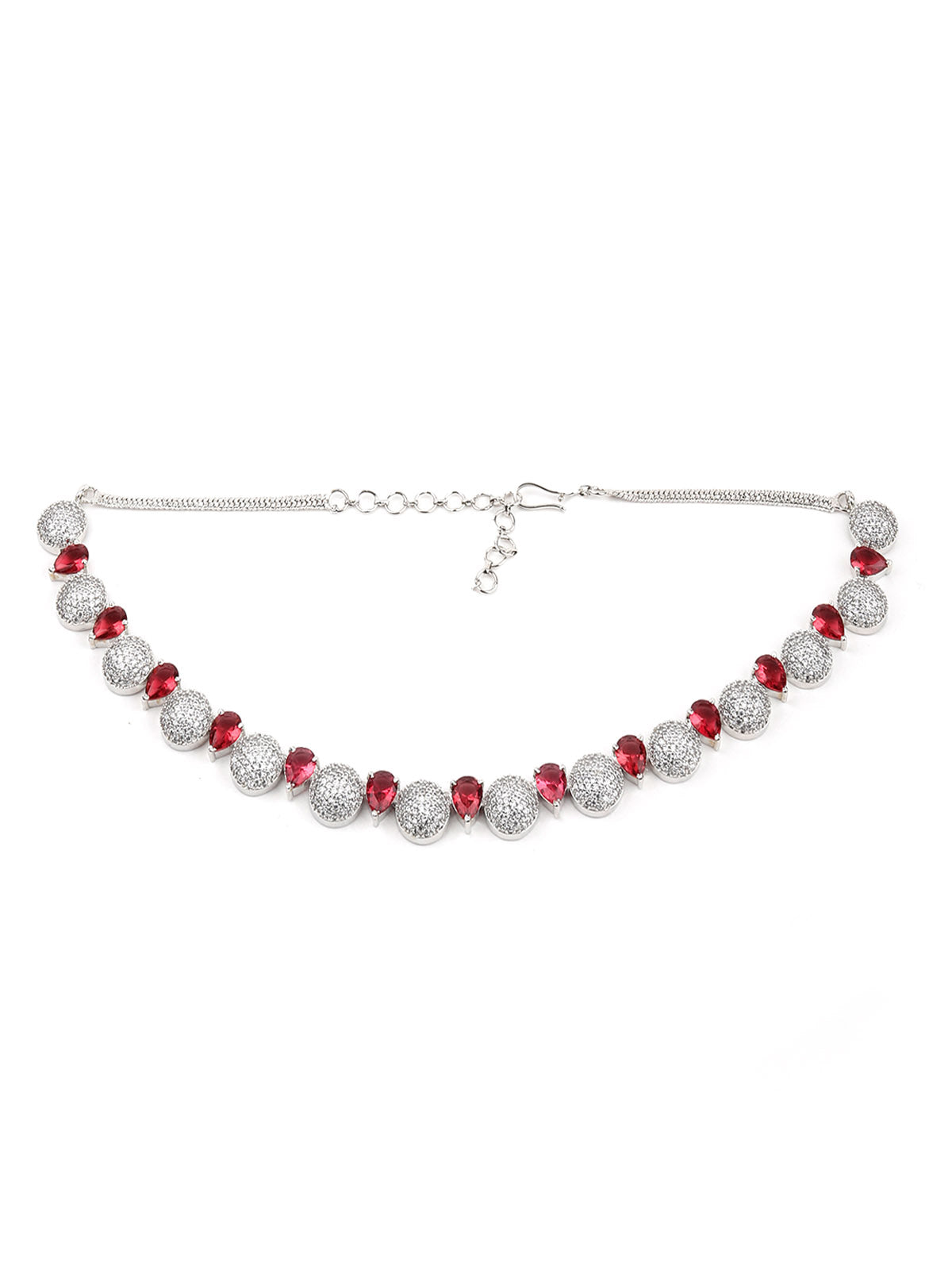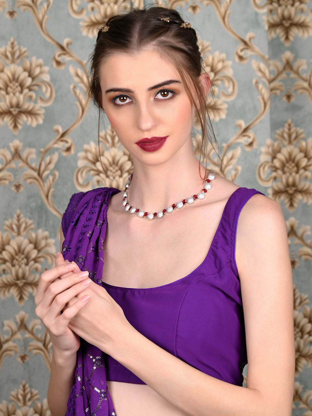 Spruce up your look with this lovely white and pink faux stone studded imitation necklace, that comes with matching earrings. The set is beautified with stones, and intricate work. 1. Intricate design 2. Studded with embellisements 3. Compliments Indian Look 3. Choker Necklace Pattern 4. With Matching Earrings