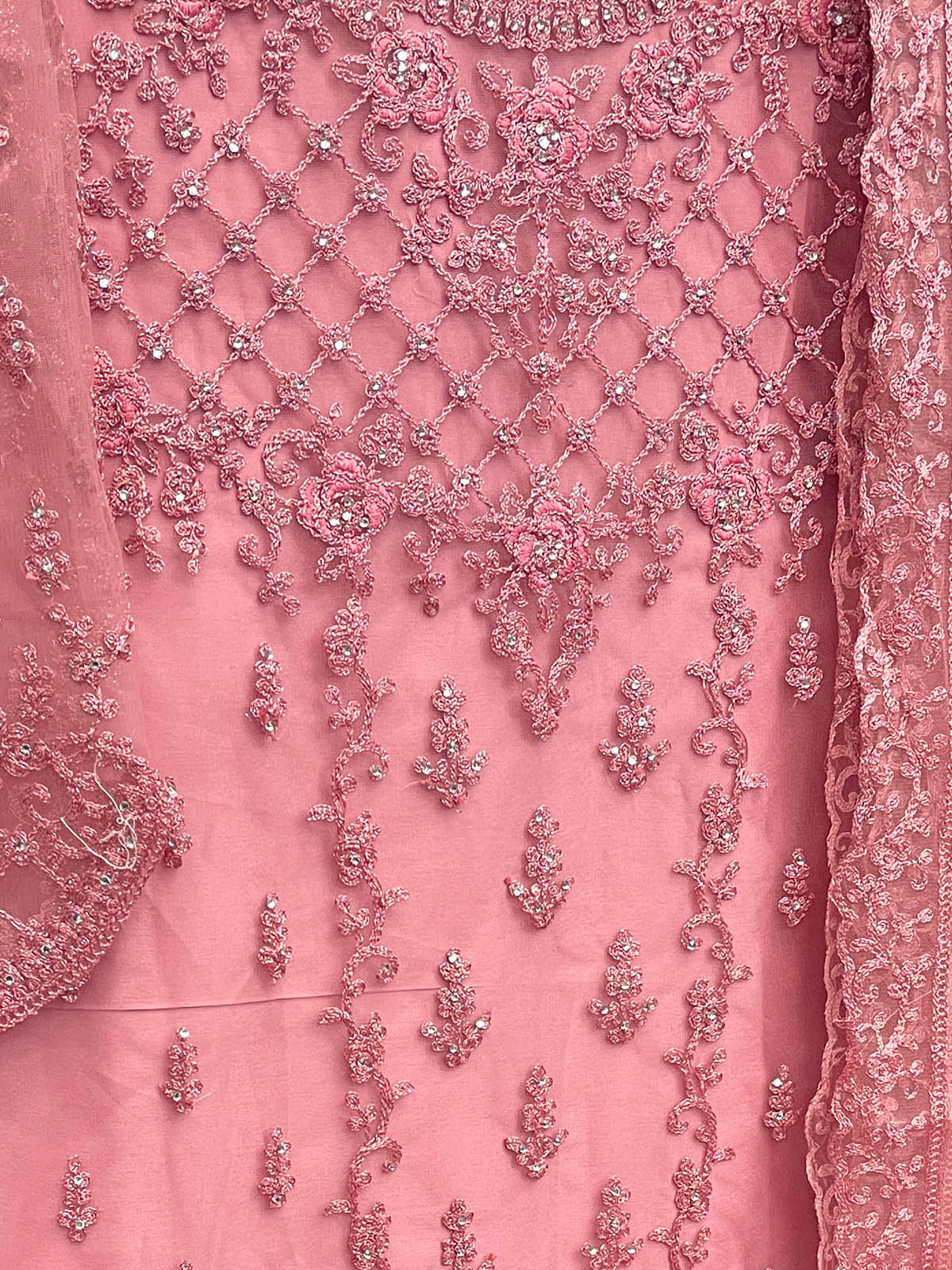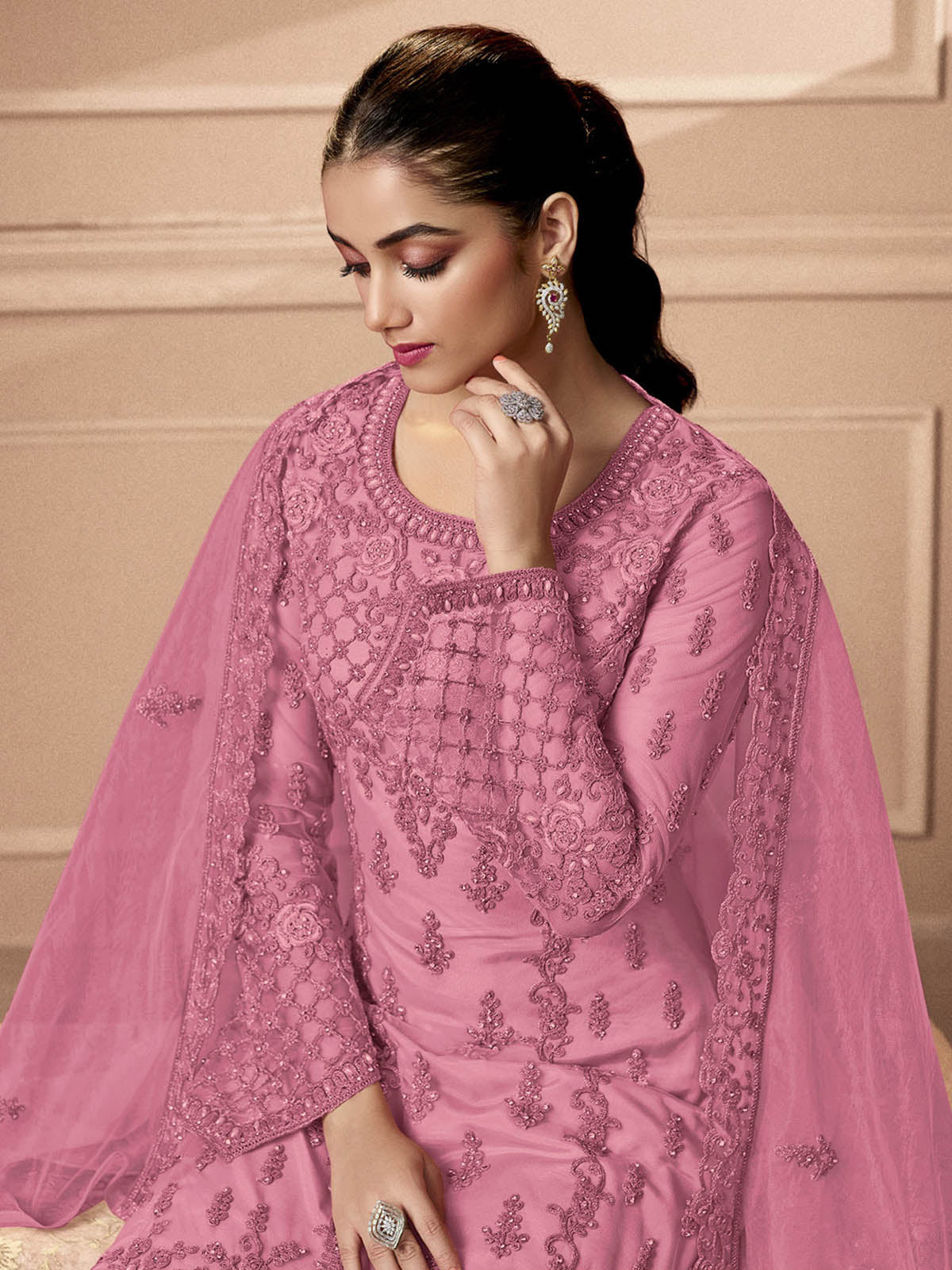 This pink colored suit is prettified with thread and sequence work as shown which makes it appear classy. The top is made of netted fabric accompanied with netted bottom, japan satin lining and netted dupatta. Women can buy this suit to wear for their parties, functions and event.