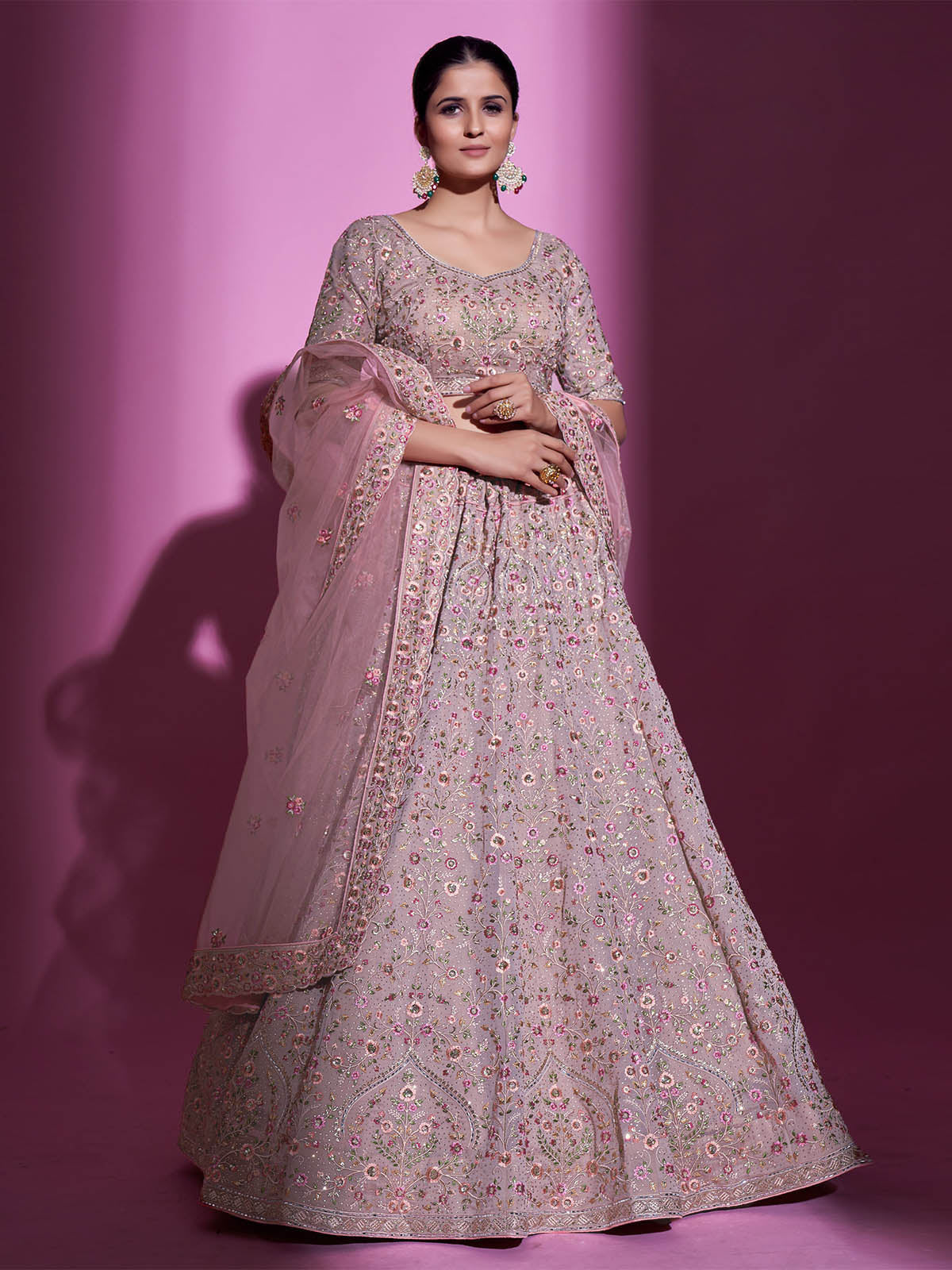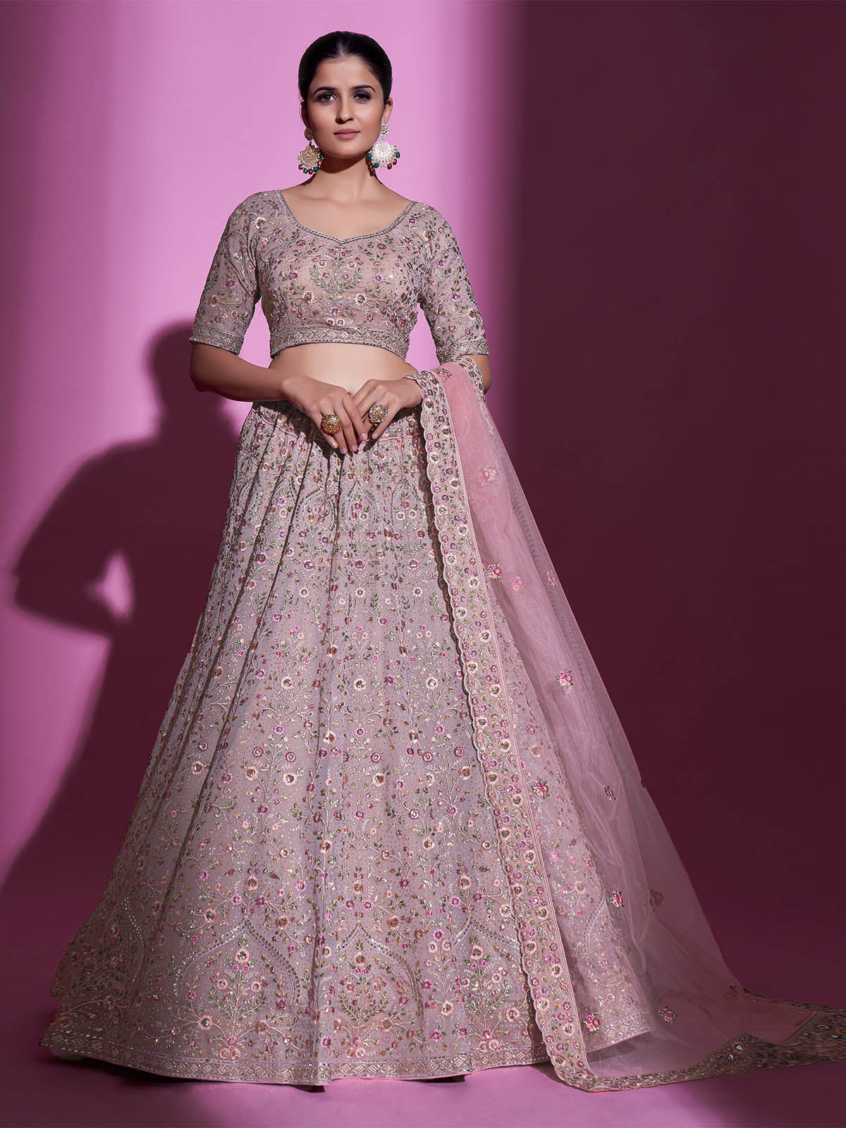 Steal the spotlight with this modern take on classic indo set. These lehenga and blouse are fabricated on georgette and paired With net dupatta. Beautified with Embroidered work