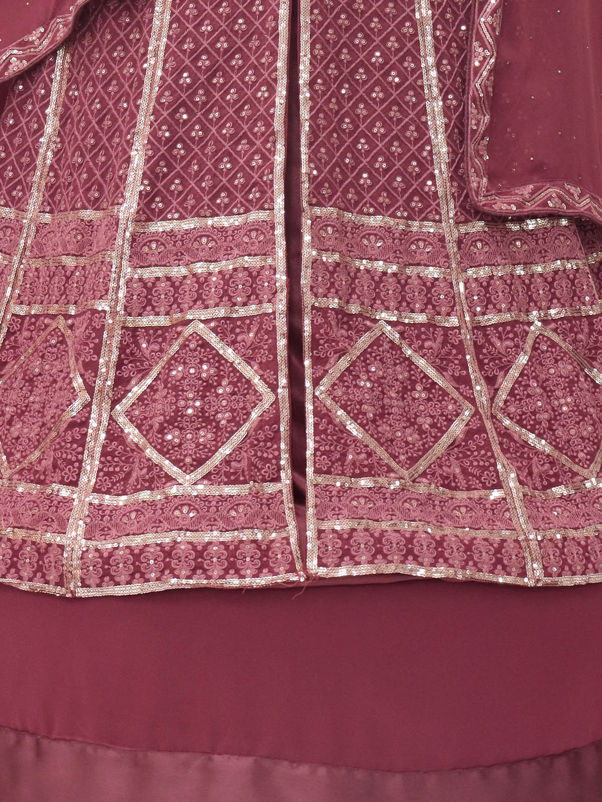 Create your own style let it be unique for yourself and identifiable for others by wearing this rose brown colored A line suit. The suit is beautified with amazing heavy sequence embroidery which is eye catching. This heavy faux georgette suit comes along with faux georgette unstitched bottom and heavy faux georgette with embroidery four side lace dupatta to complete the look. Women can buy this suit to wear for their upcoming functions, festivals, parties, event and occasions, where you want to be center of attraction.