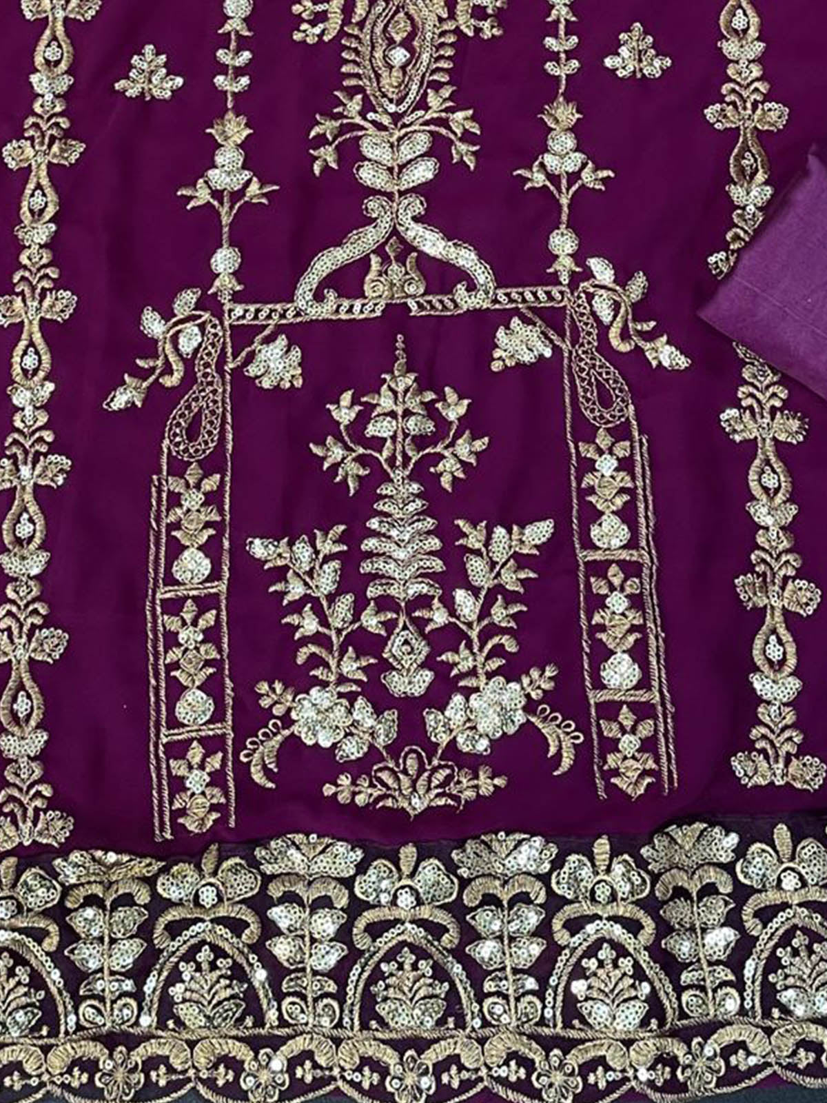 Purple colored suit is prettified with heavy floral Sequins embroidered work as shown which makes it appear classy. This top is made of georgette fabric which is accompanied with santoon bottom, inner and embroidered net dupatta. Women can buy this suit to wear for their parties, sangeet. Festive and functions.