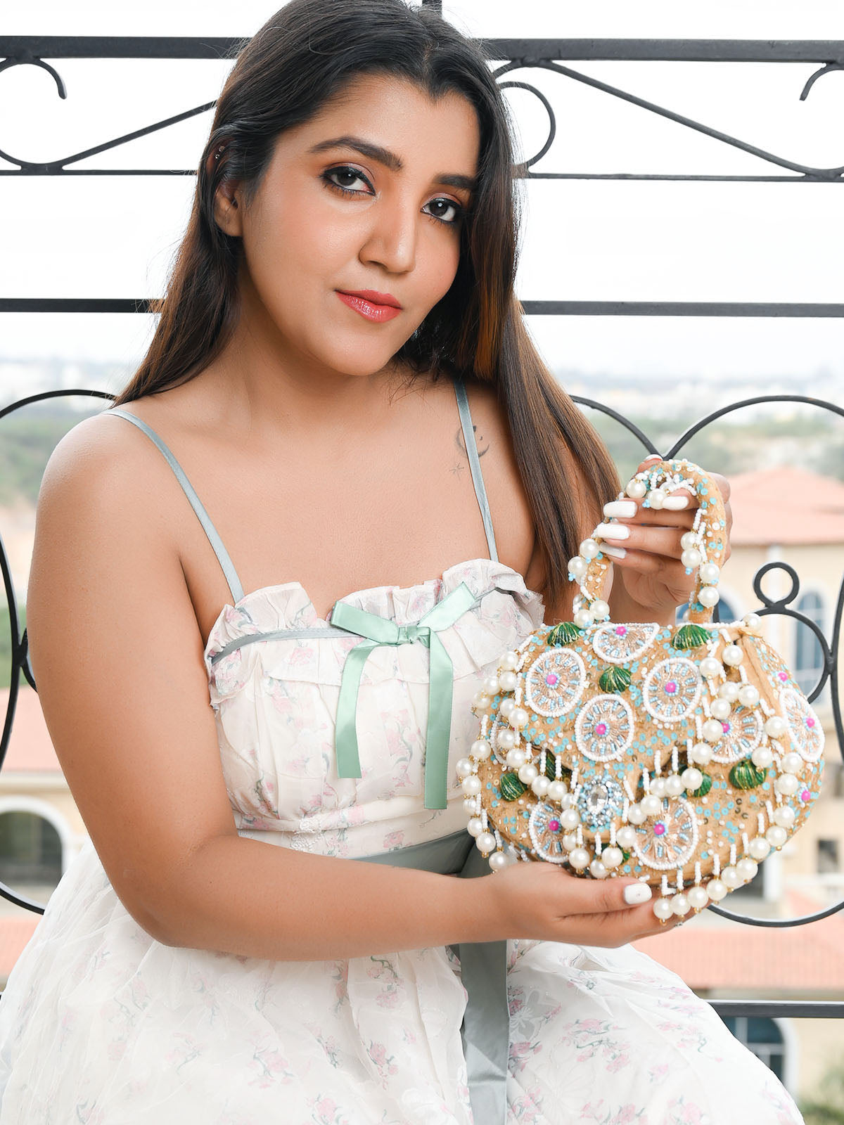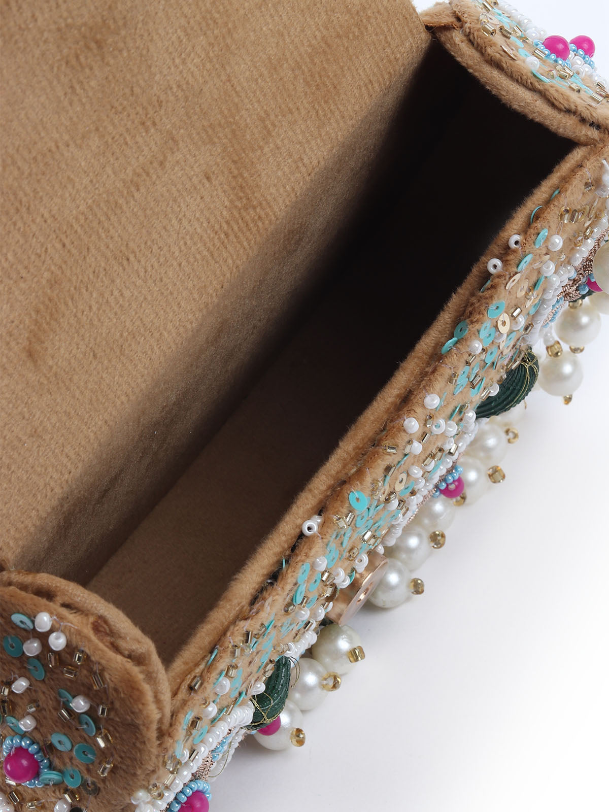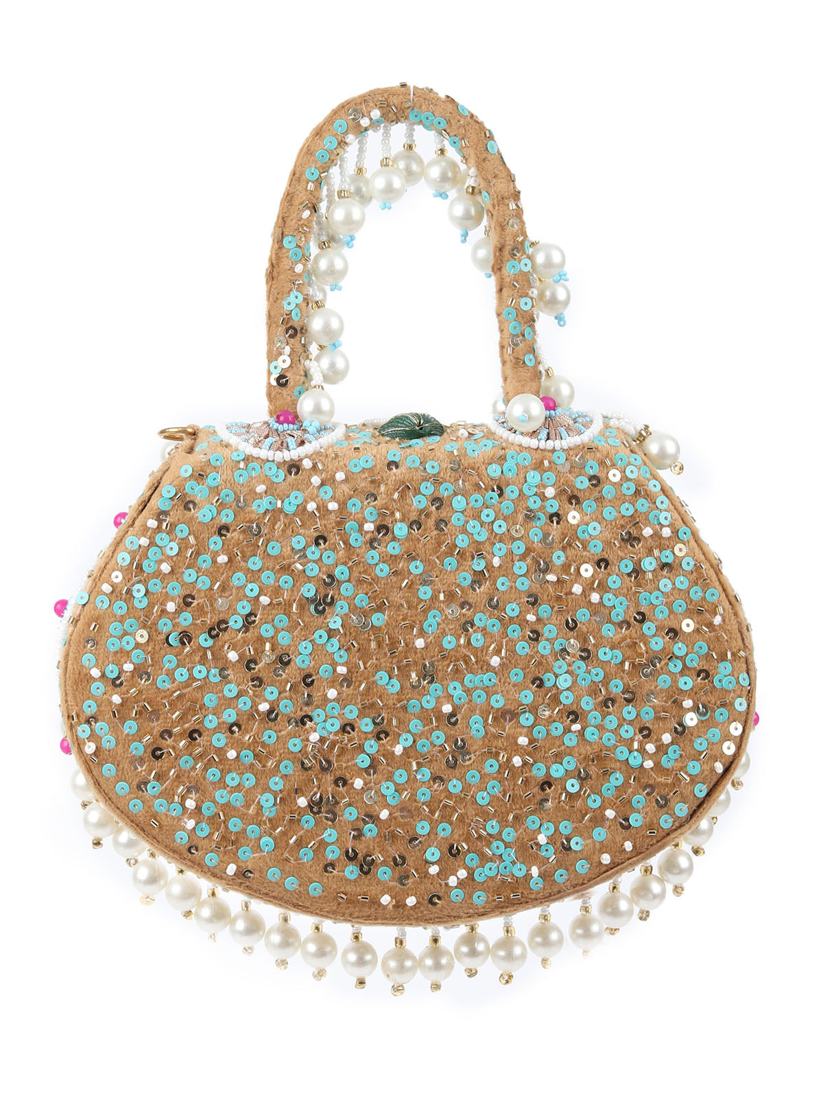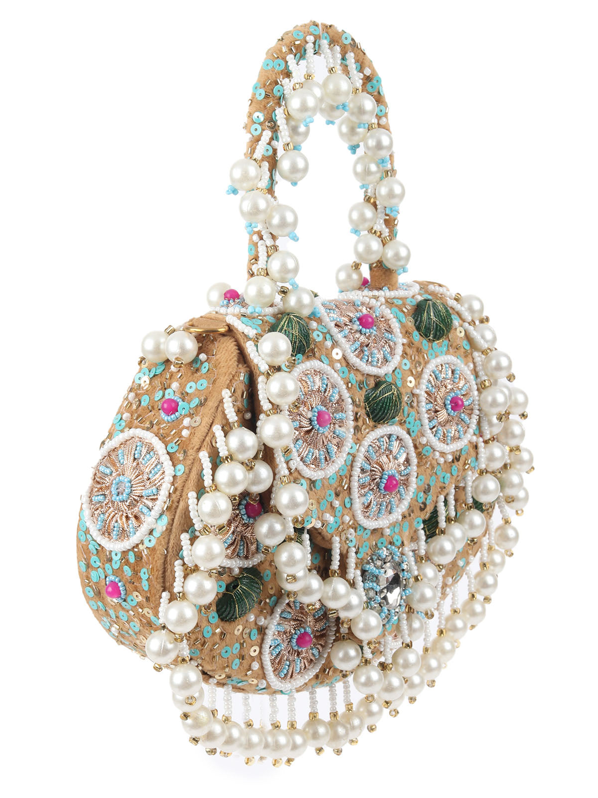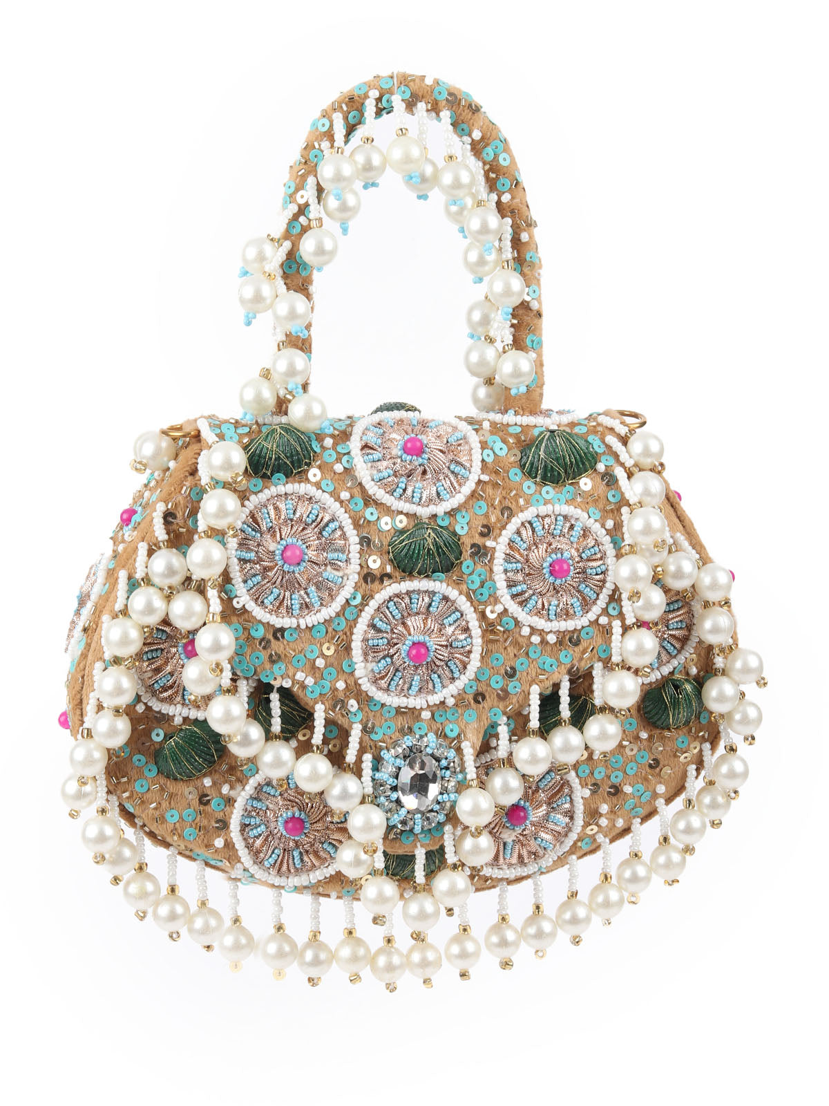 A charming beige boho-inspired bag, crafted with sequins, beads, shells, and playful tassels, adding a fun, carefree vibe to any look. Perfect for a touch of bohemian elegance.