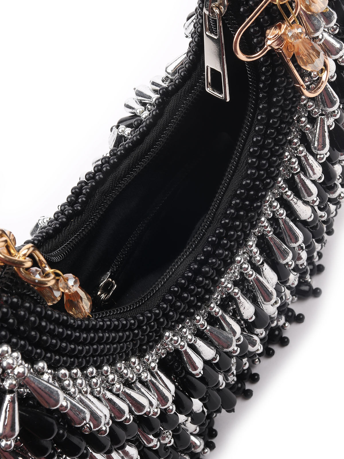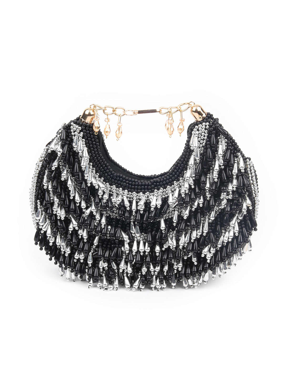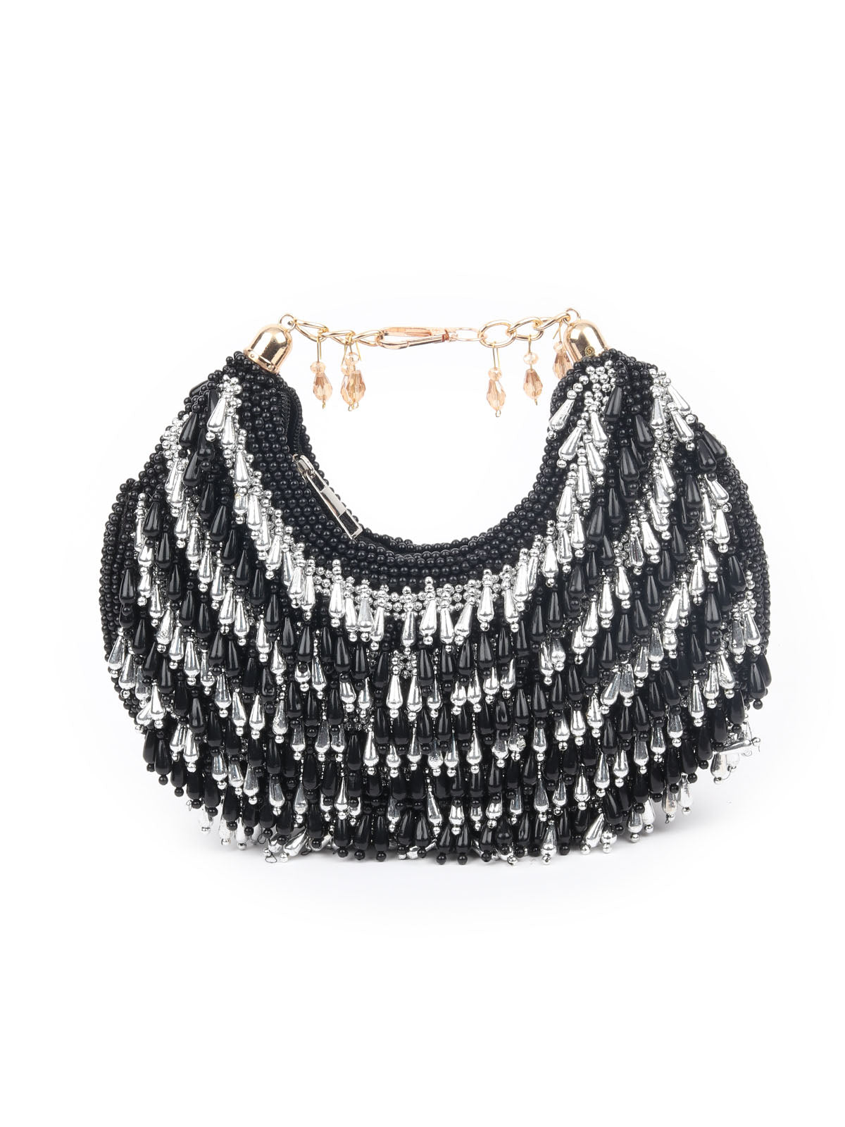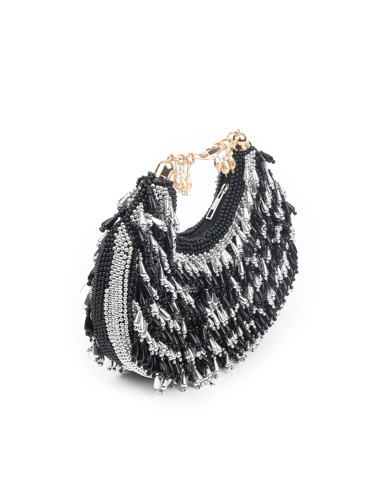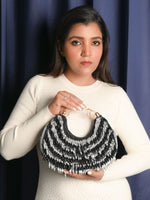 A striking silver and black bag, meticulously crafted with exquisite beadwork, offering a perfect blend of elegance and modern flair.