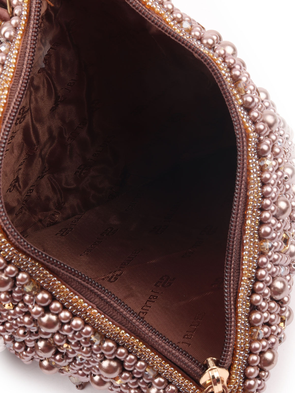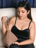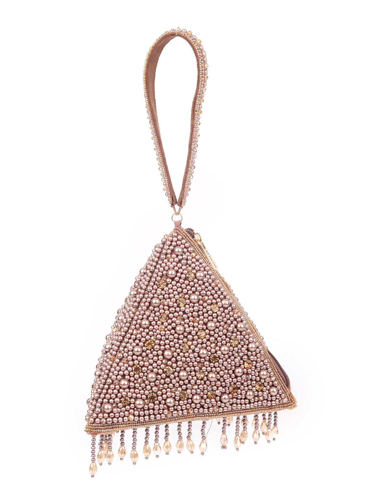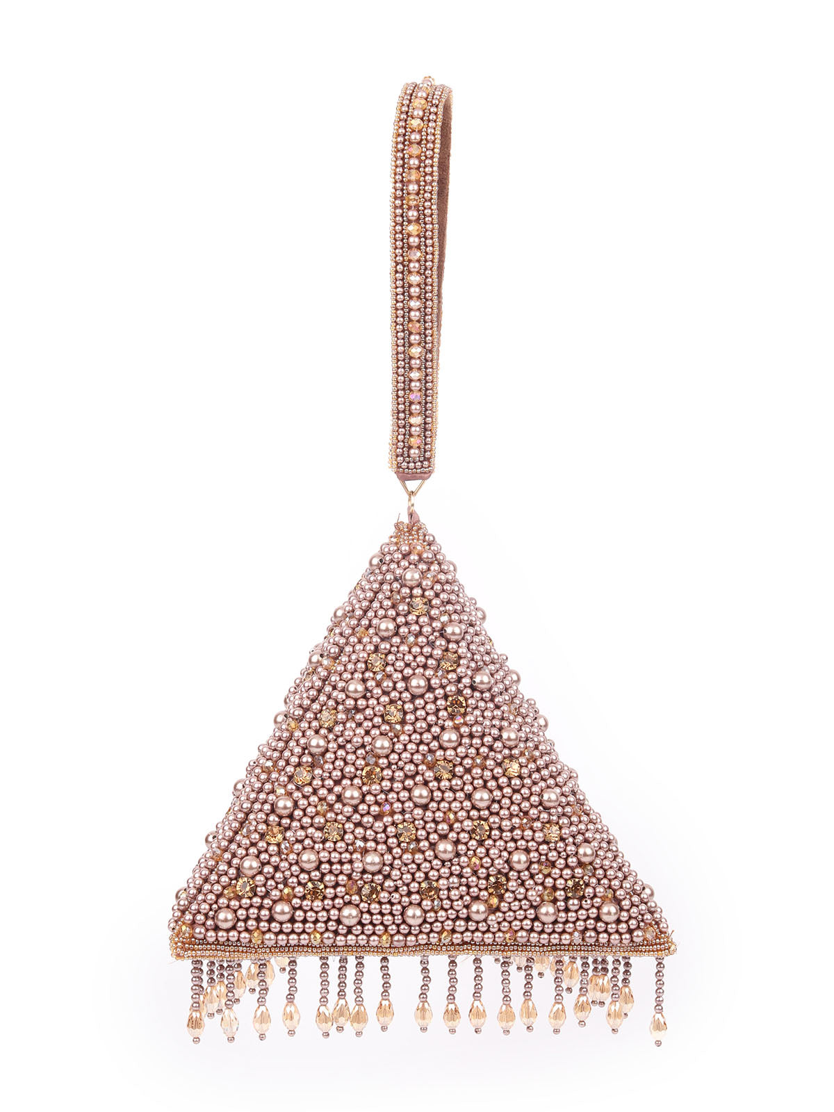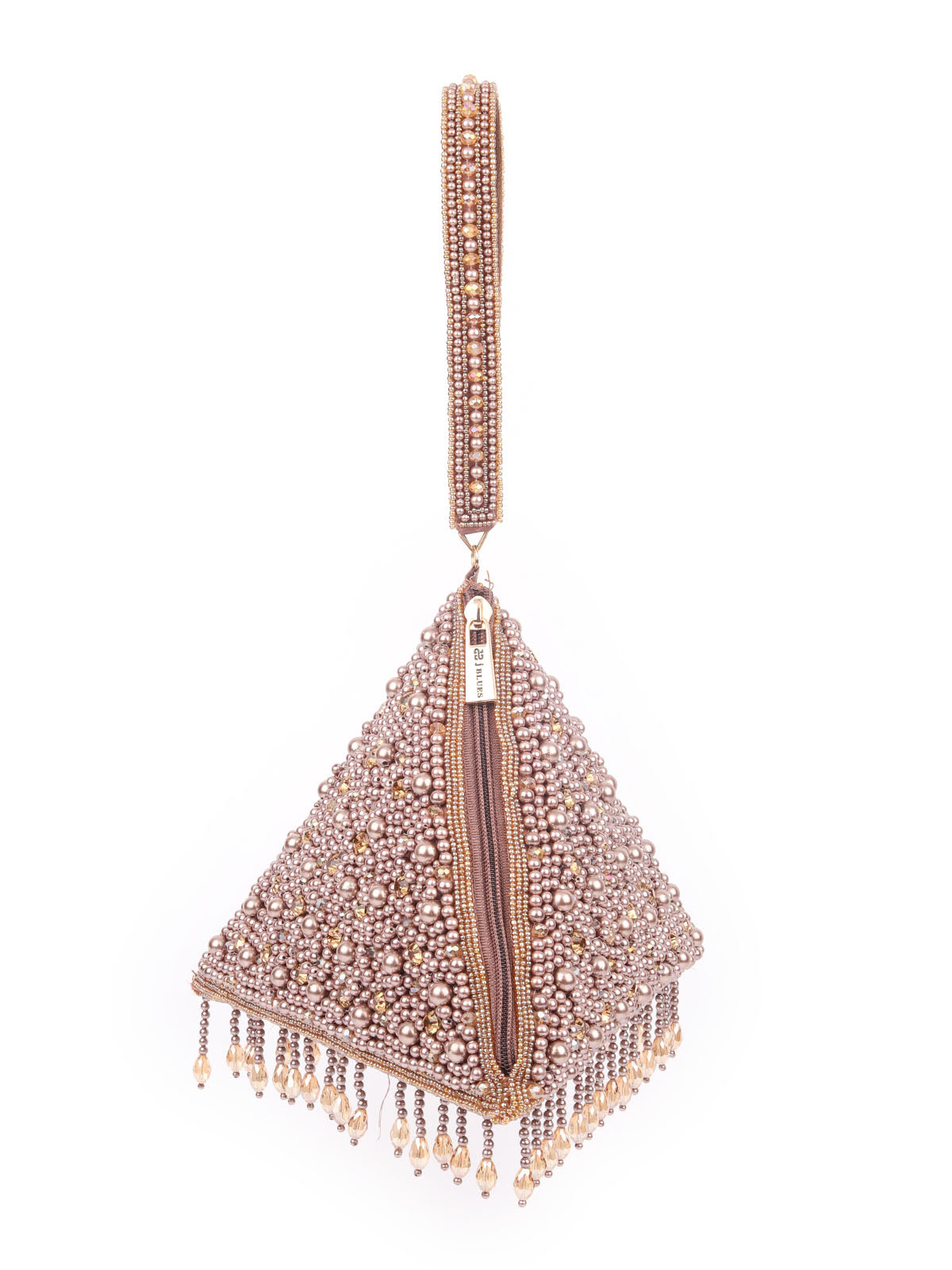 A captivating triangular bag, intricately adorned with exquisite beads and shimmering stones, exuding a refined western charm. Its unique silhouette and artistic detailing make it a perfect blend of elegance and contemporary style.
