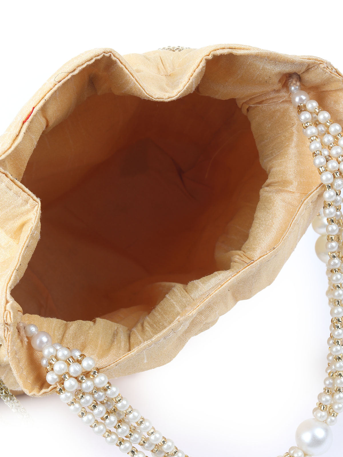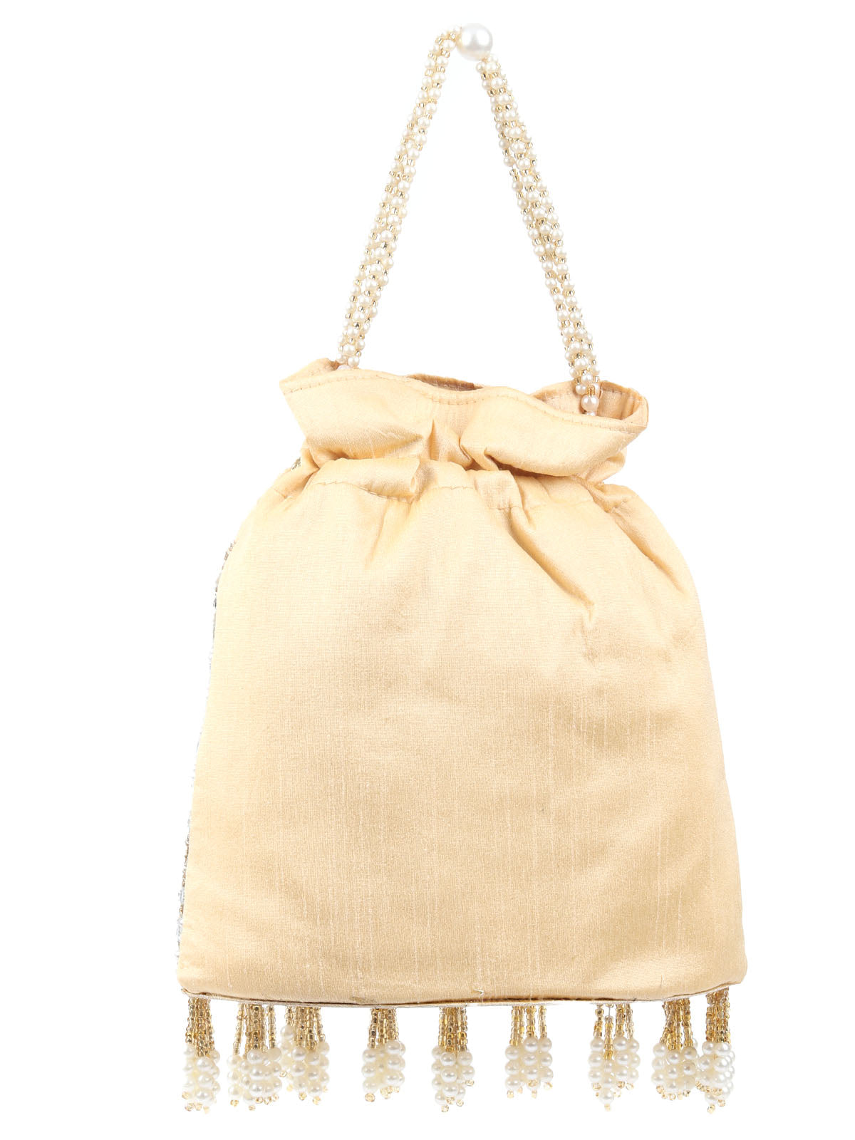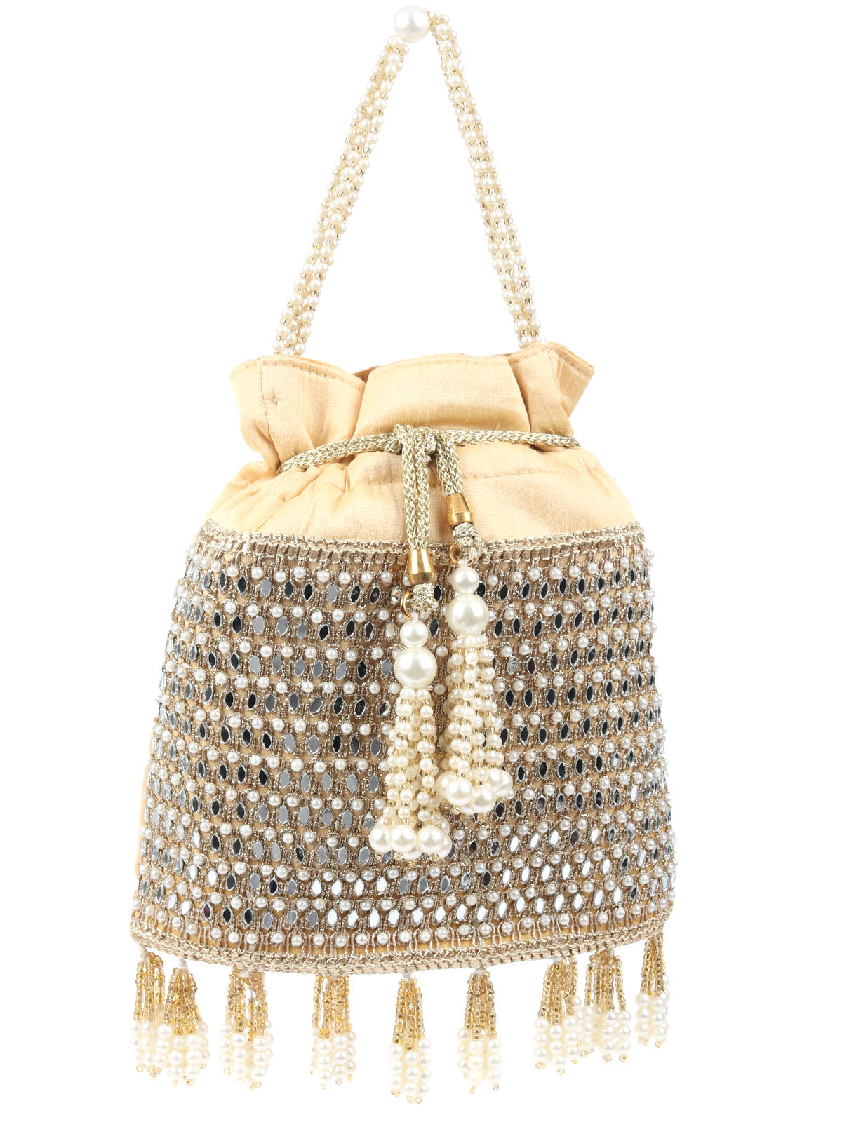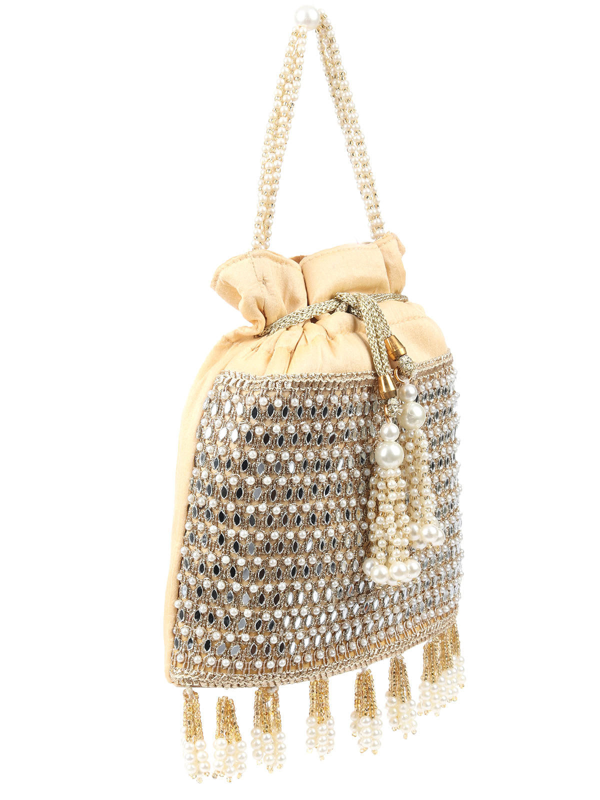 A cream potli bag adorned with shimmering mirror pieces and delicate beads, featuring elegant tassels and a beaded wrist loop for a touch of grace and charm. Perfect for festive and ethnic occasions!