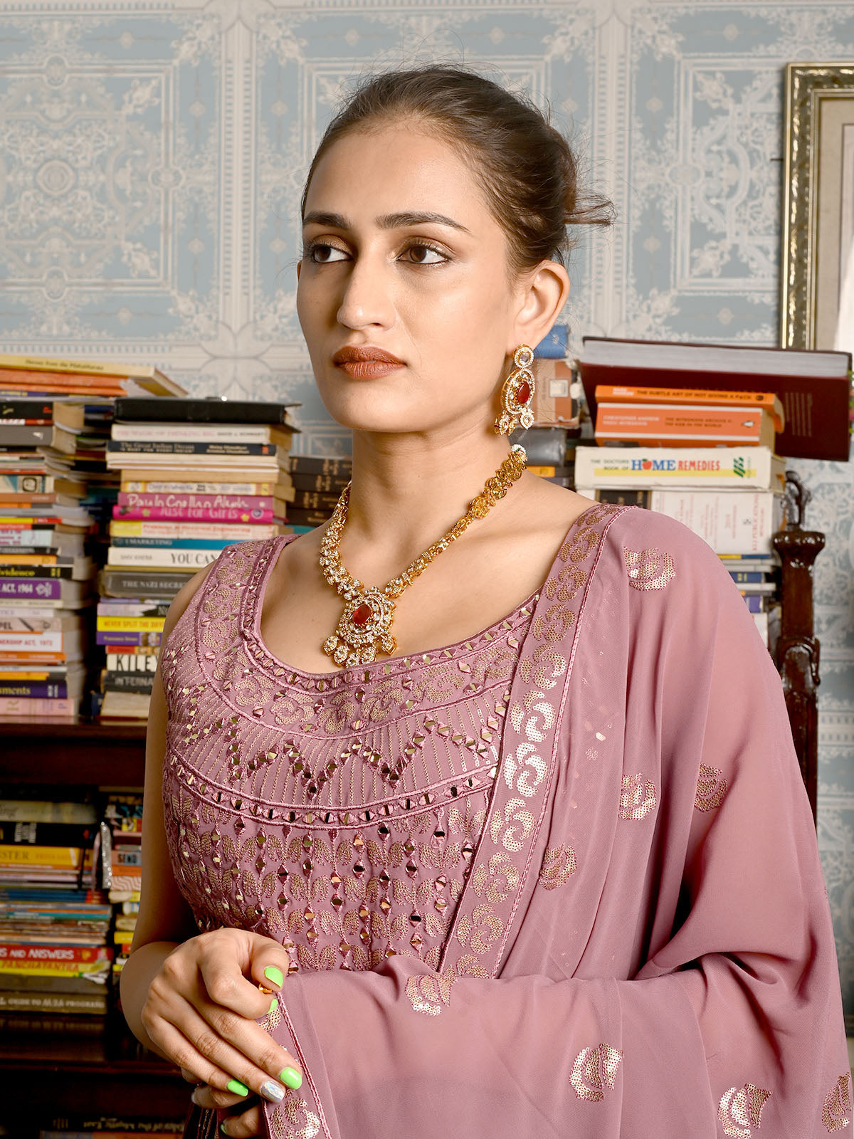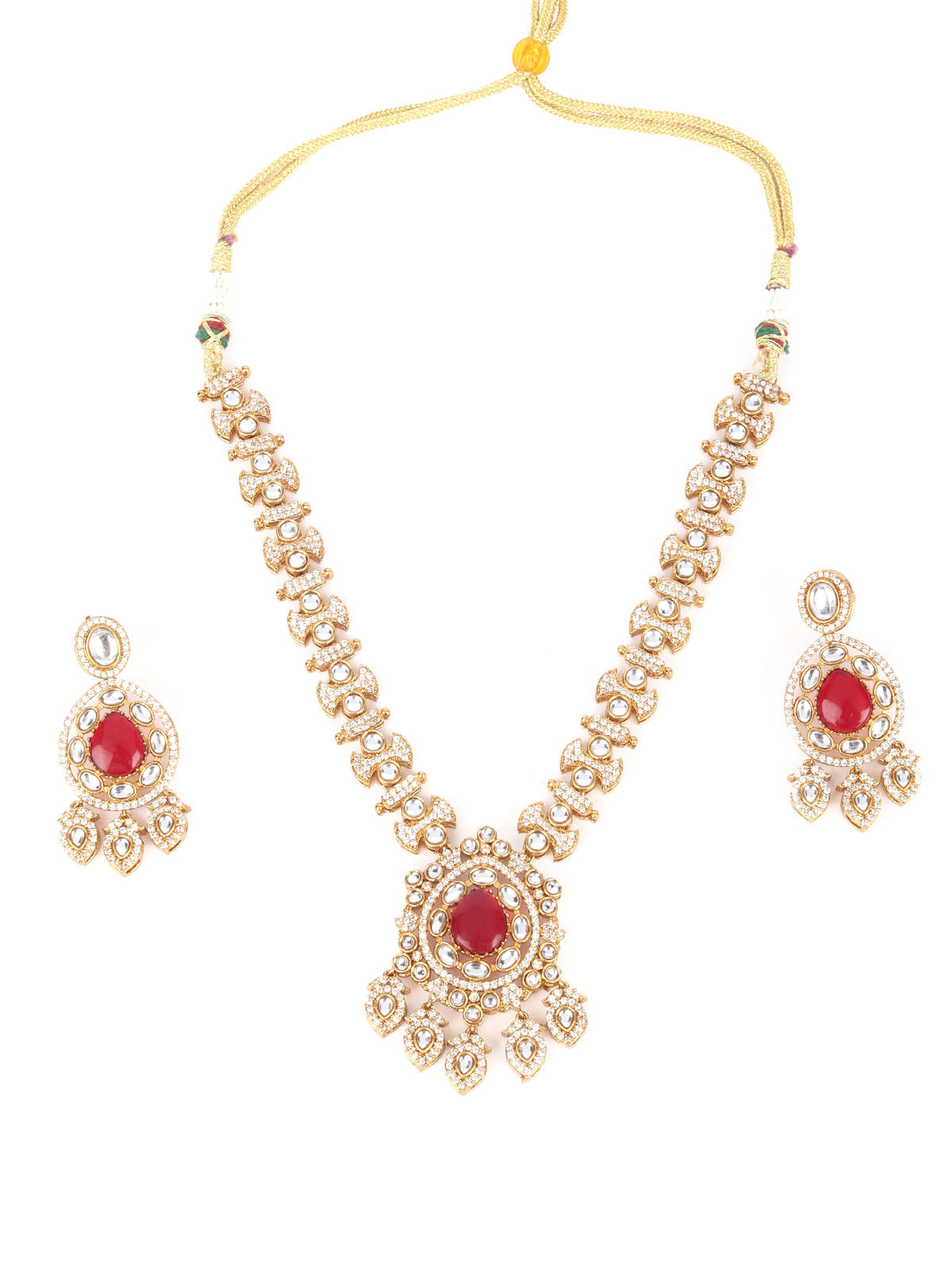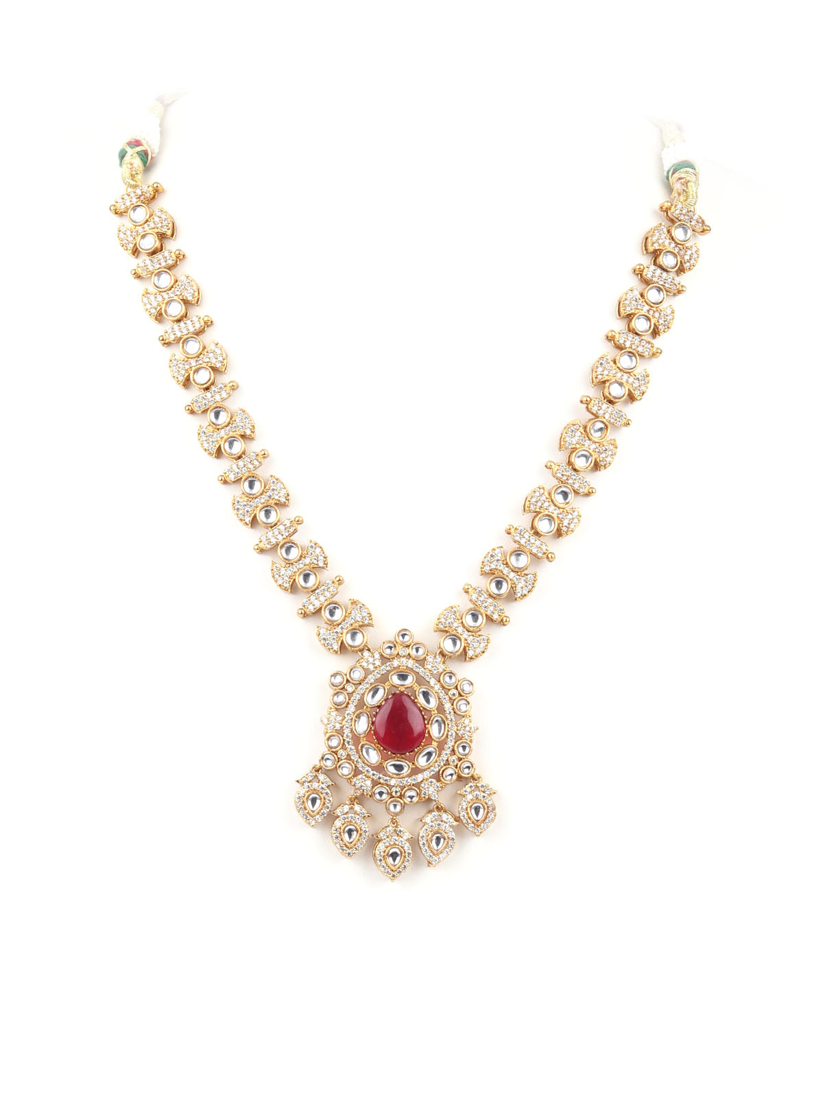 Golden neckpiece with intricate white faux stone studded design. Red Stone is the beauty in this piece. Good for festive and bridal wear.