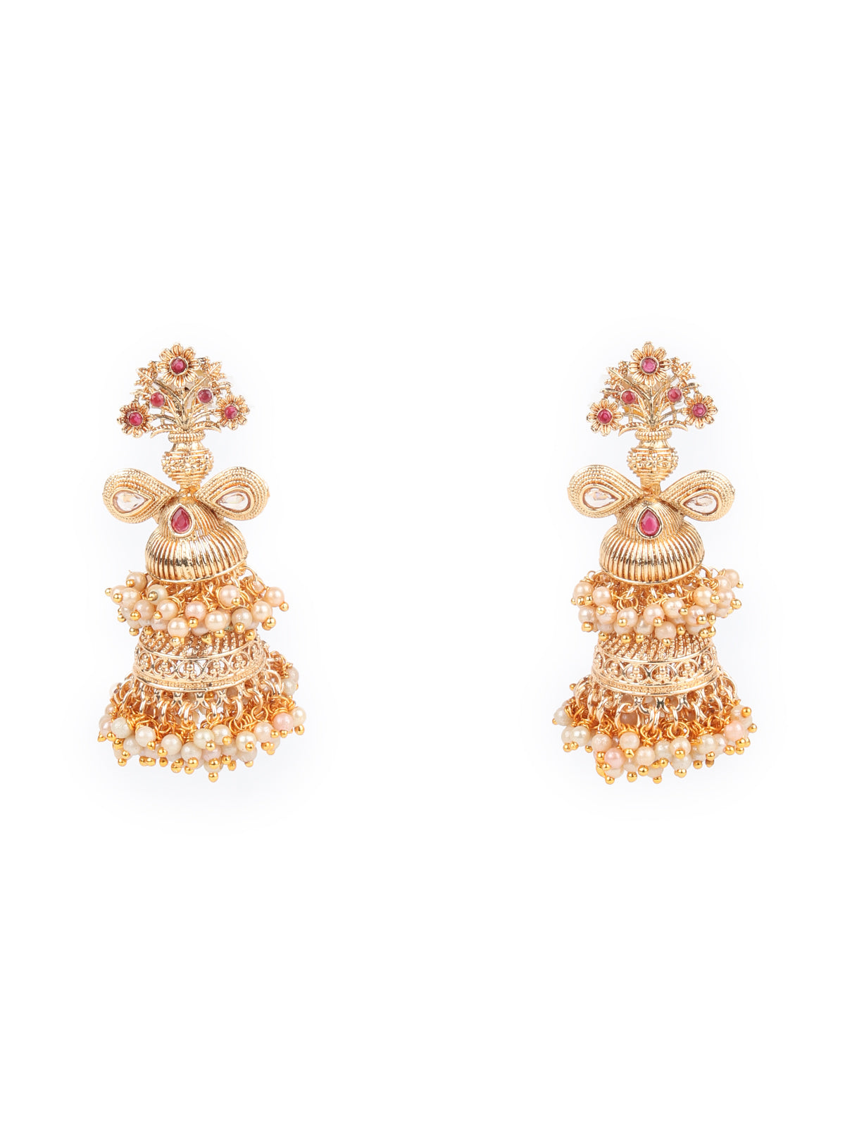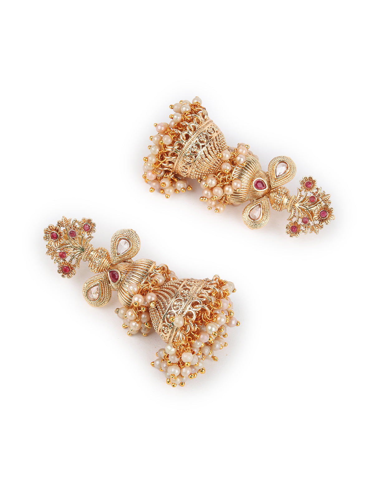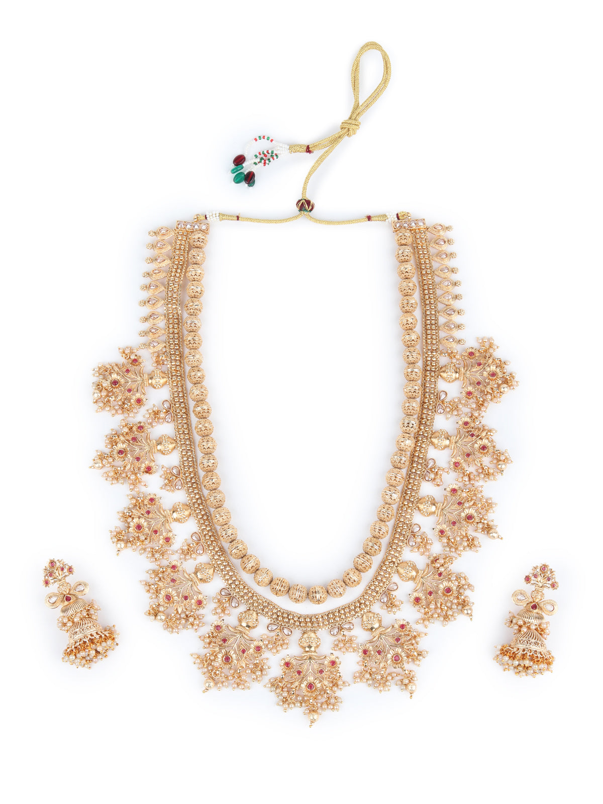 Indulge in ethnic allure with Rajwada's Gold Pearl & Faux Stone Jewelry Set, a masterpiece of traditional Indian craftsmanship for women's timeless elegance.