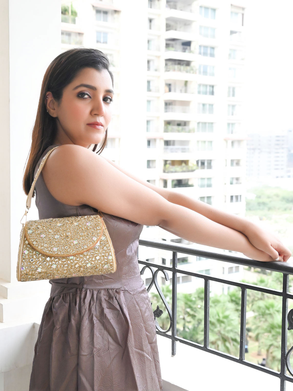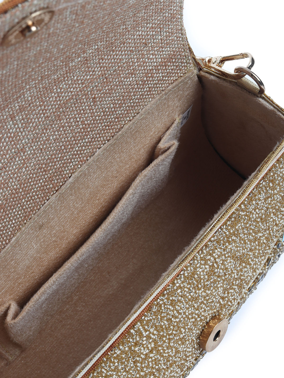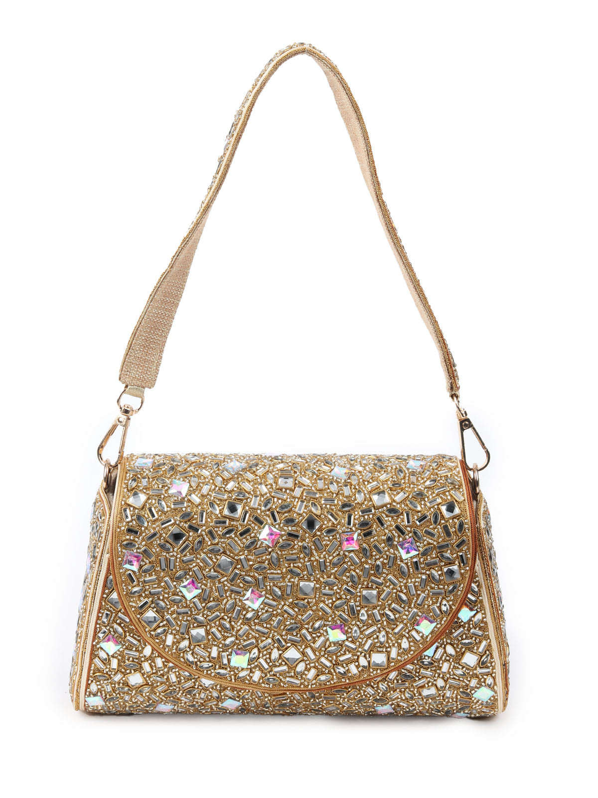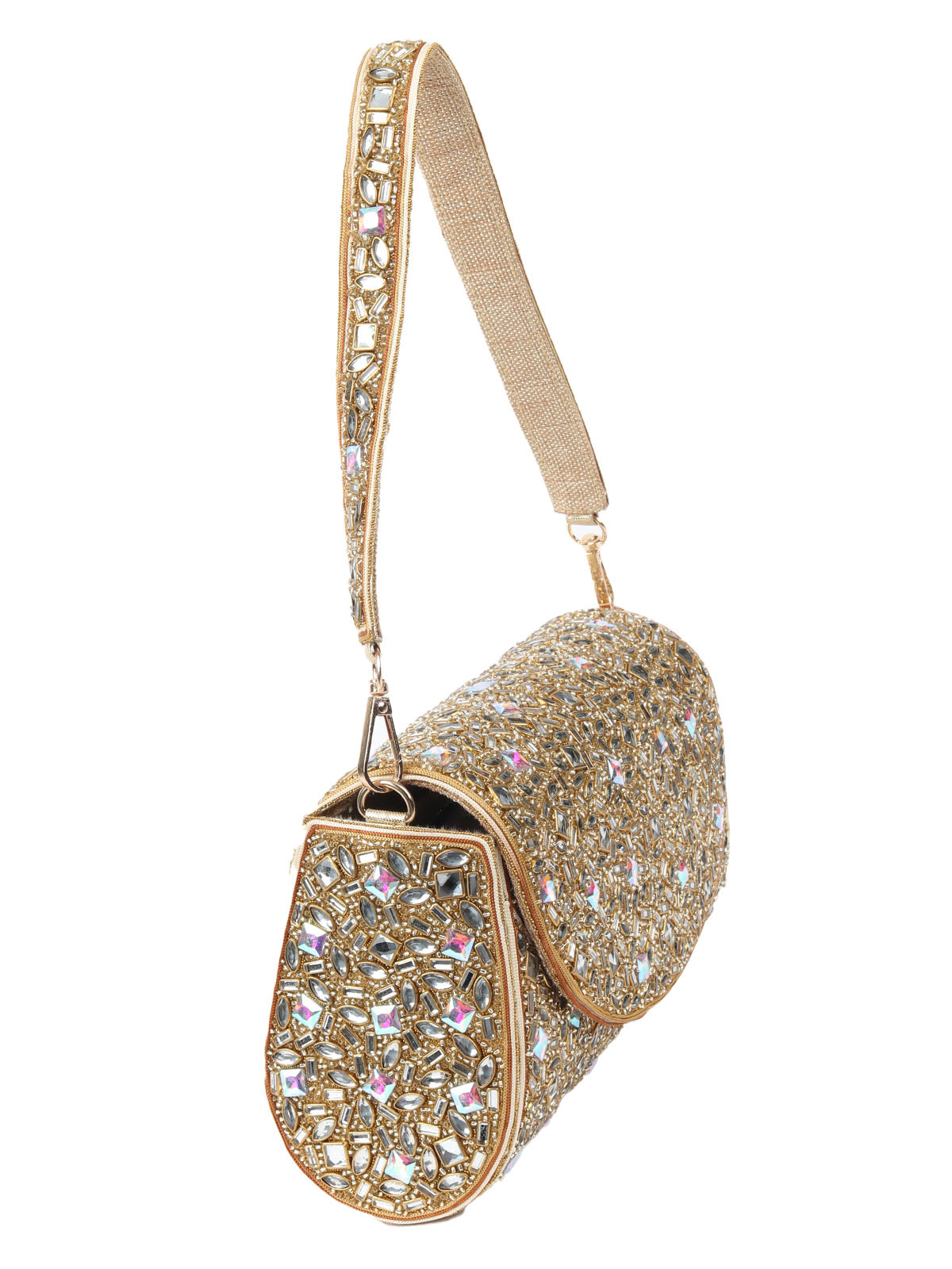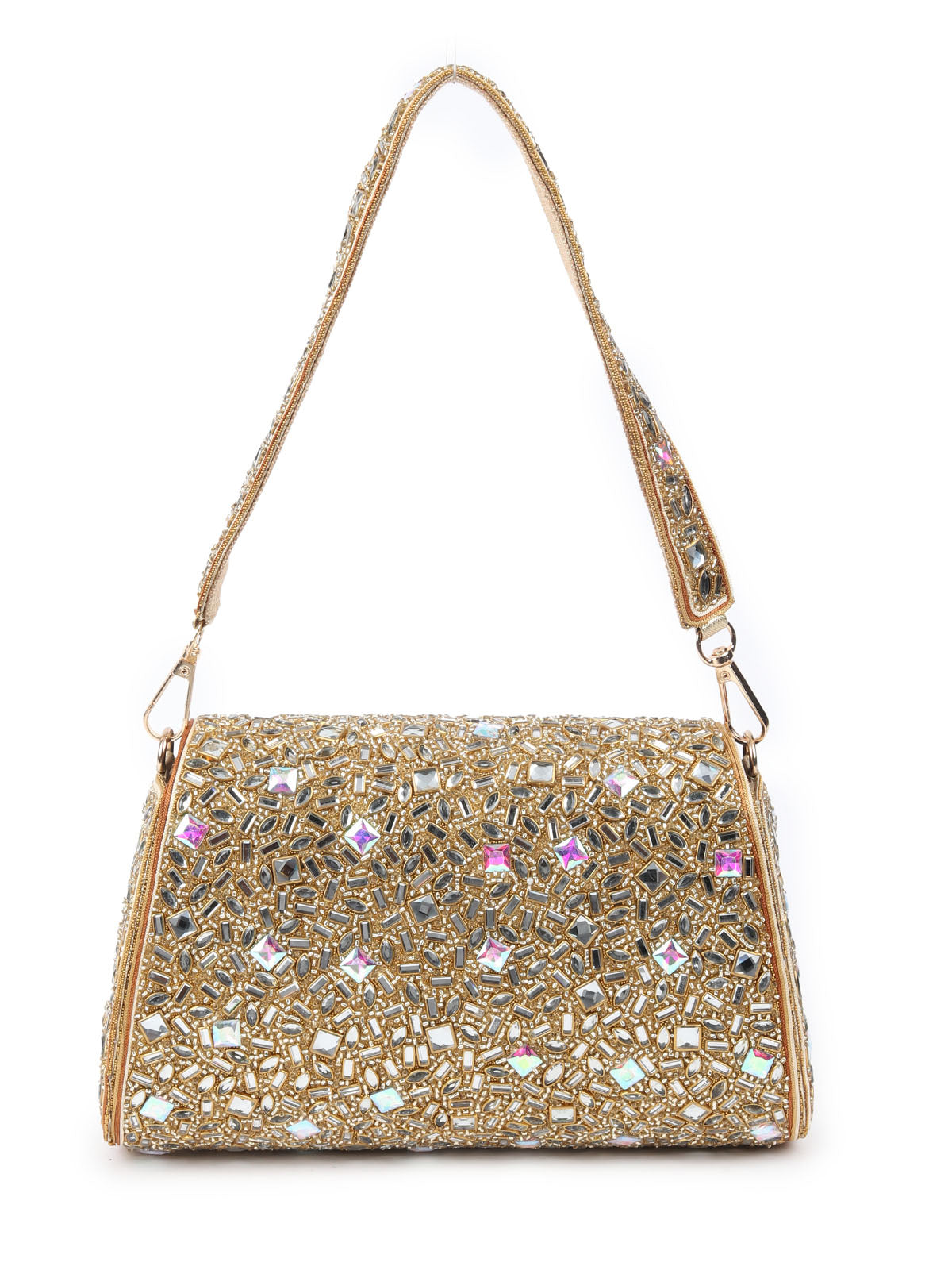 A Dazzling golden handbag, adorned with exquisite stones and intricate, heavy royal craftsmanship. Its mesmerizing design radiates luxury and elegance, making it a truly captivating accessory.