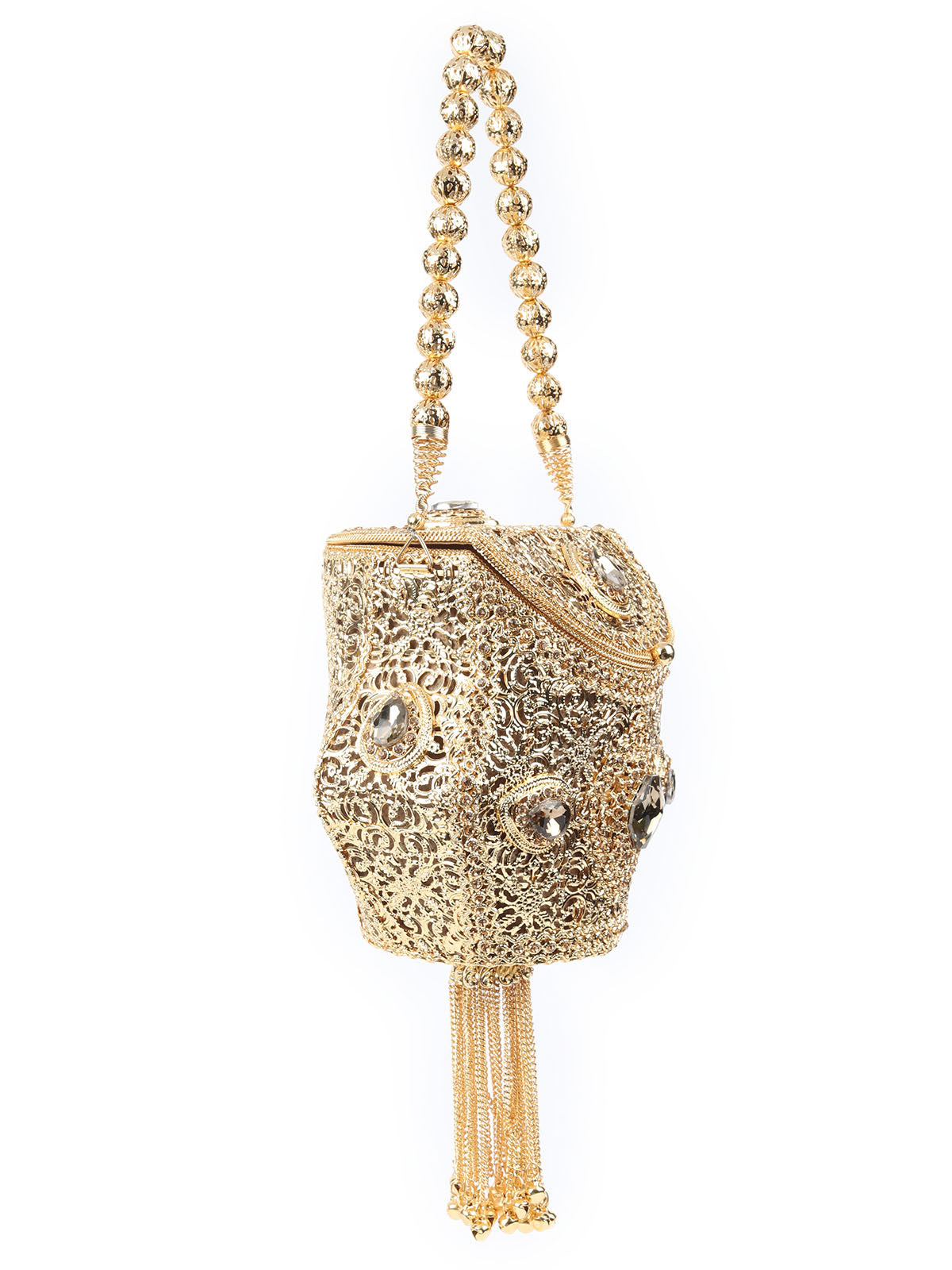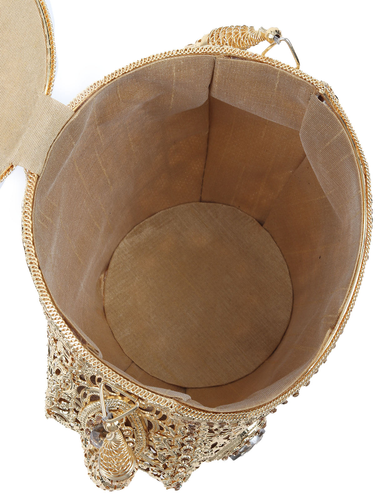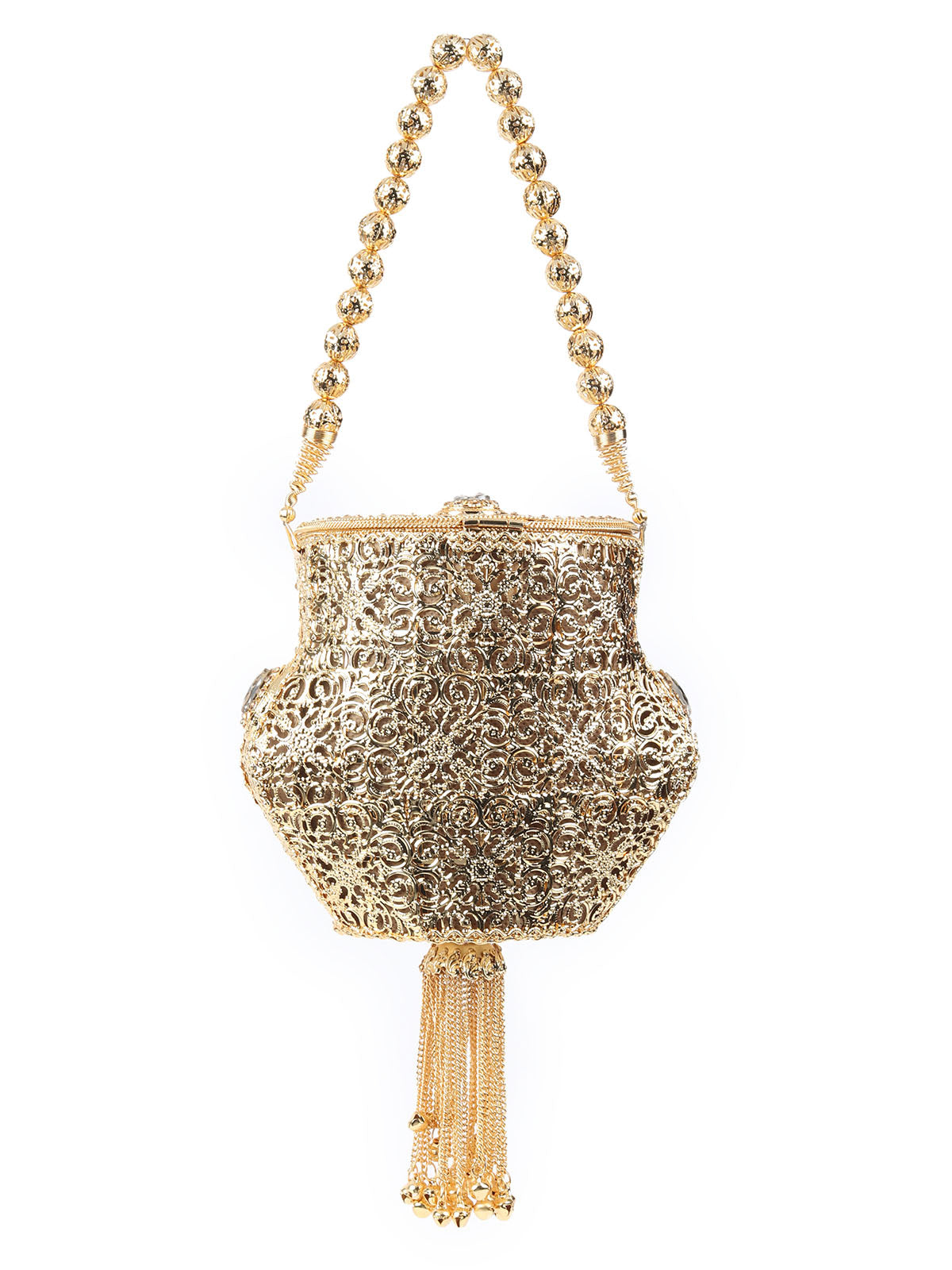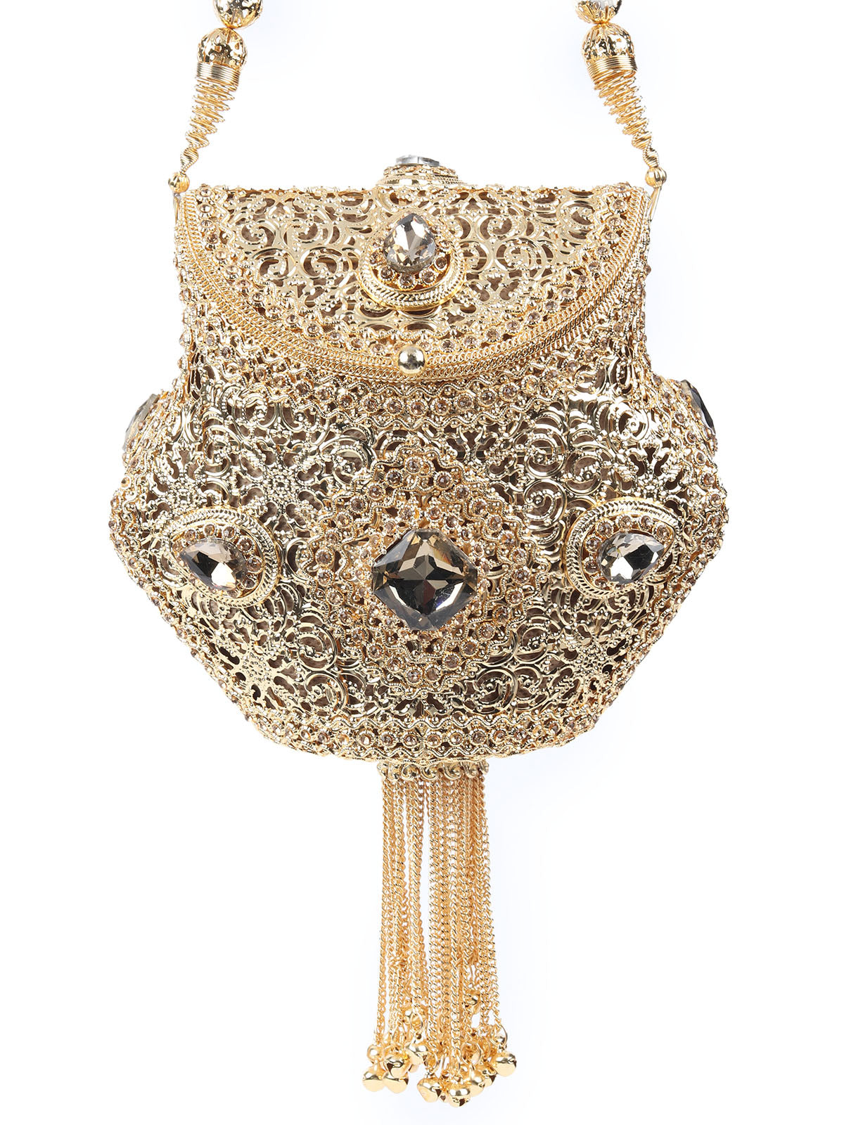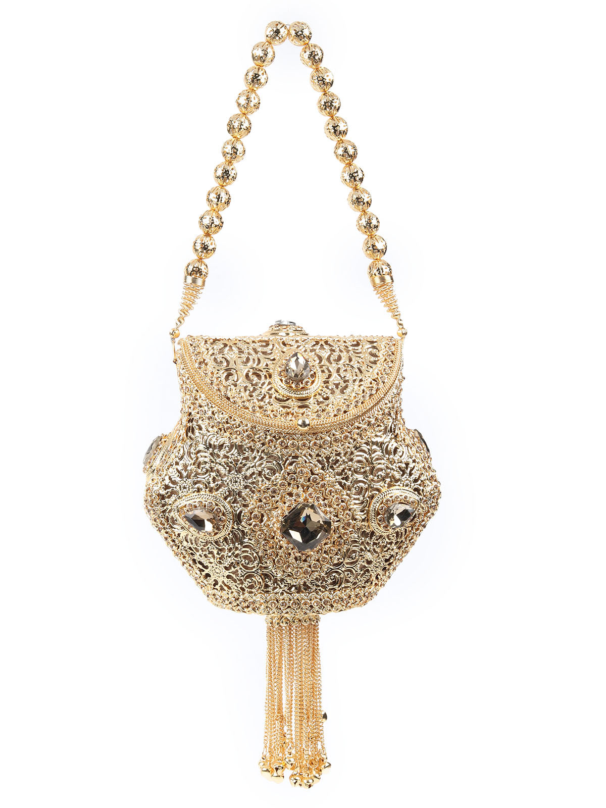 Elevate your style with this exquisite pure metal handbag in a rich golden hue. Featuring an opulent paisley design, this royal masterpiece exudes timeless elegance. The sleek flip opening adds a touch of sophistication, while the beautifully crafted wristband ensures effortless grace. Perfect for special occasions, this handbag is a statement of luxury and charm.