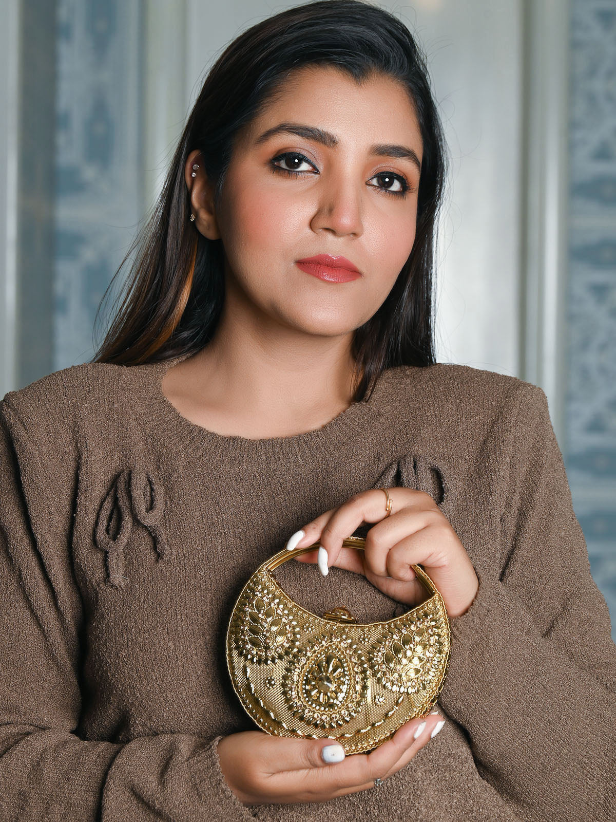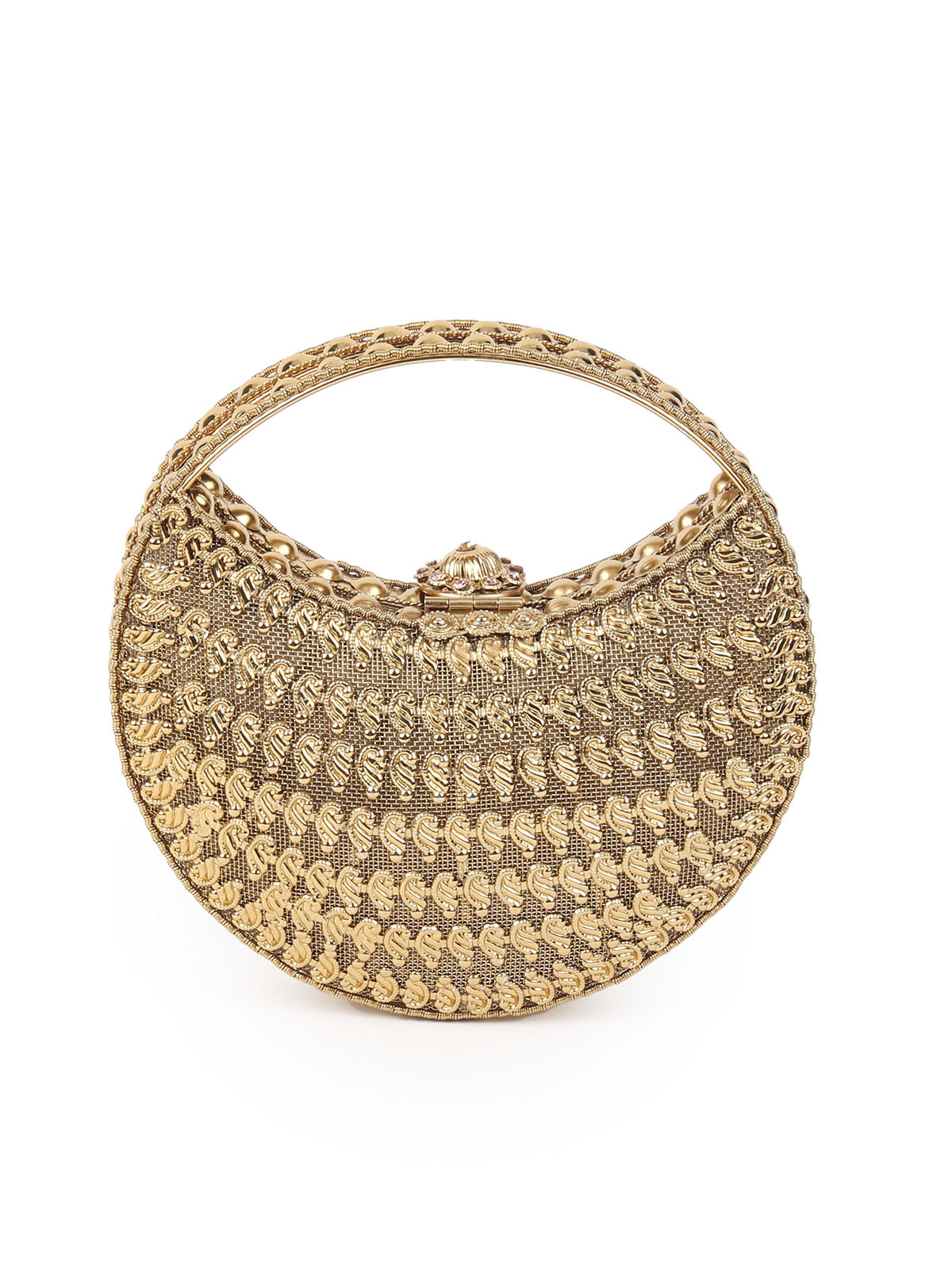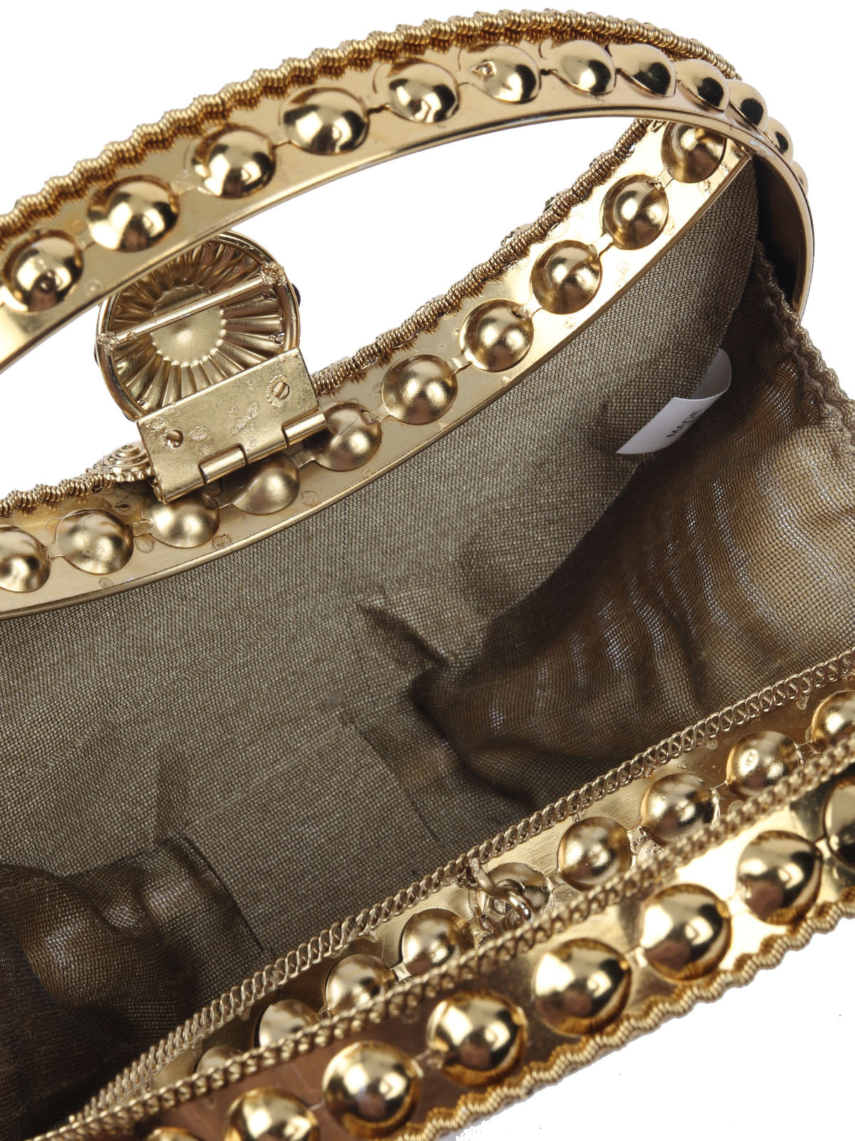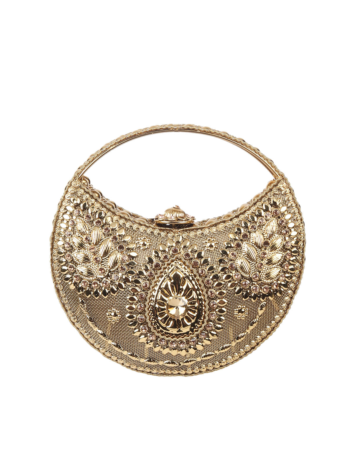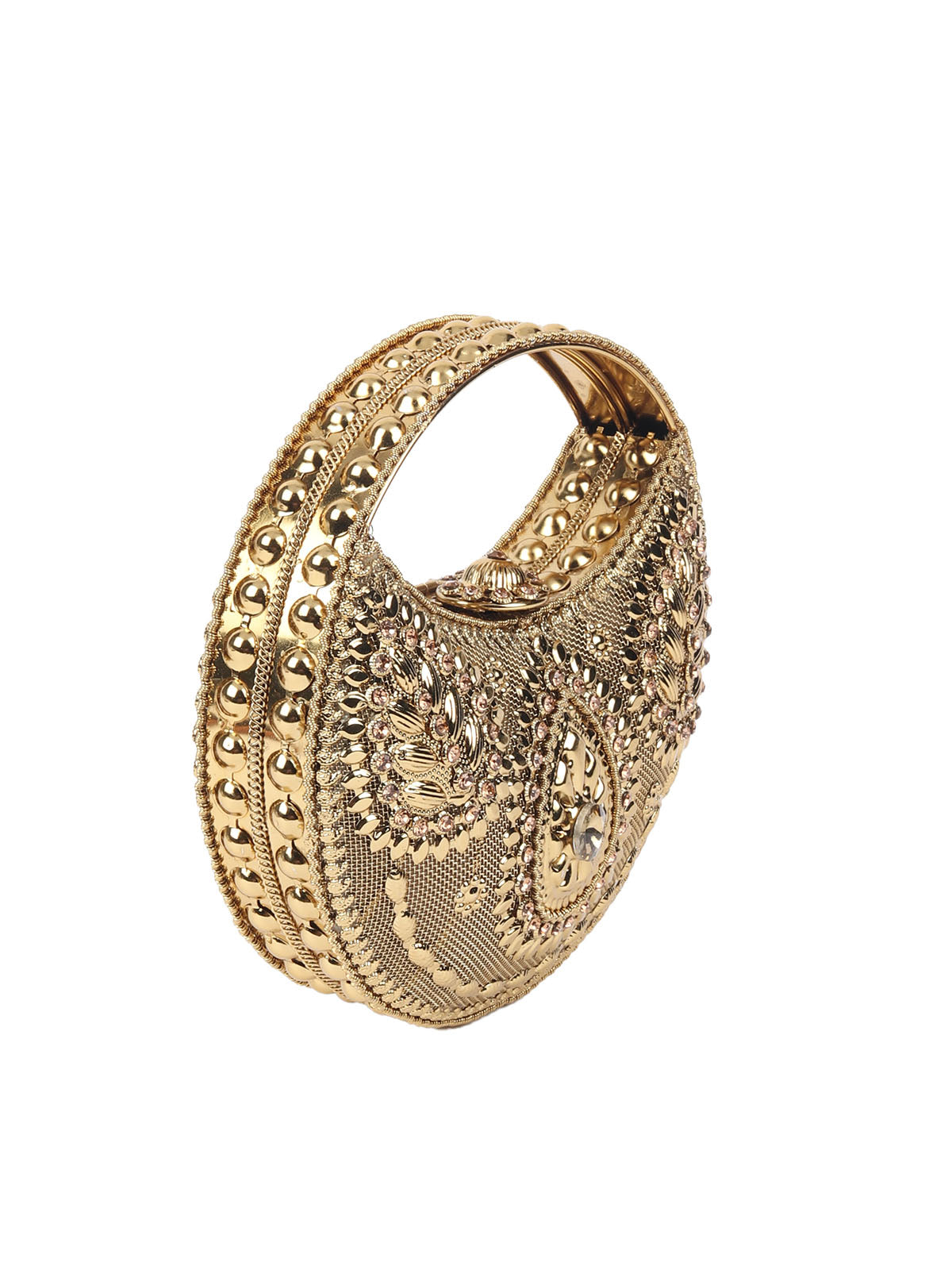 A stunning golden pure metal clutch bag featuring an exquisite design, adorned with dazzling stones for a luxurious and elegant look. Perfect for special occasions, it adds a touch of sophistication to any outfit.